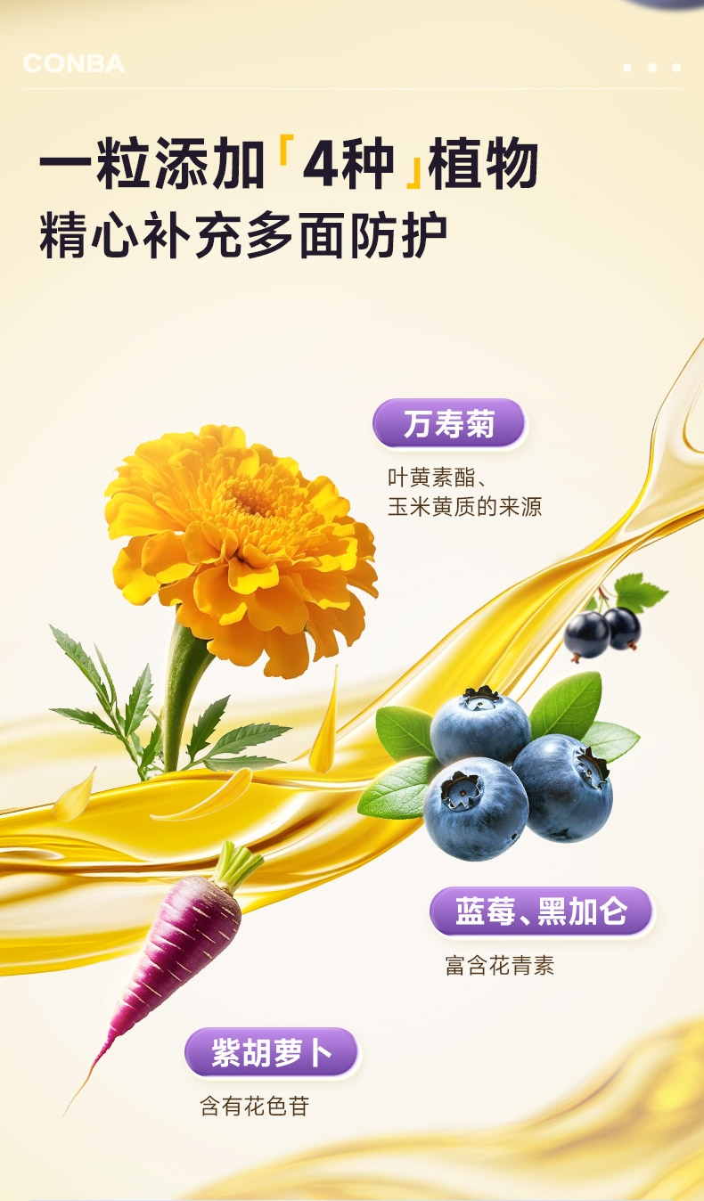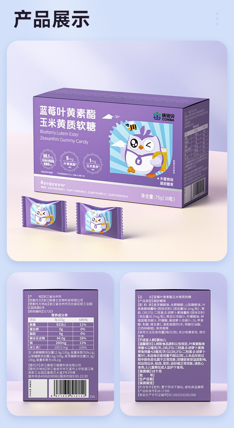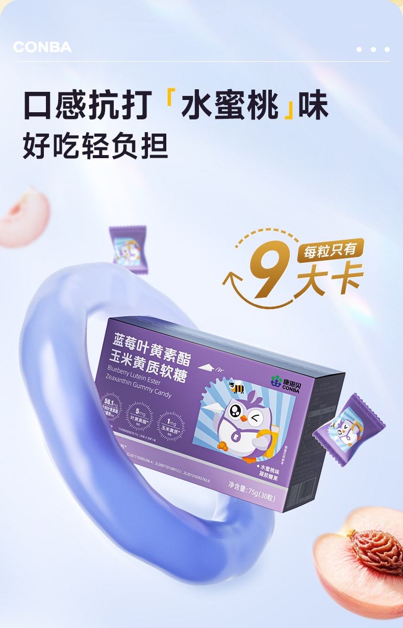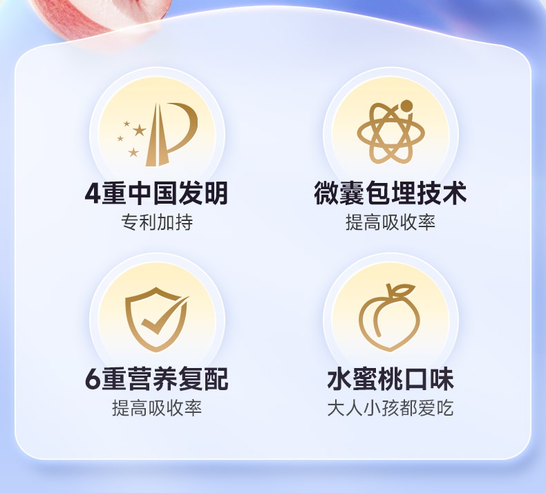 专利技术 营养好吸收 专利微米级稳定吸收;一粒添加4种植物 精心补充多面防护;口感抗打水蜜桃味 好吃轻负担