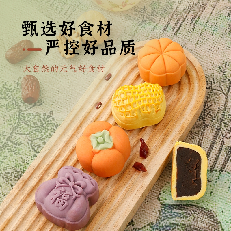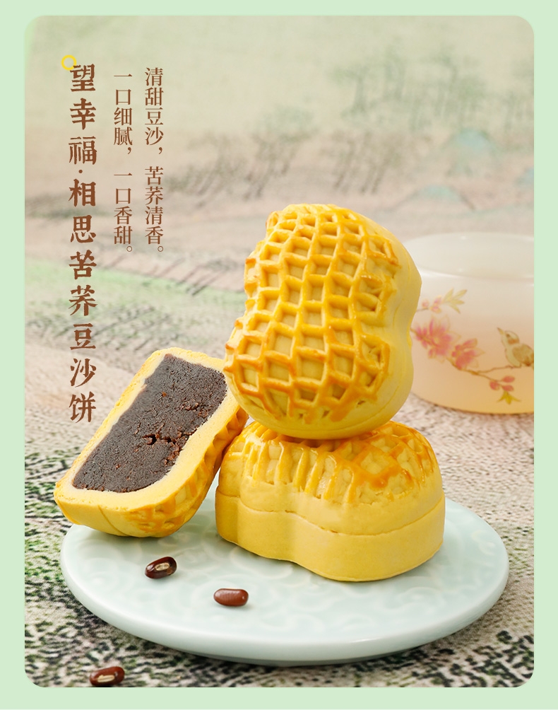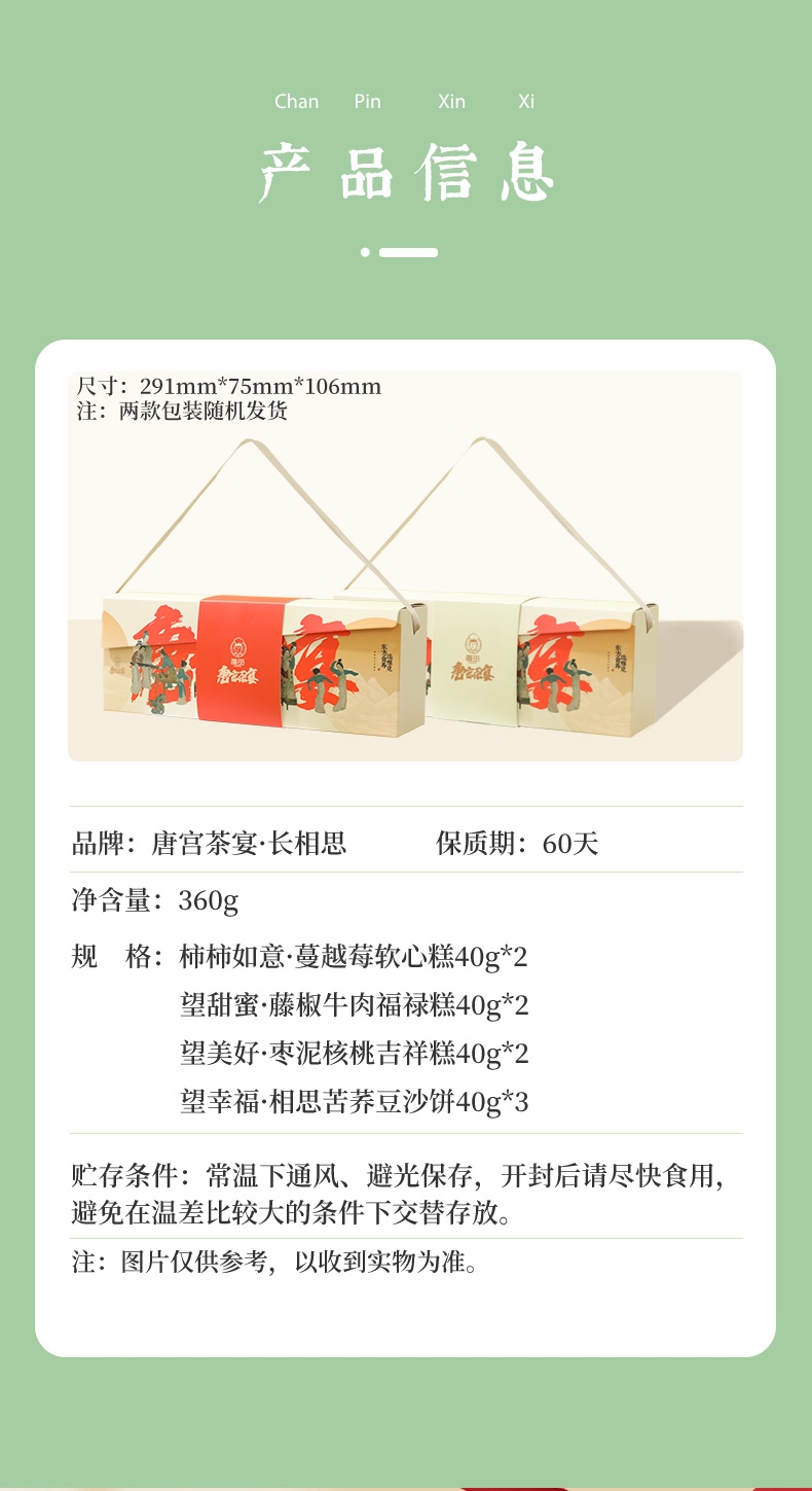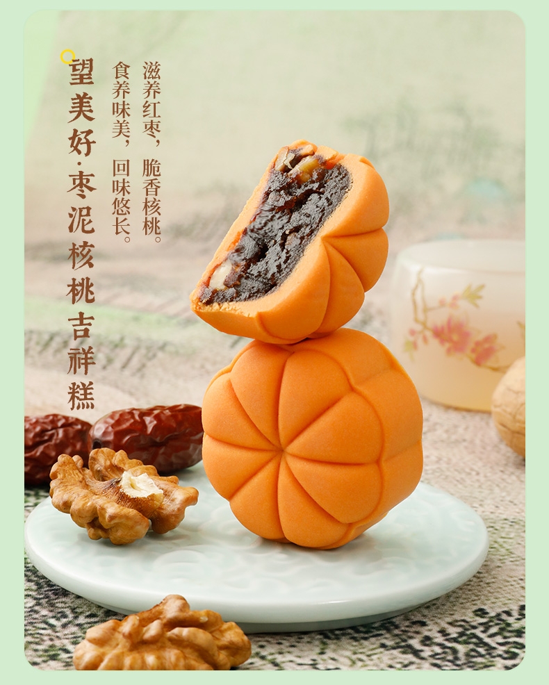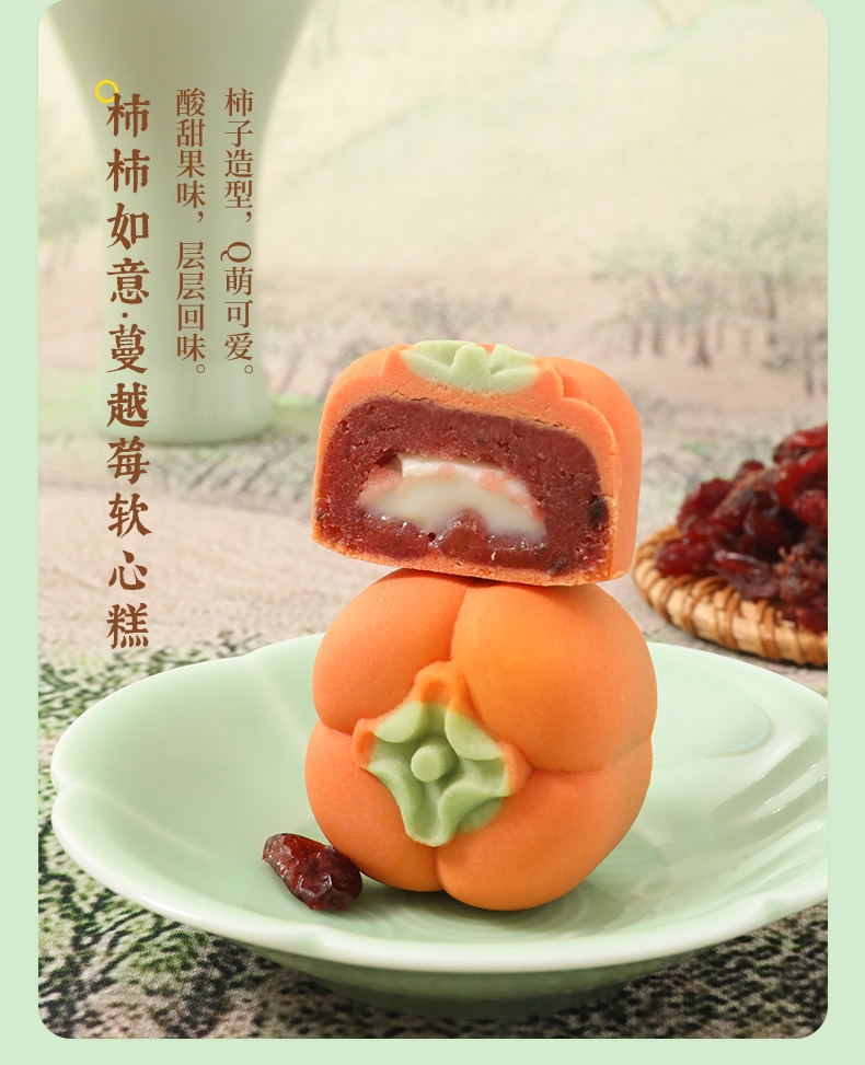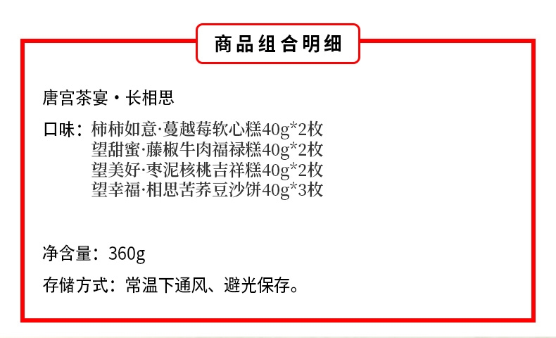 配置清单:柿柿如意·蔓越莓软心糕40g*2 望甜蜜·藤椒牛肉福禄糕40g*2 望美好·枣泥核桃吉祥糕40g*2 望幸福·相思苦荞豆沙饼40g*3