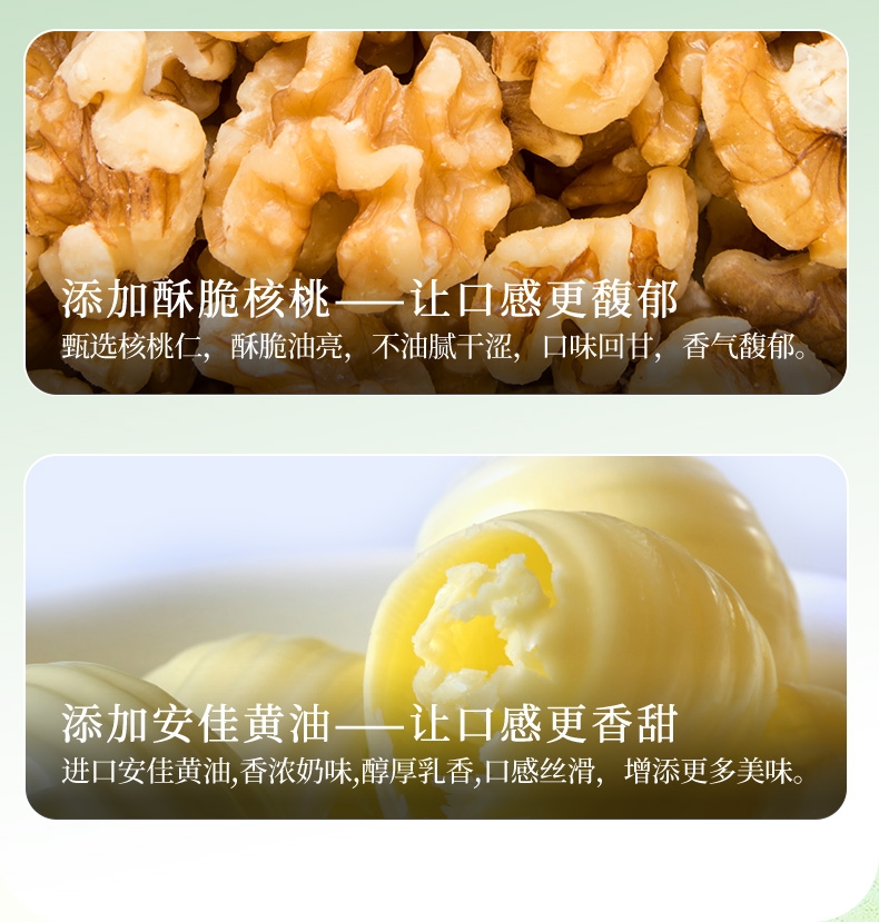 坚韧而饱满的果肉质地,自身独特的酸甜口味,清新爽口;甄选核桃仁,酥脆油亮,不油腻干涩,口味回甘,香气馥;进口安佳黄油,香浓奶味,醇厚乳香,口感丝滑,增添更
