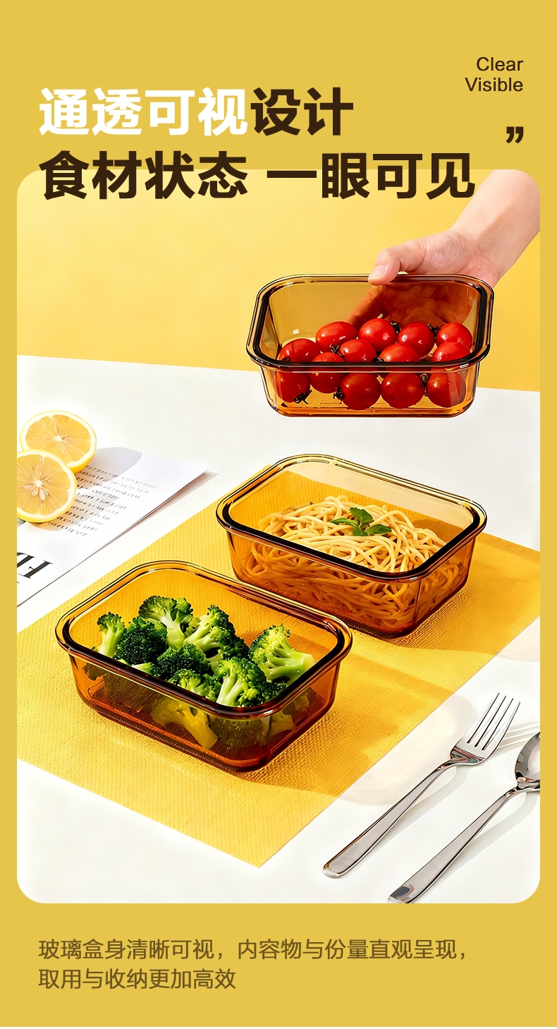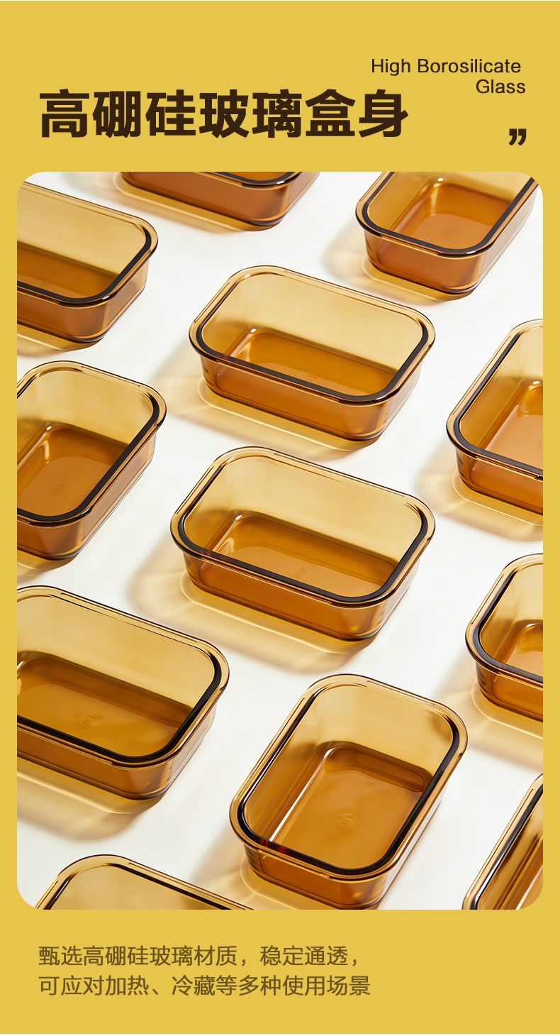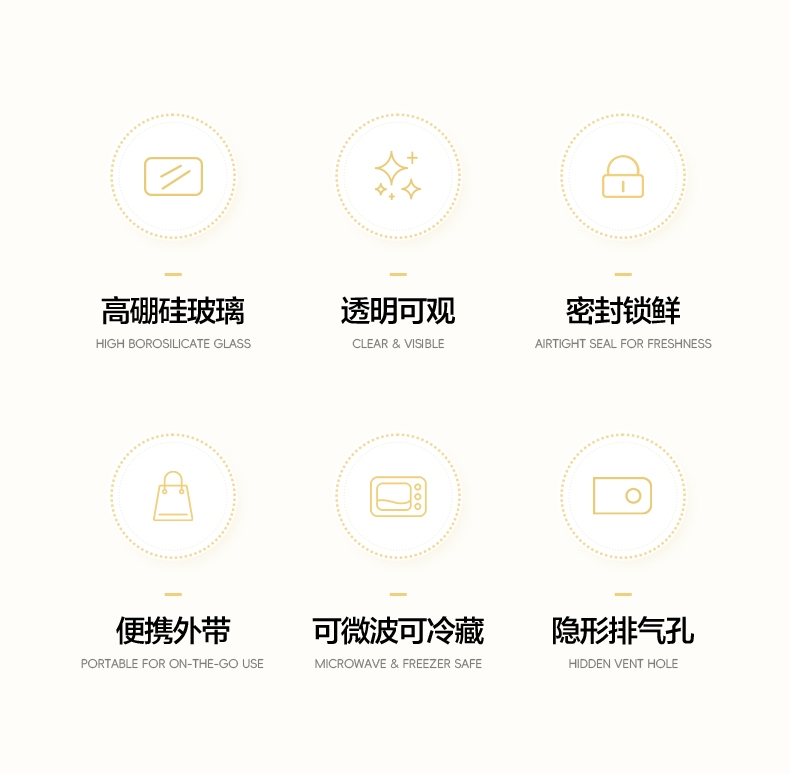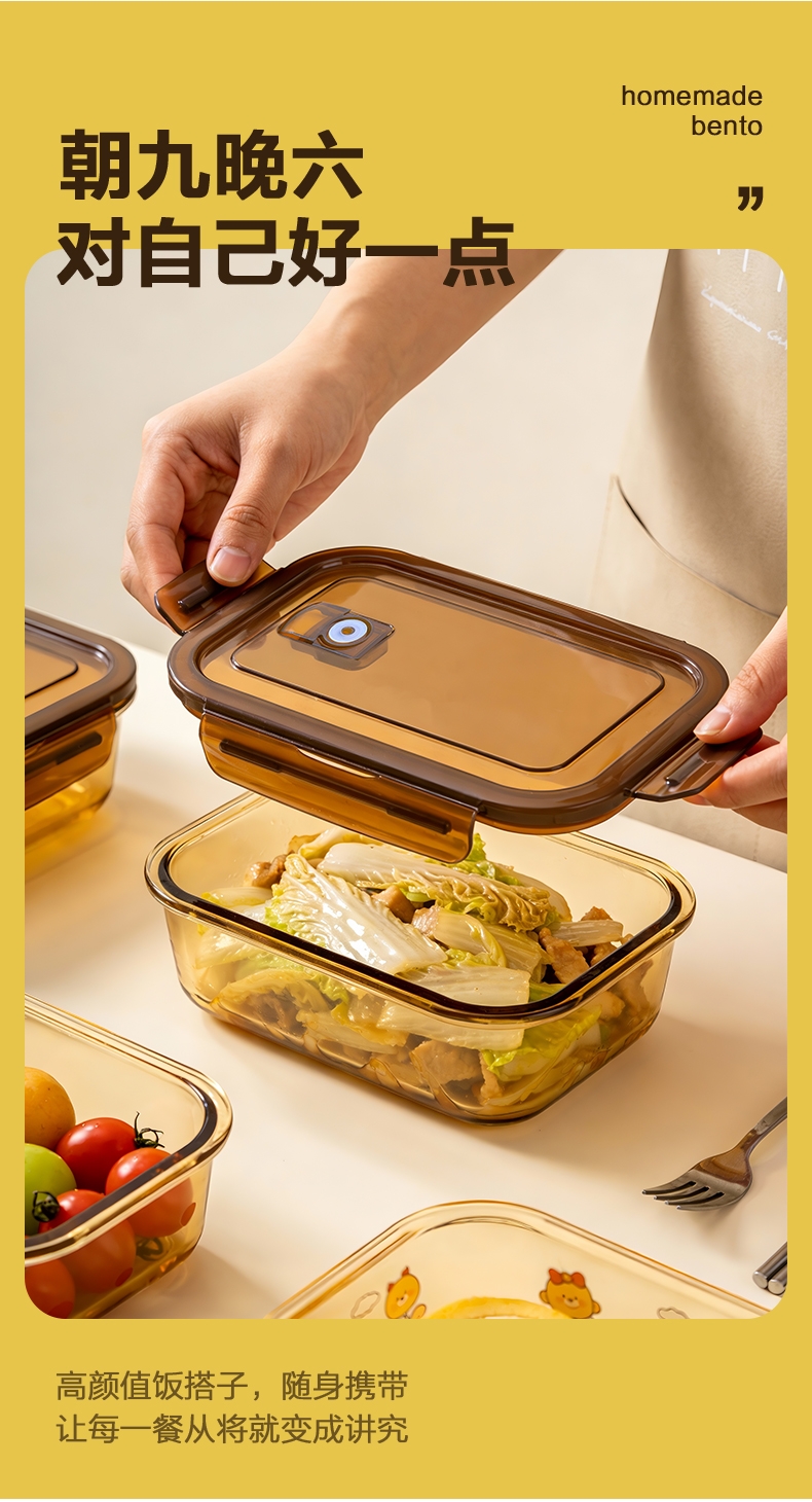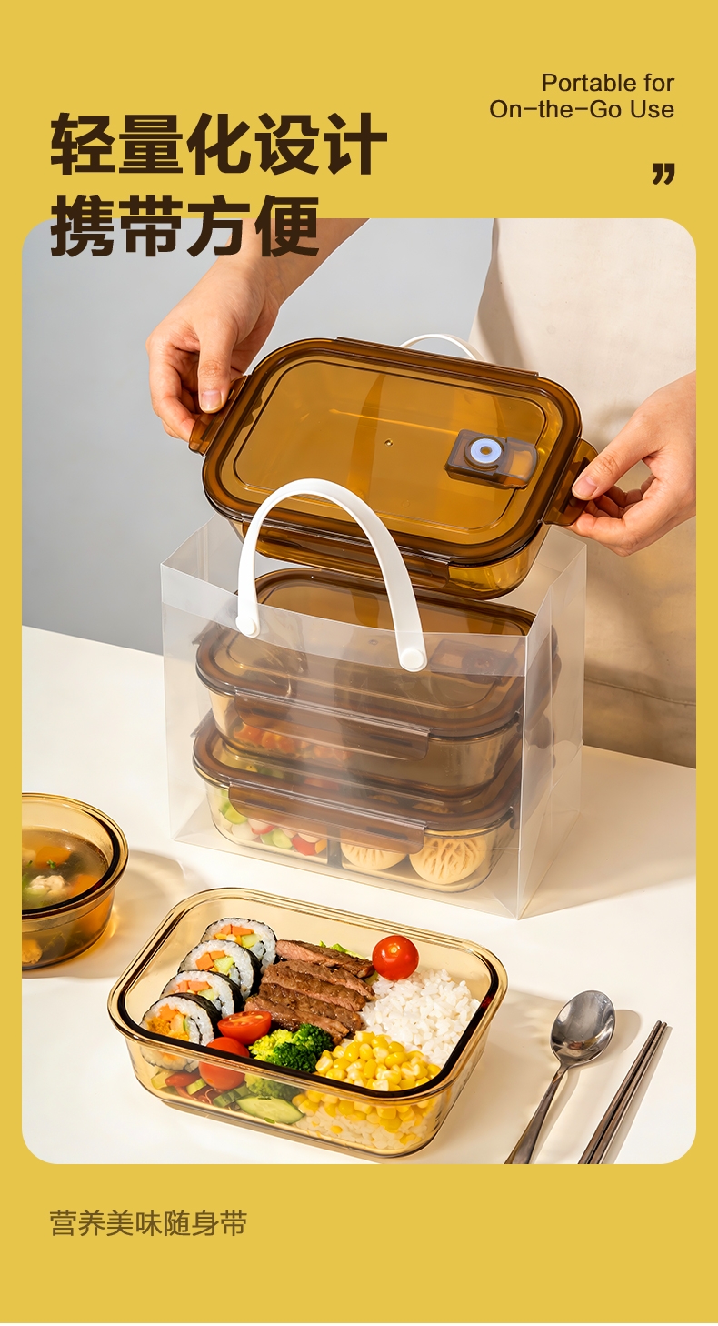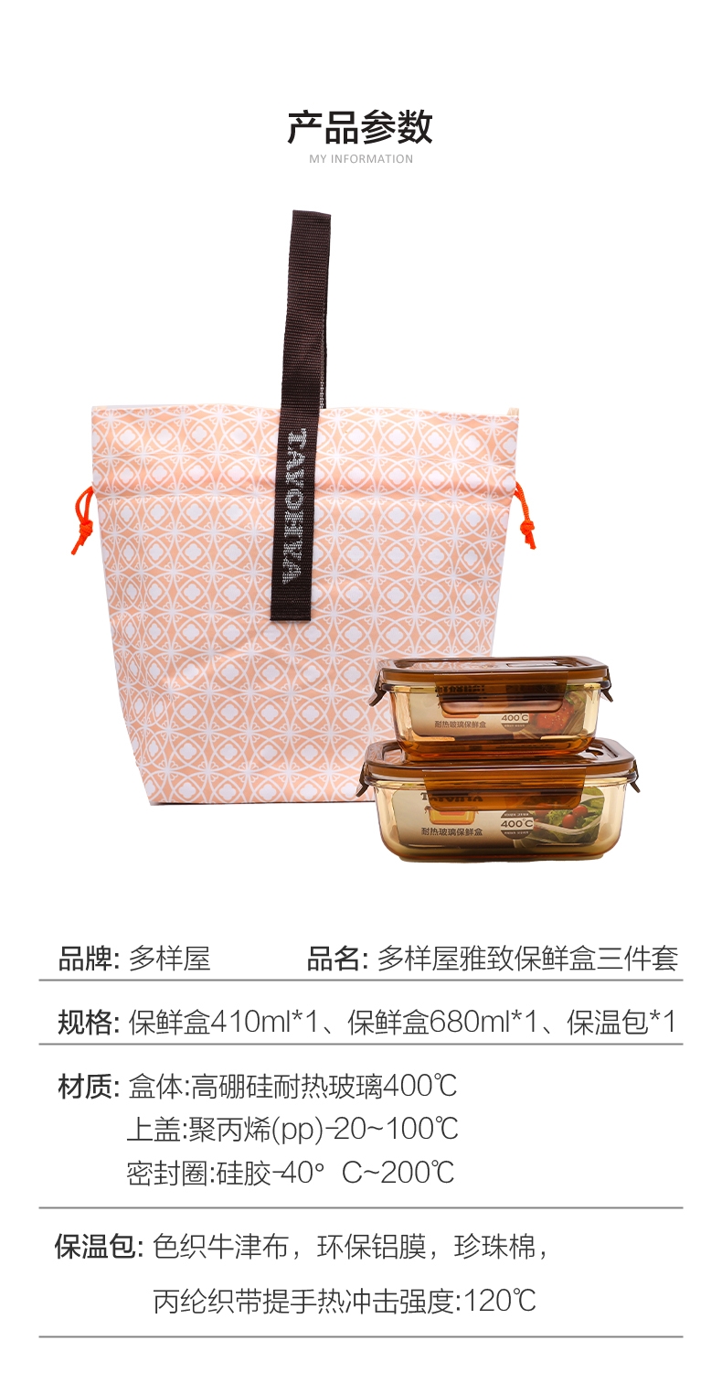 高硼硅玻璃材质,耐高温又易清洗;;多场景使用,从冰箱到微波炉,不串味;;上盖硅胶密封圈,防止外带食材汁水泄露;;时尚手提包,袋口可收缩,面料色泽亮丽;除了携带保鲜盒外,也可做多功能袋外出携带。