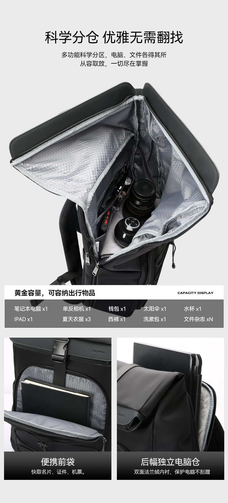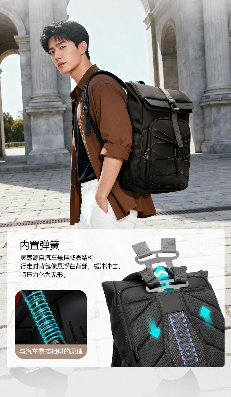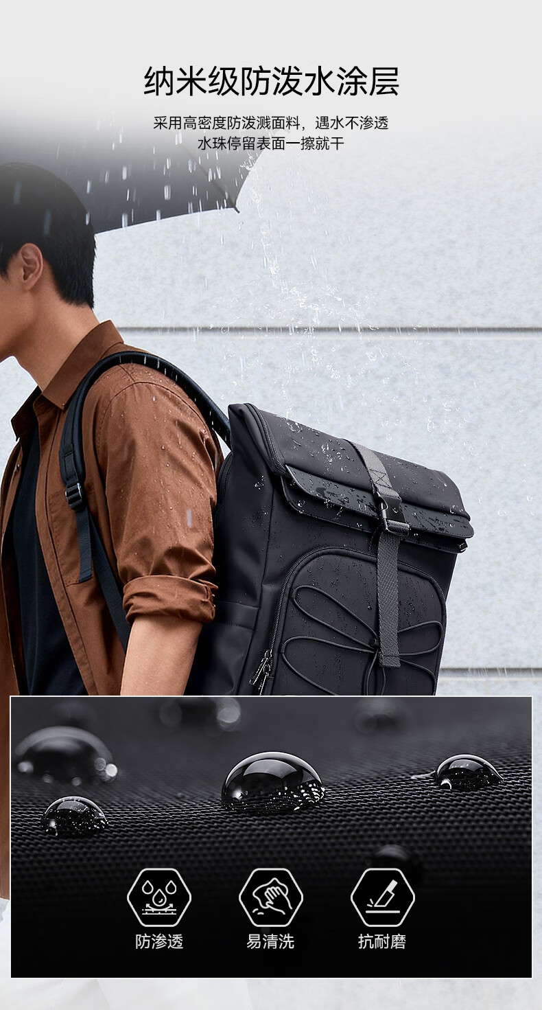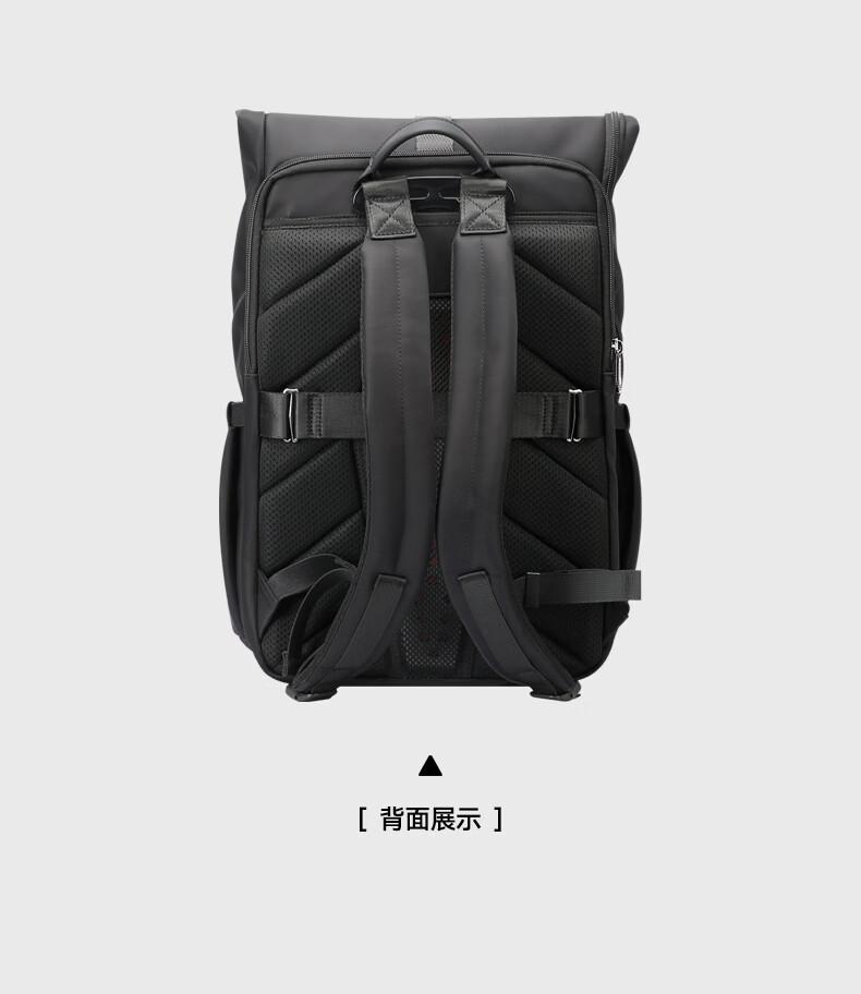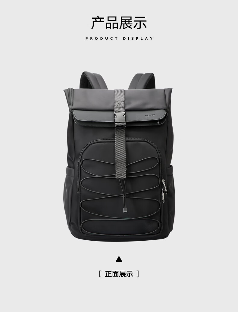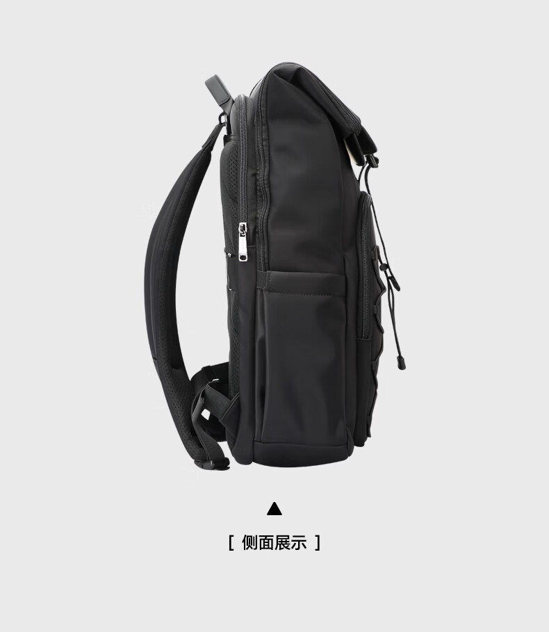 材质耐磨防泼水,包身大容量,抗震减压电脑位;插扣翻盖拉合式开袋,顶部卷顶式增容功能;背部内置弹簧系统减负减震,独立侧袋水杯位