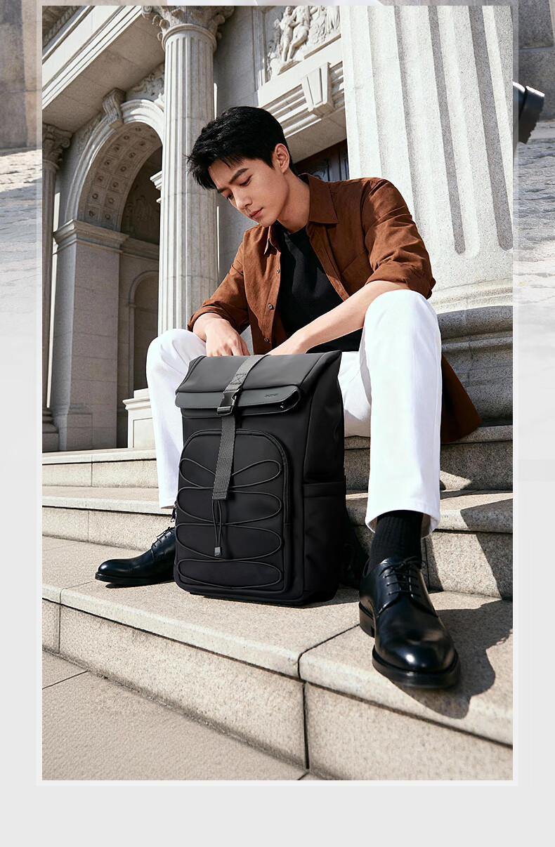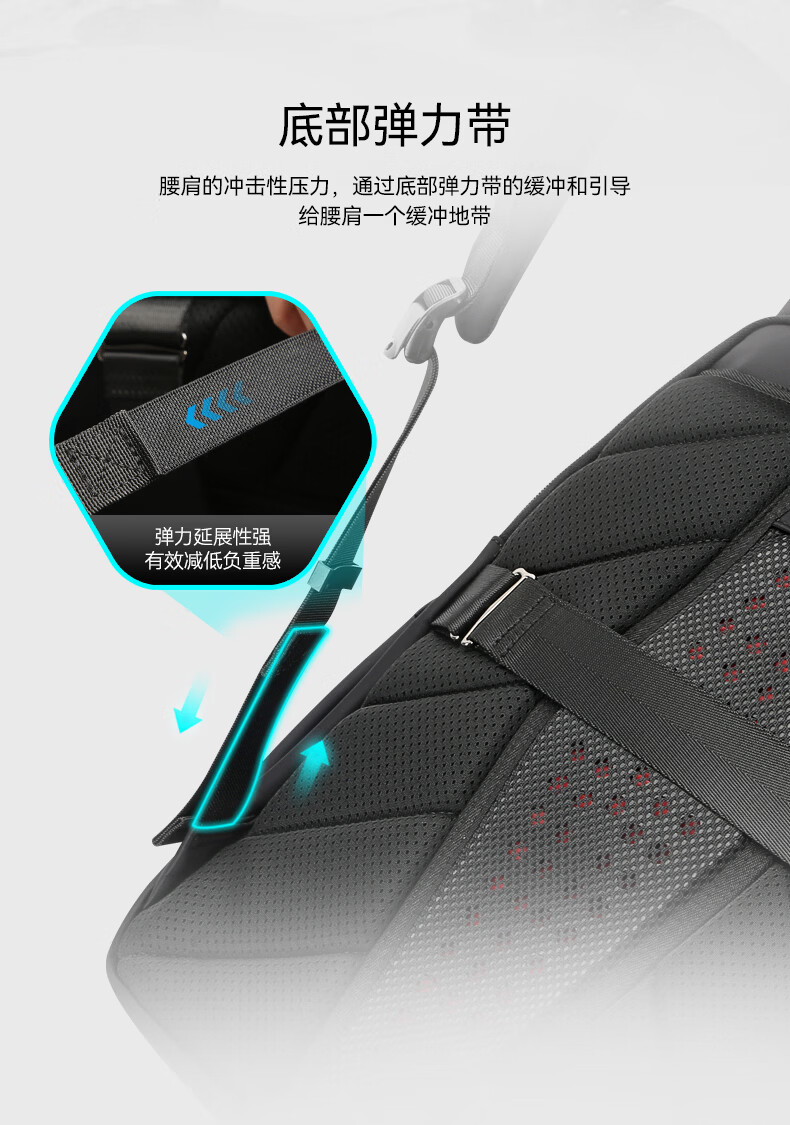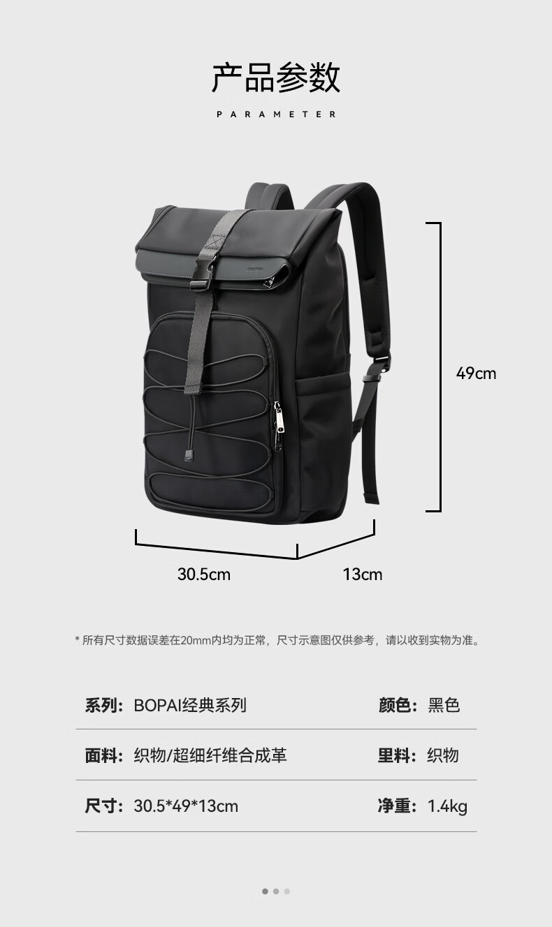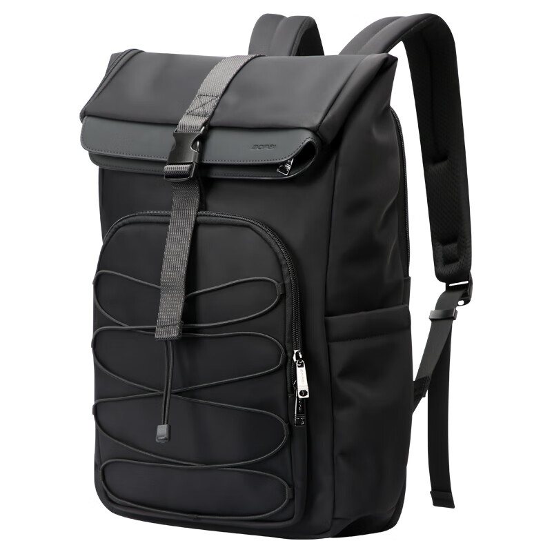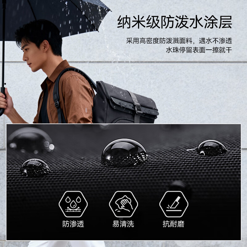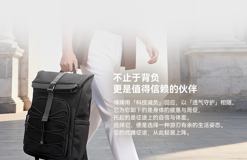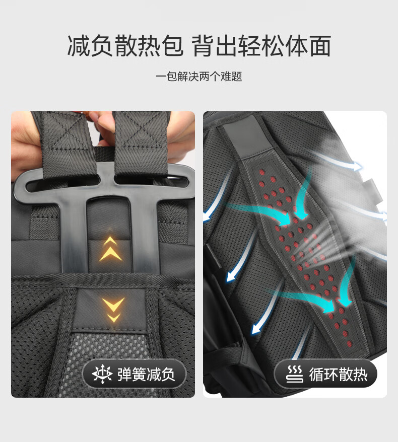 材质耐磨防泼水,包身大容量,抗震减压电脑位;插扣翻盖拉合式开袋,顶部卷顶式增容功能;背部内置弹簧系统减负减震,独立侧袋水杯位