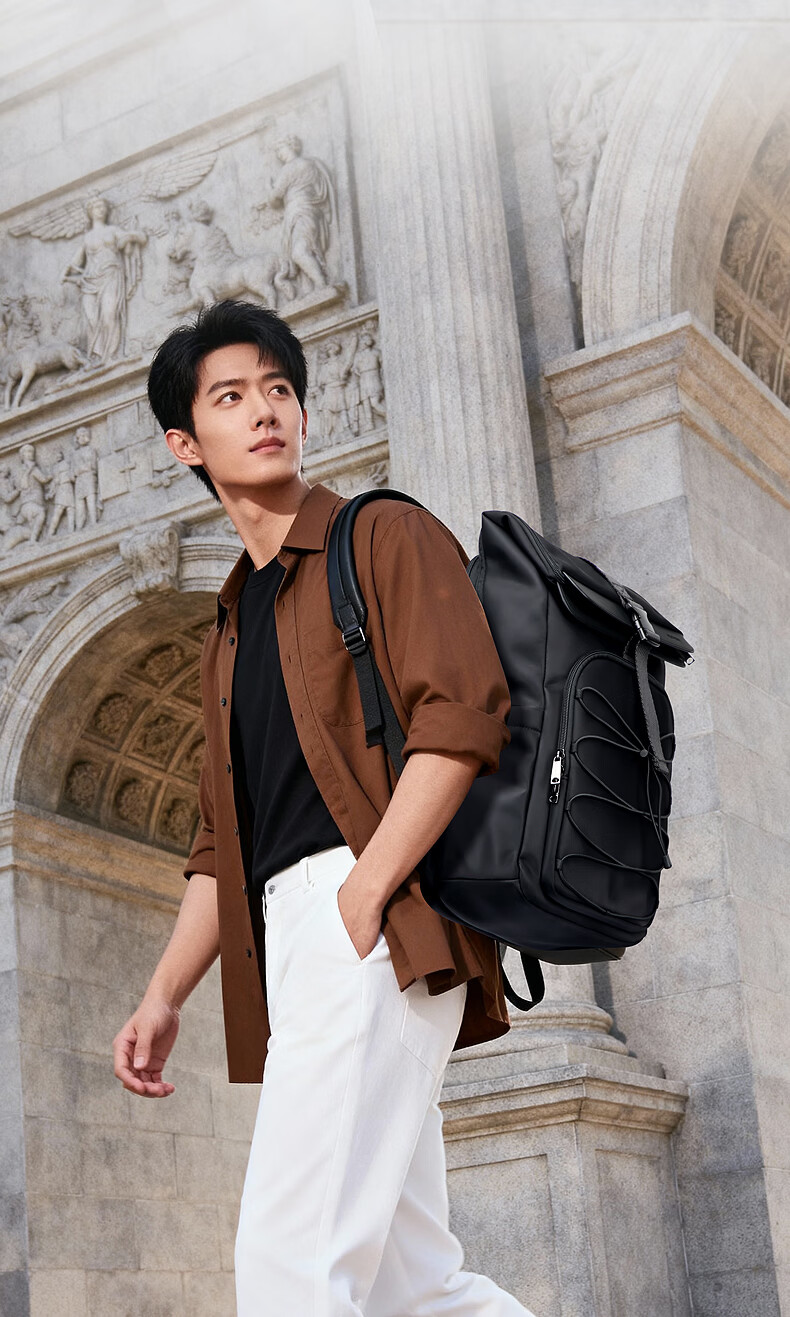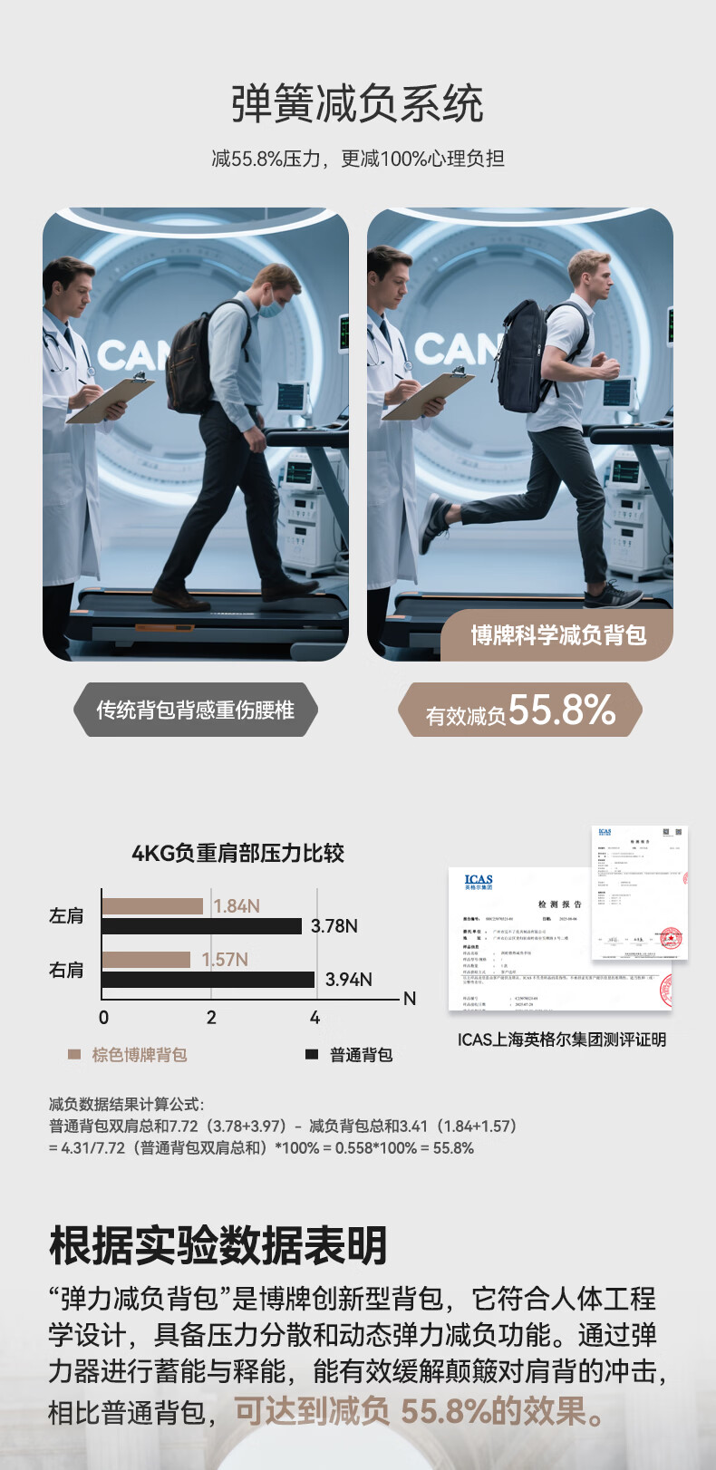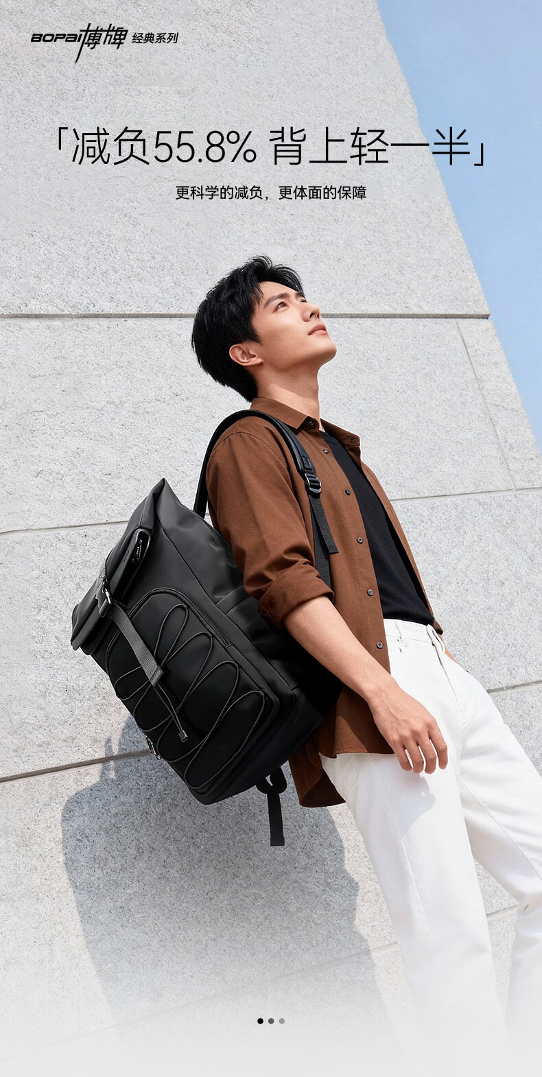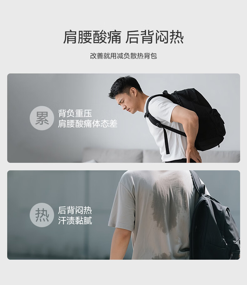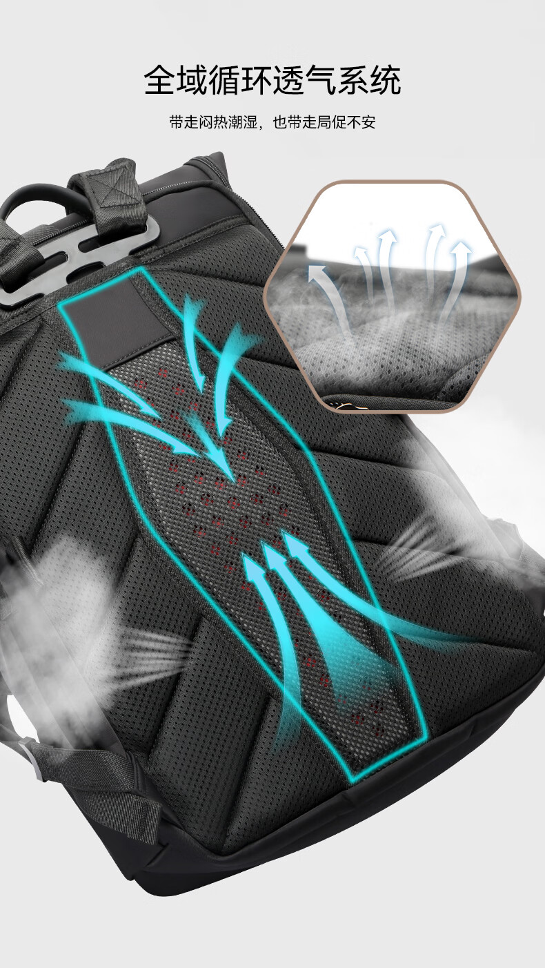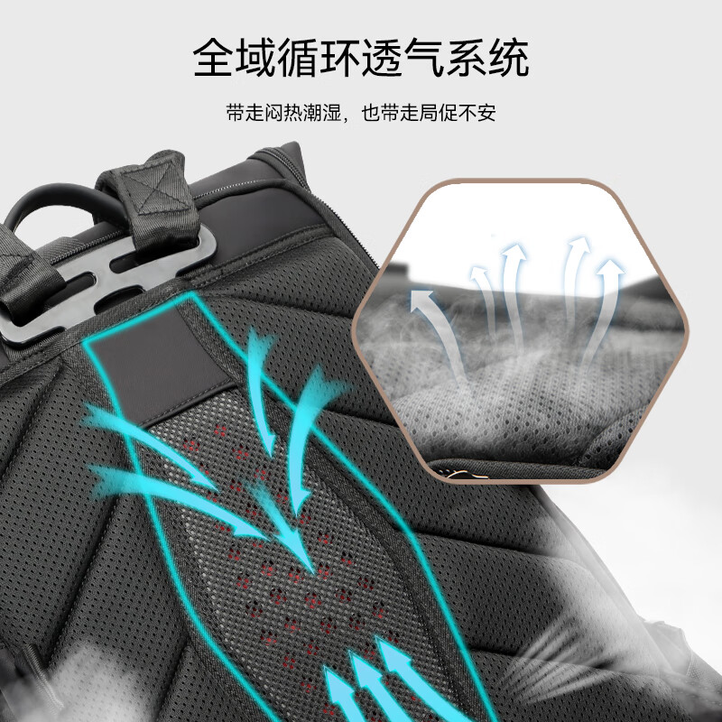 材质耐磨防泼水,包身大容量,抗震减压电脑位;插扣翻盖拉合式开袋,顶部卷顶式增容功能;背部内置弹簧系统减负减震,独立侧袋水杯位