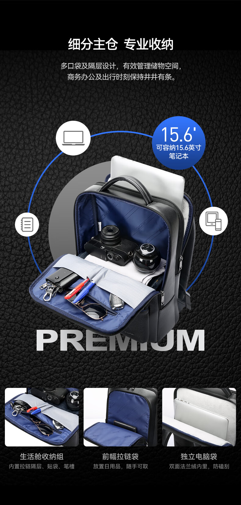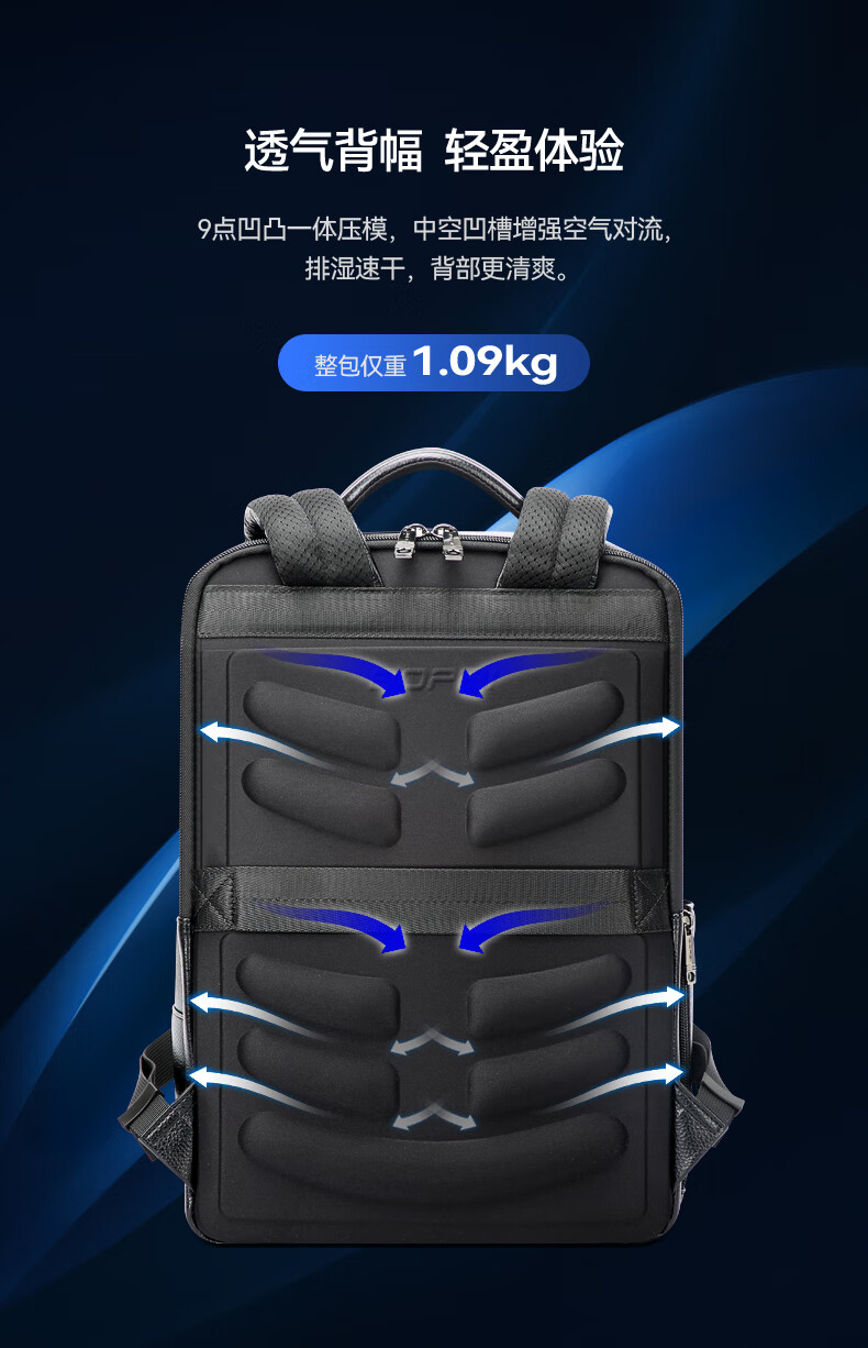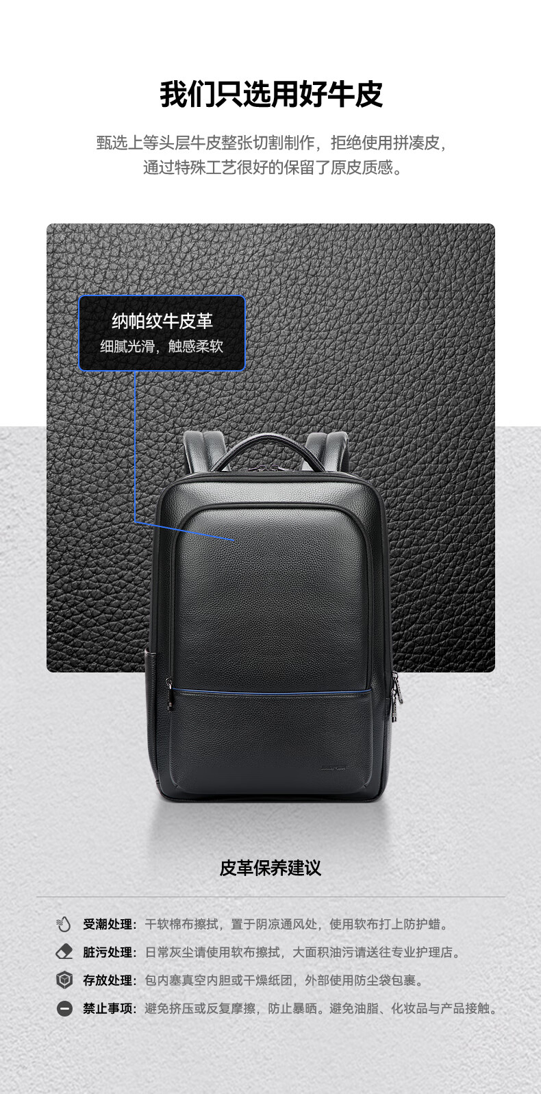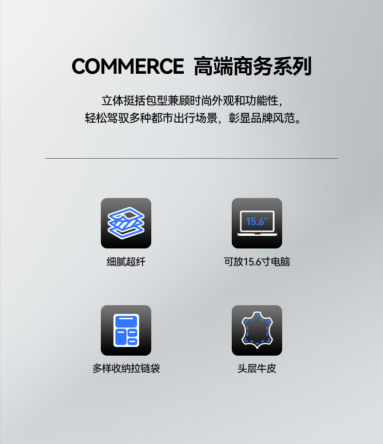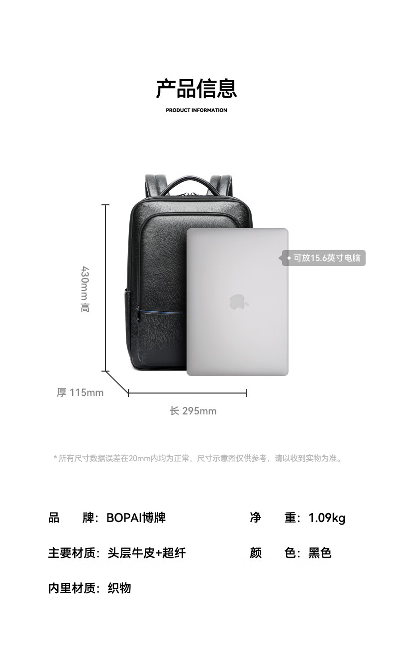 头层牛皮材质,立体有型;独立隐藏水杯位,拉杆固定带;后幅散热设计,抗震减压电脑位