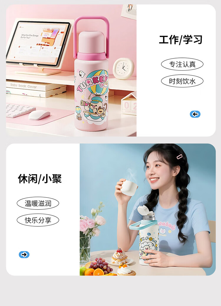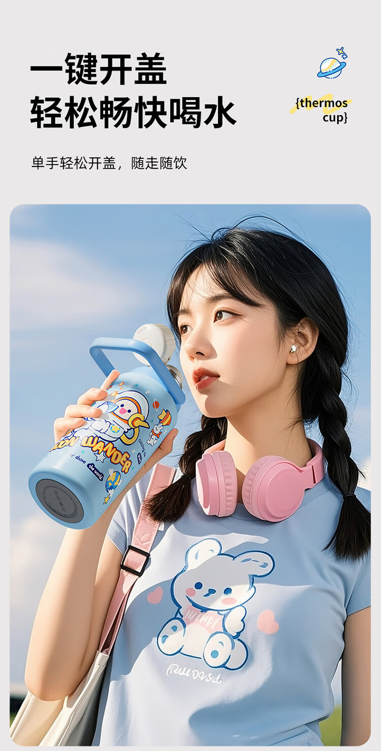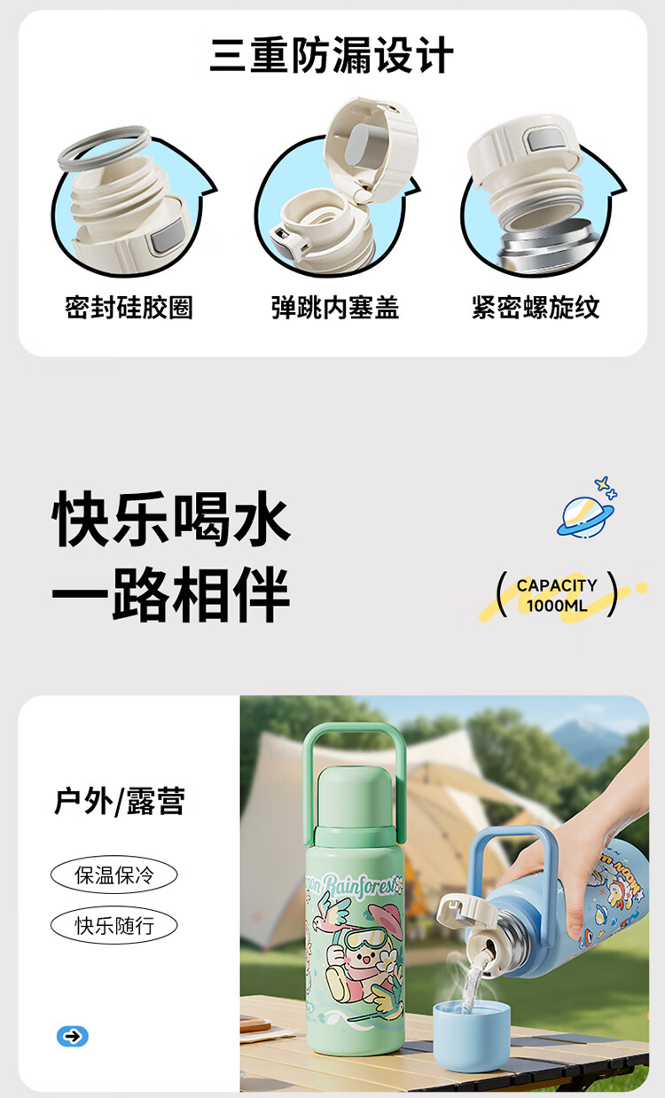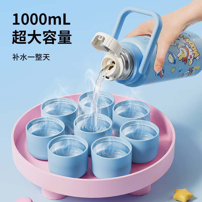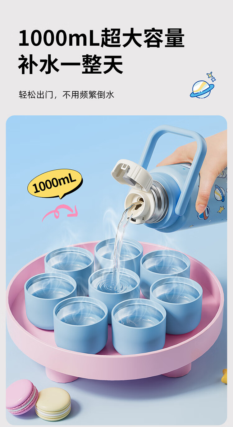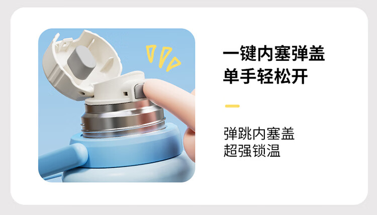 一键开盖,轻松畅快喝水;1000mL超大容量,补水一整天;外出拎手,提着走更安逸