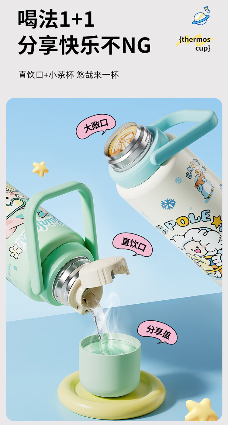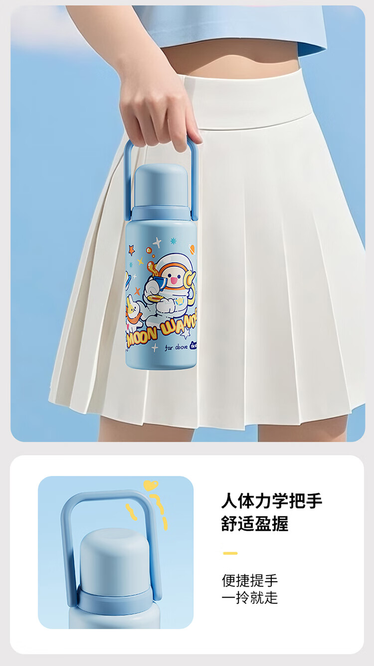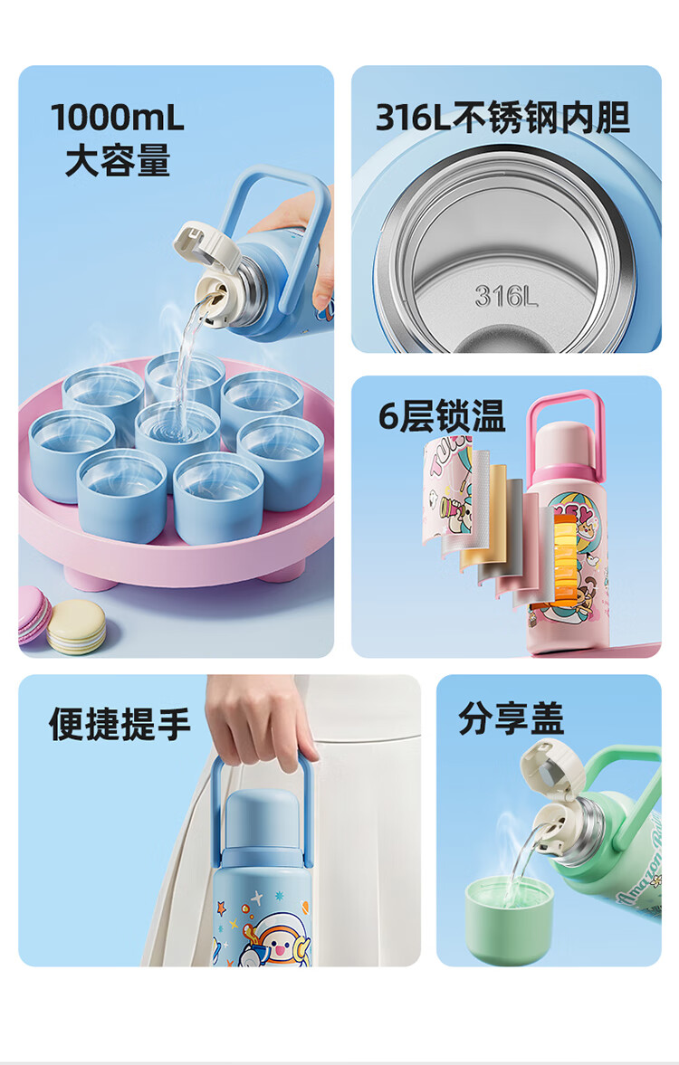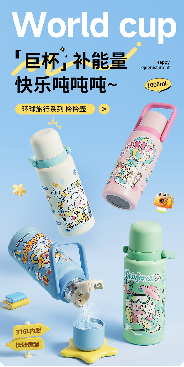 一键开盖,轻松畅快喝水;1000mL超大容量,补水一整天;外出拎手,提着走更安逸