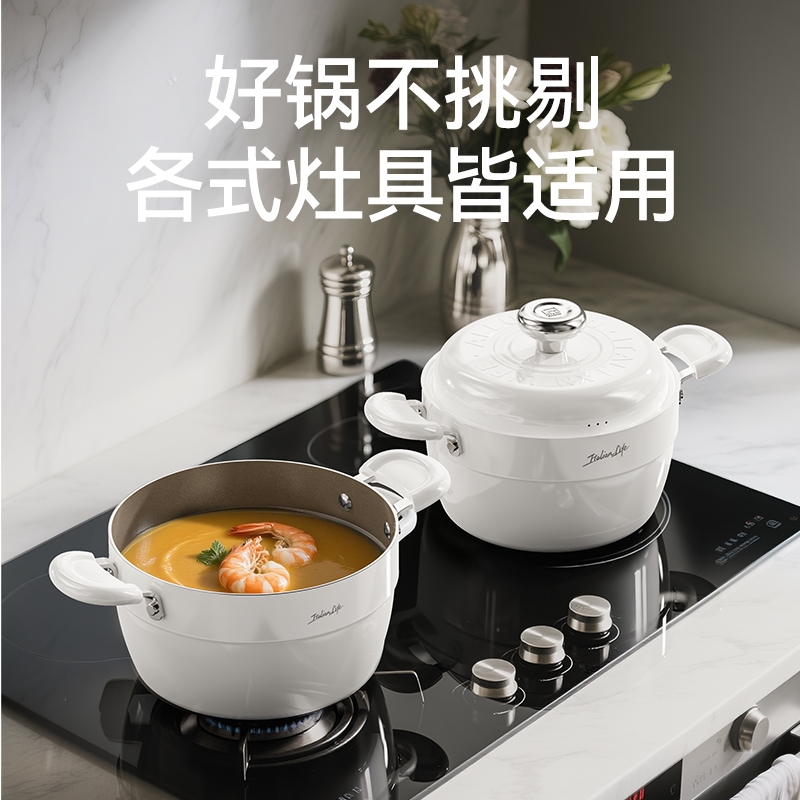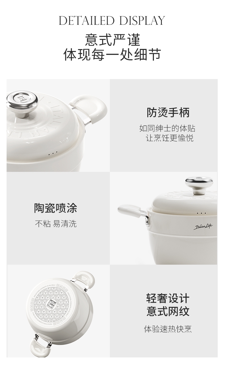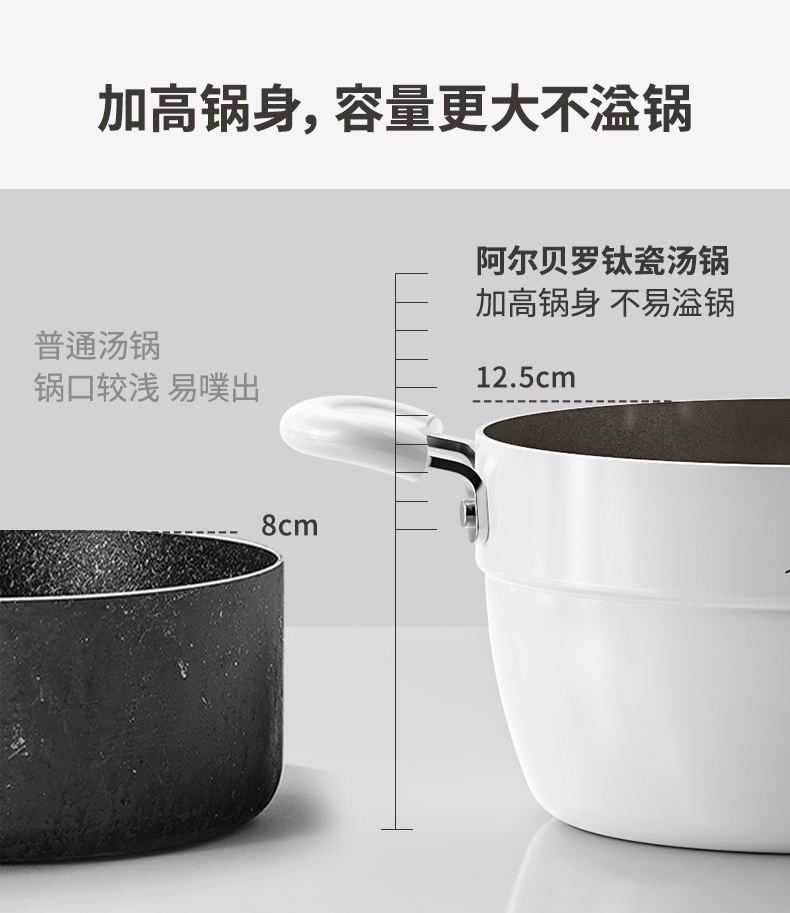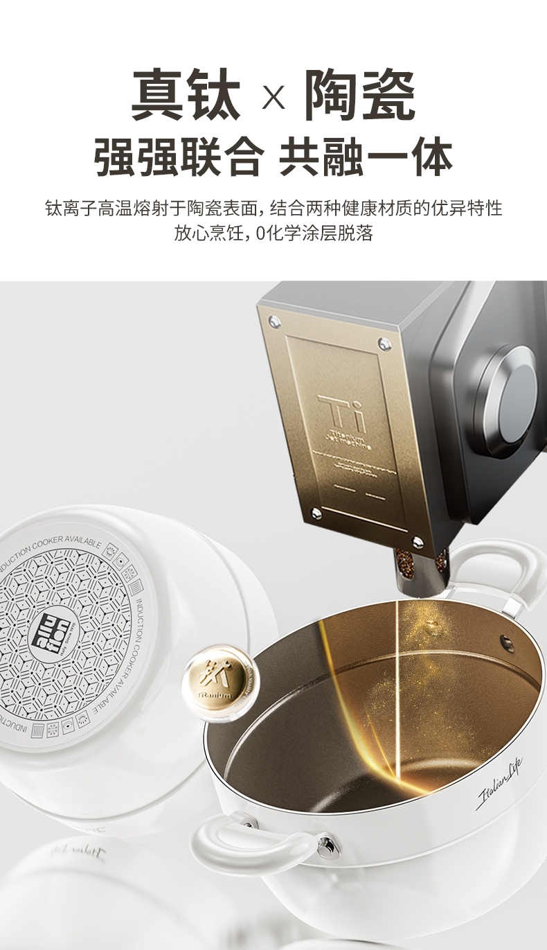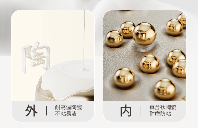 国标1级不粘,钛不粘不糊底。;钛瓷革新材质,0氟0析出0涂层。;9HV硬度,持久耐磨不粘。