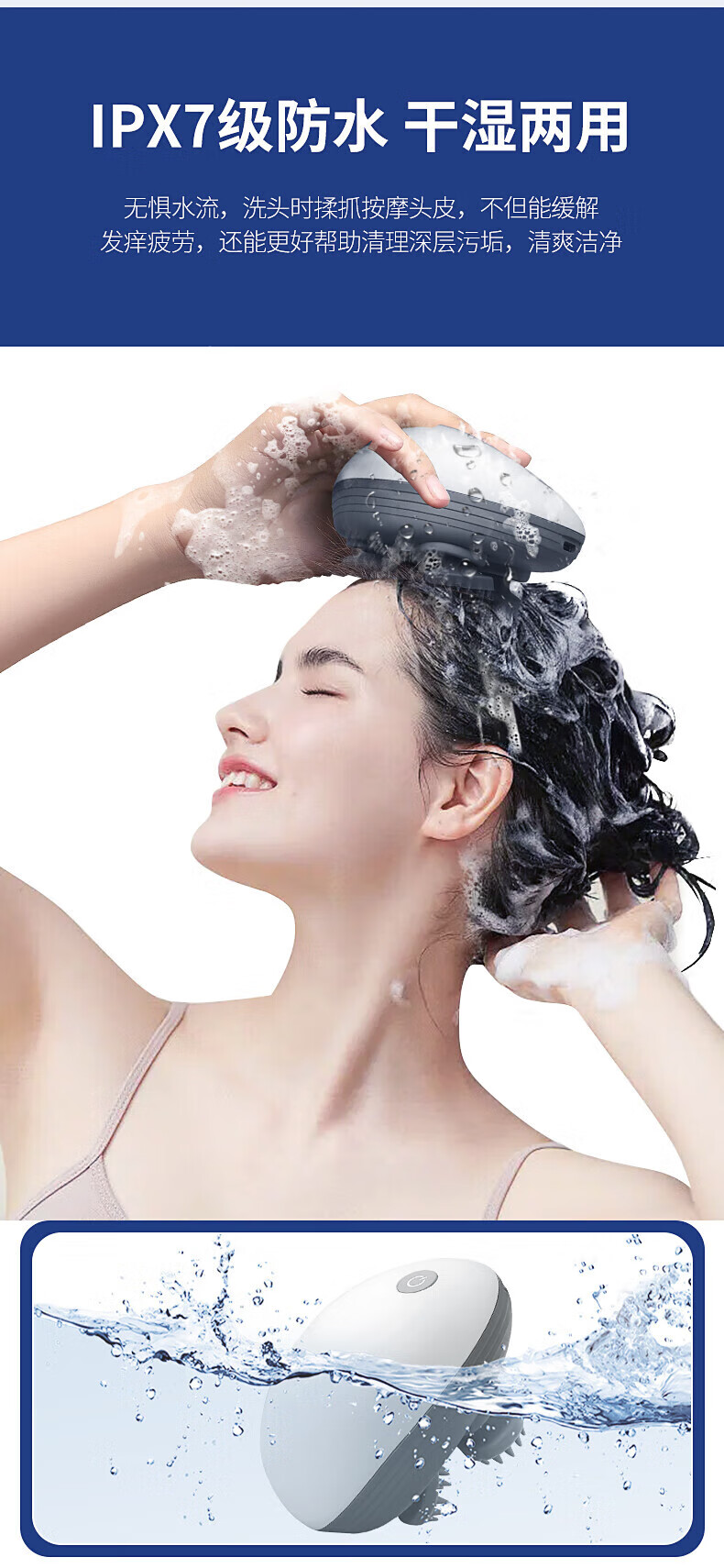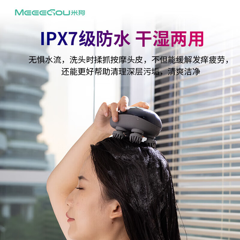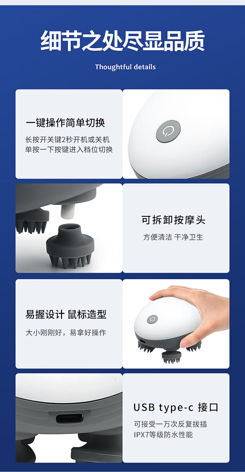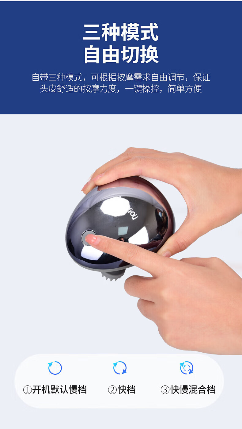 3档位自由切换,一键操作;7级防水、按摩头可拆卸清洗;软软硅胶按摩头,不伤头皮不缠头发