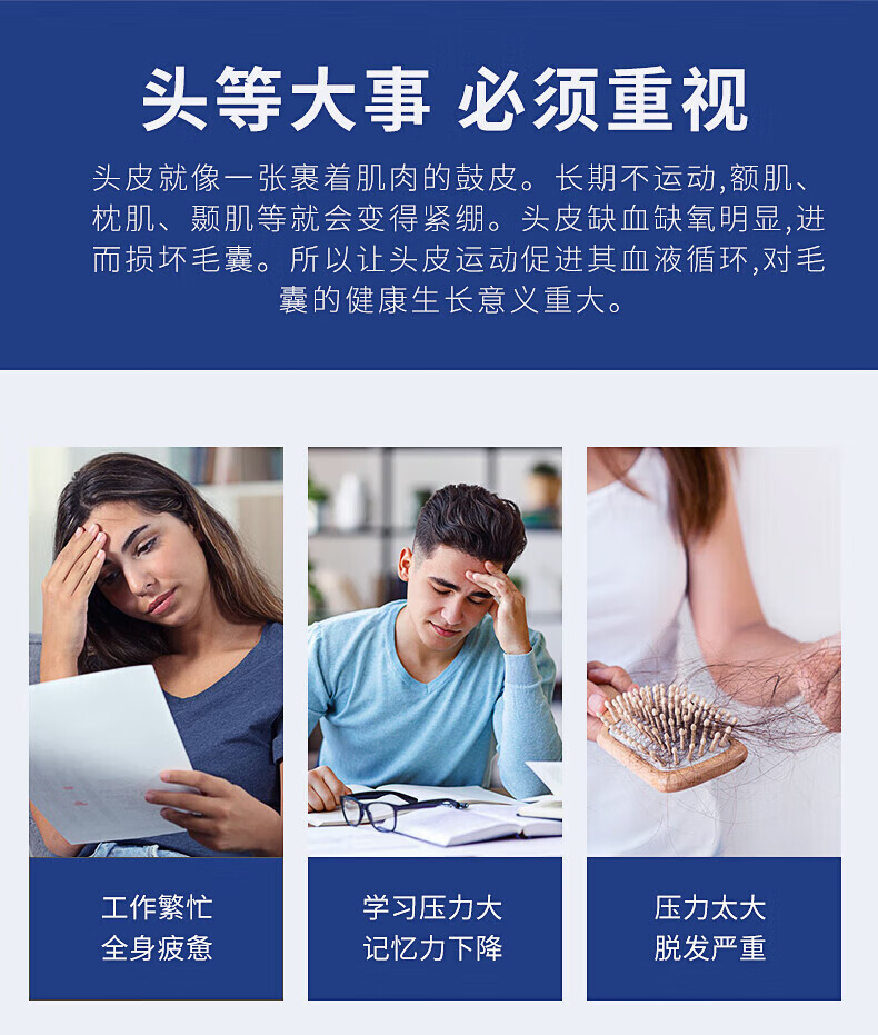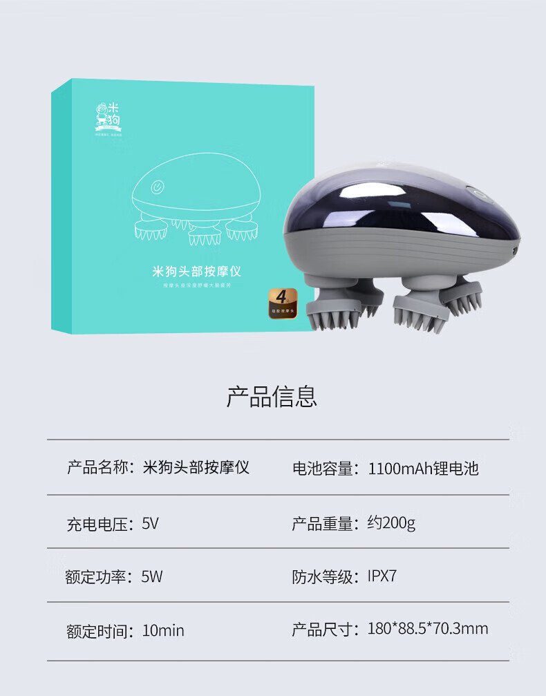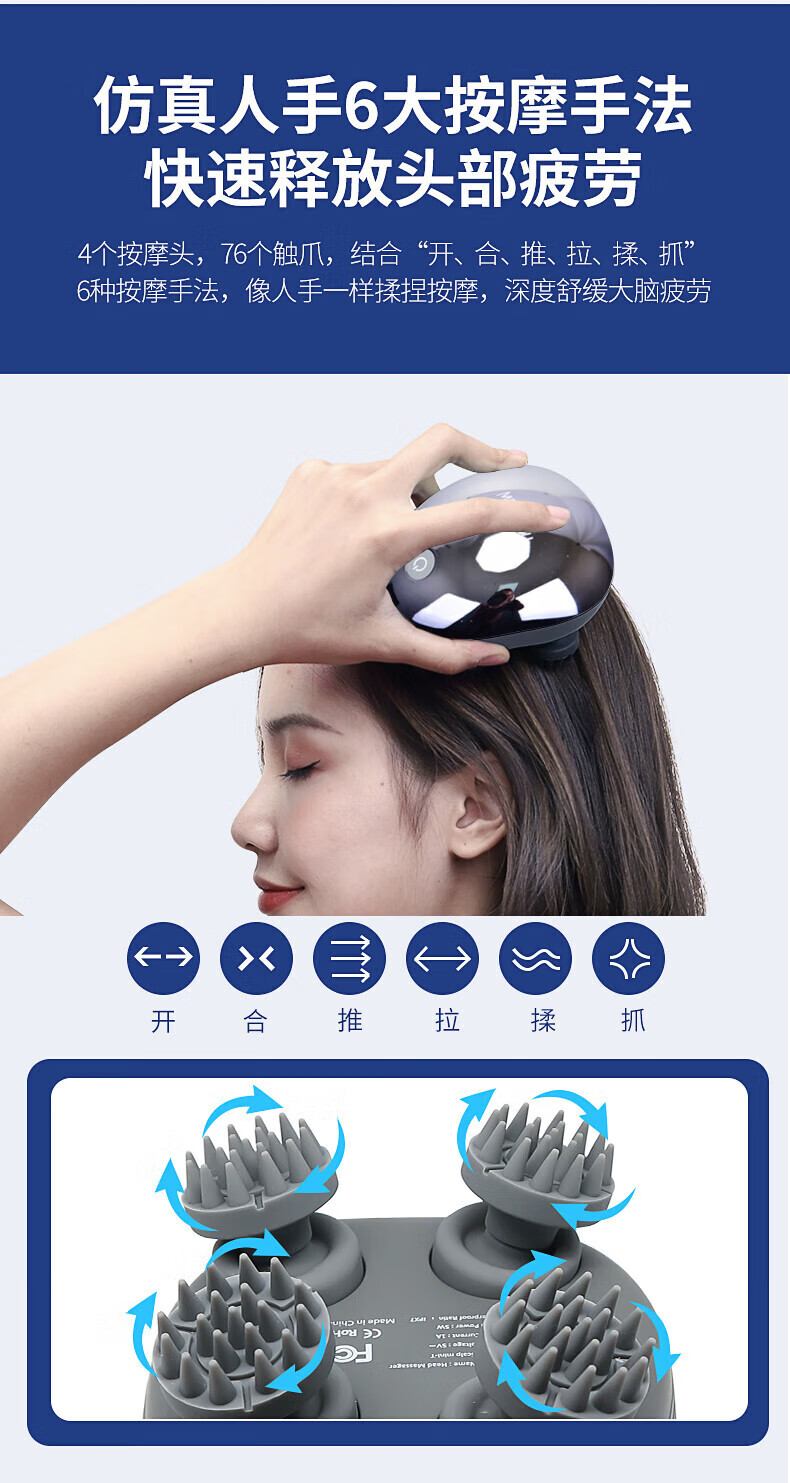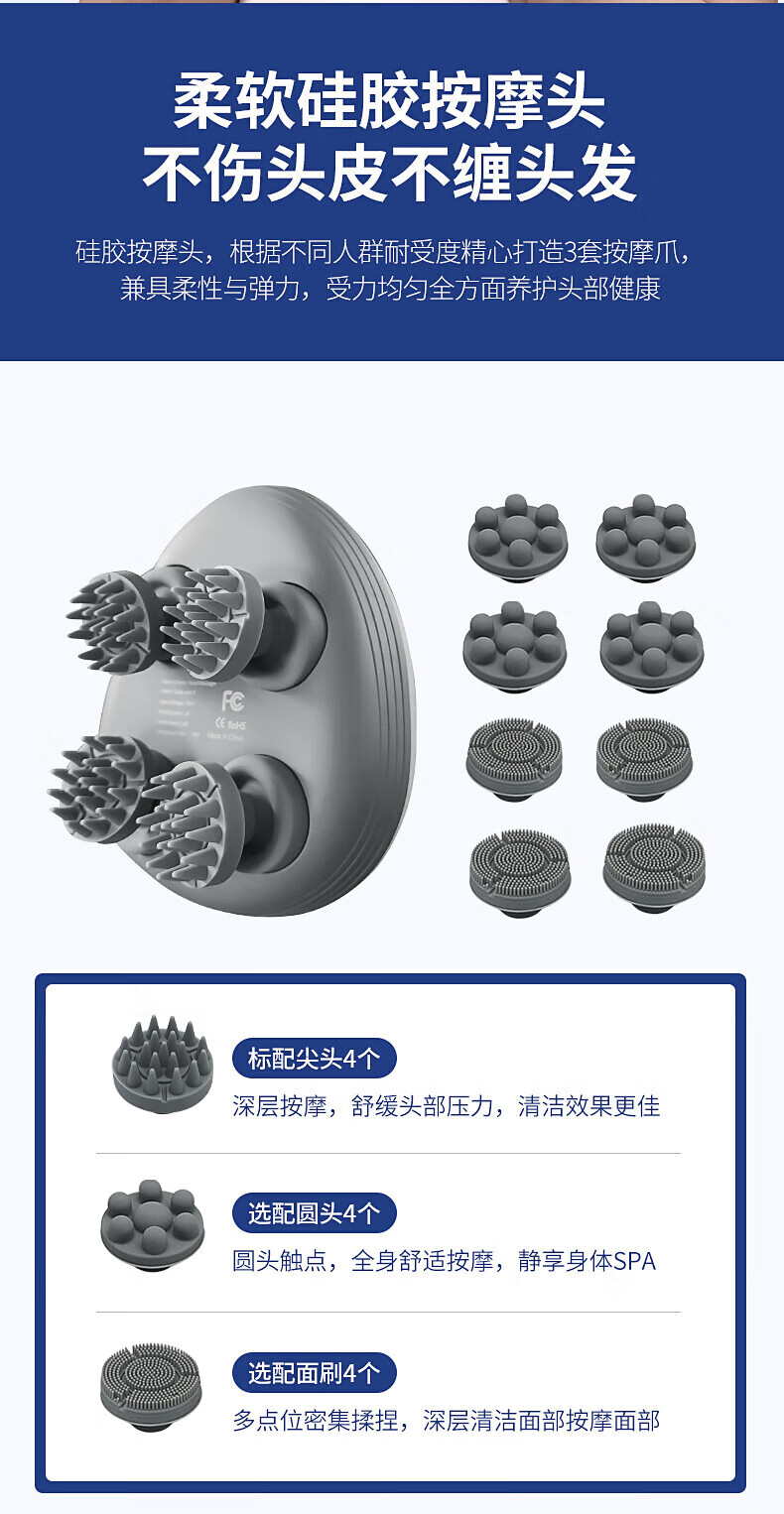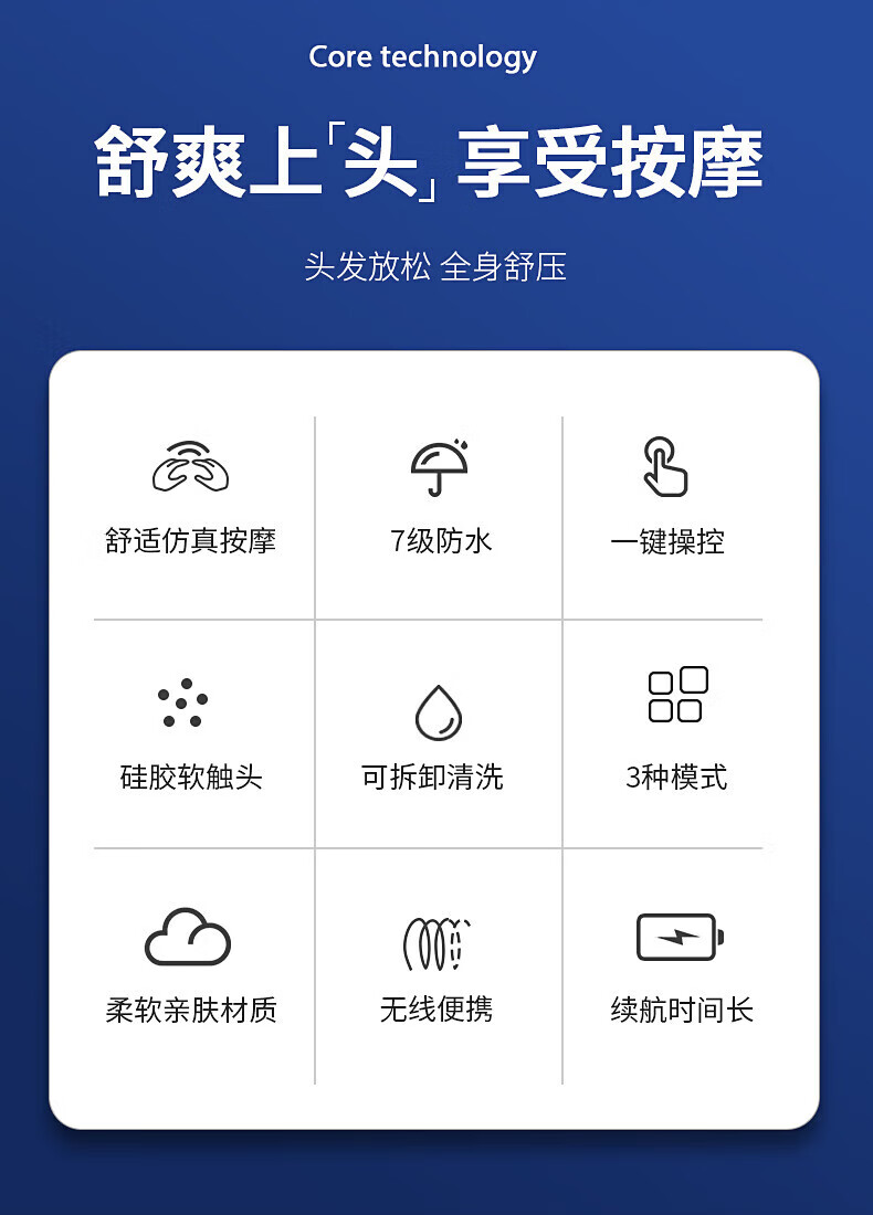 3档位自由切换,一键操作;7级防水、按摩头可拆卸清洗;软软硅胶按摩头,不伤头皮不缠头发