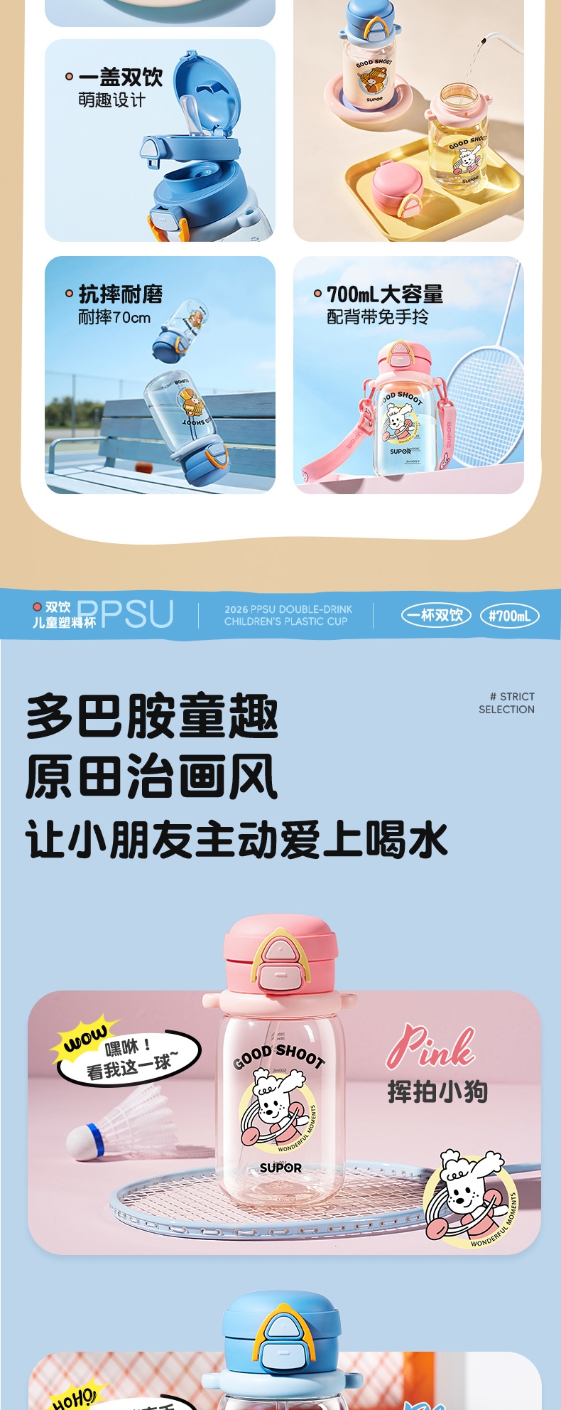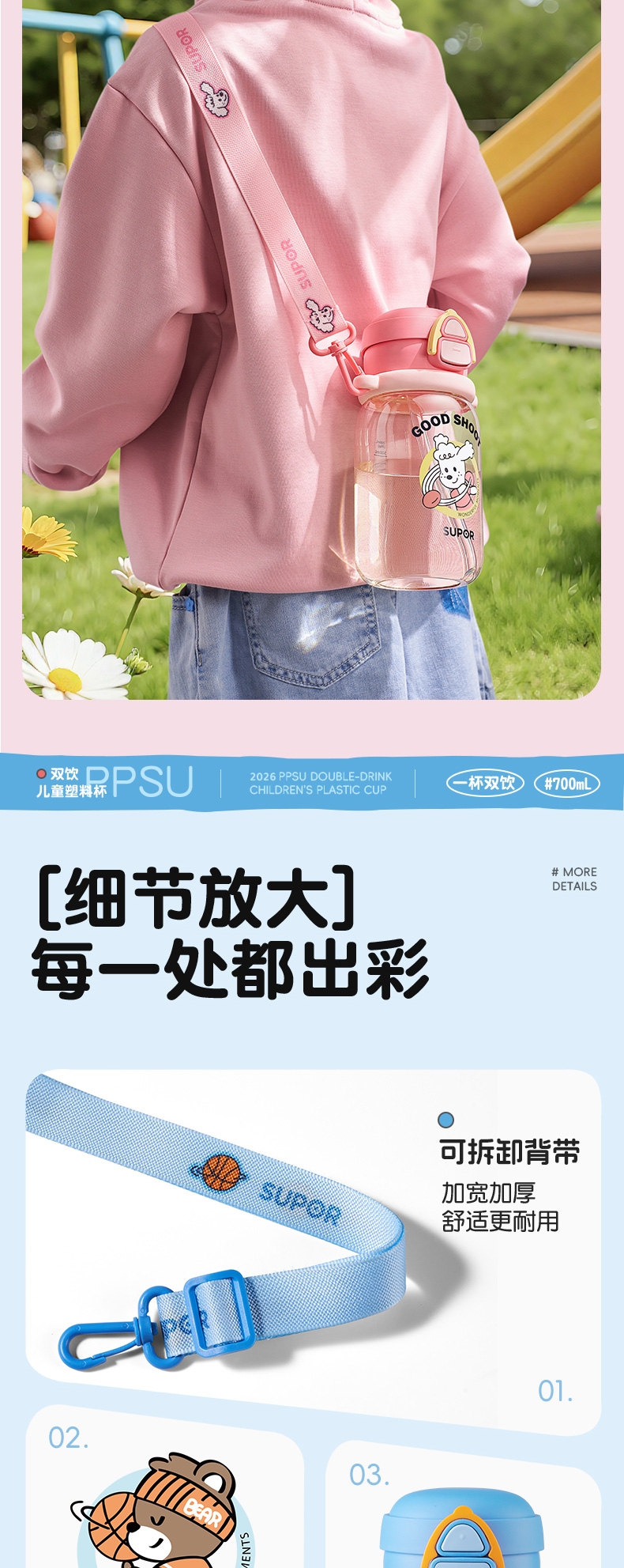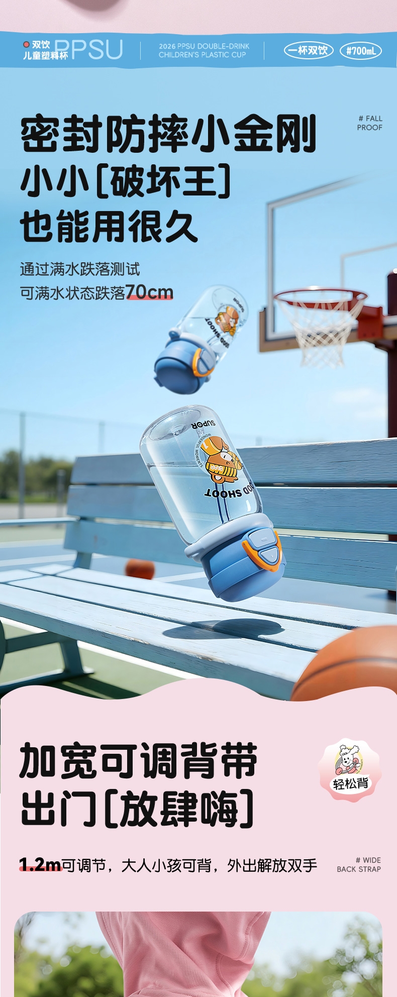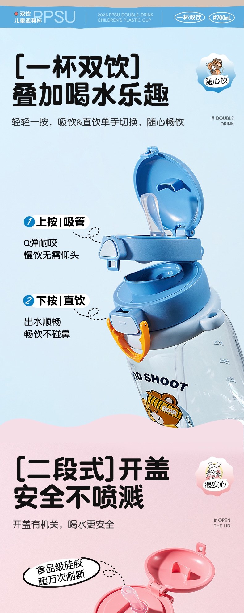 一盖双饮模式,满足不同饮水需求;二段泄压设计,弹盖防喷溅更安全;自带背带方便外出携带