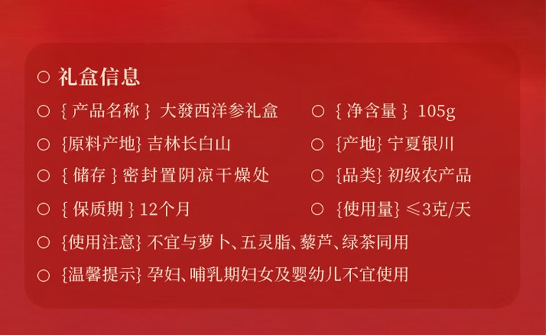 配置清单:1.8-2.0cm西洋参片105g、礼盒*1、礼袋*1