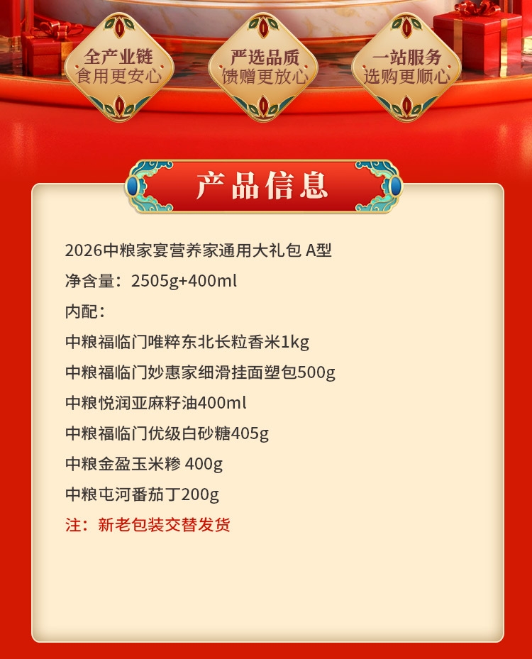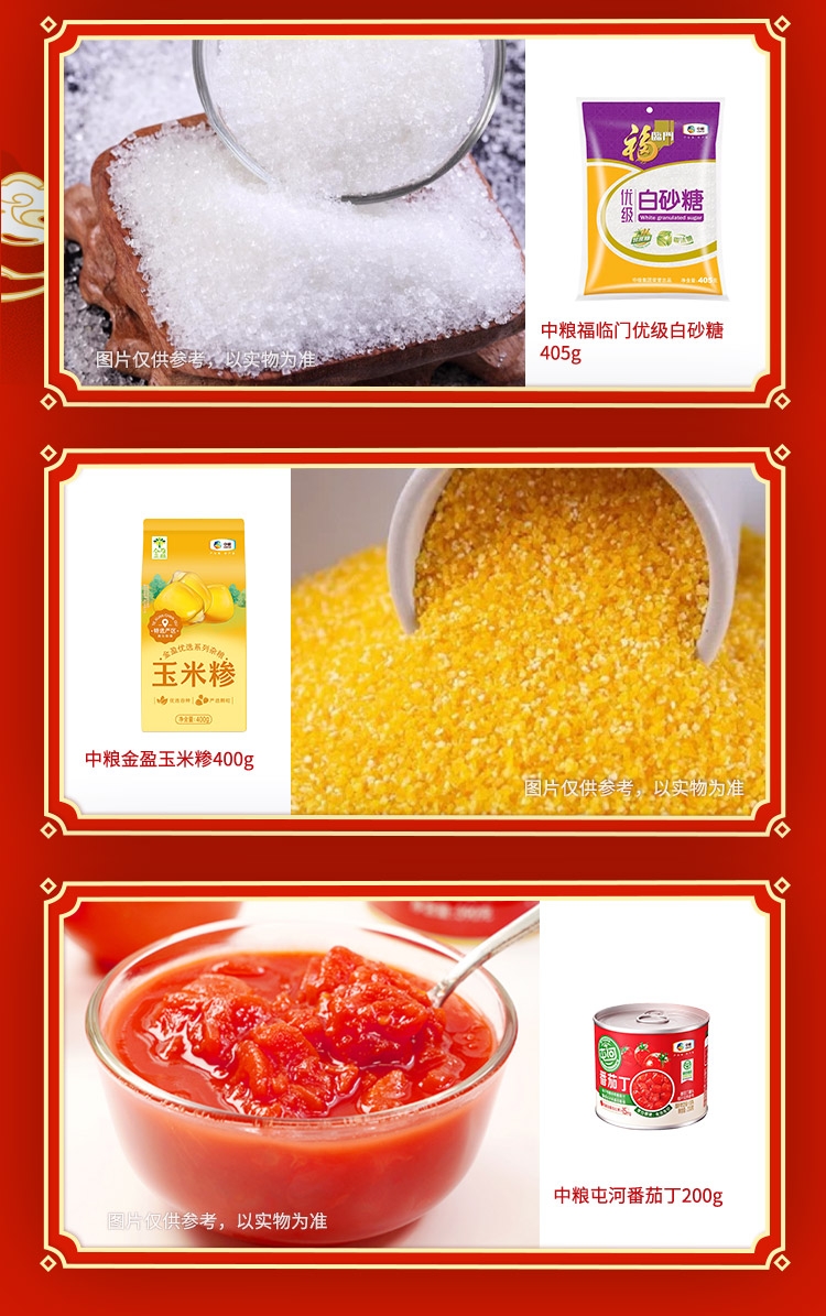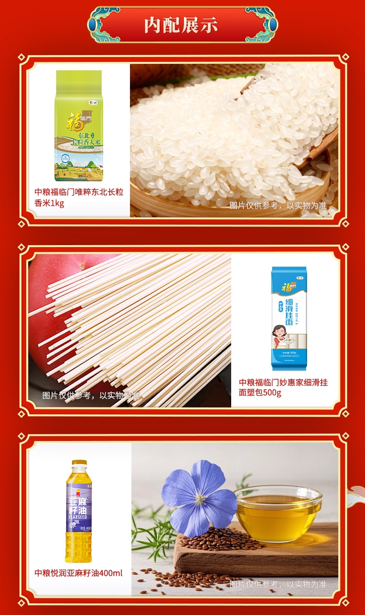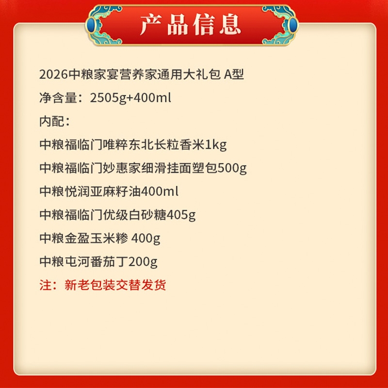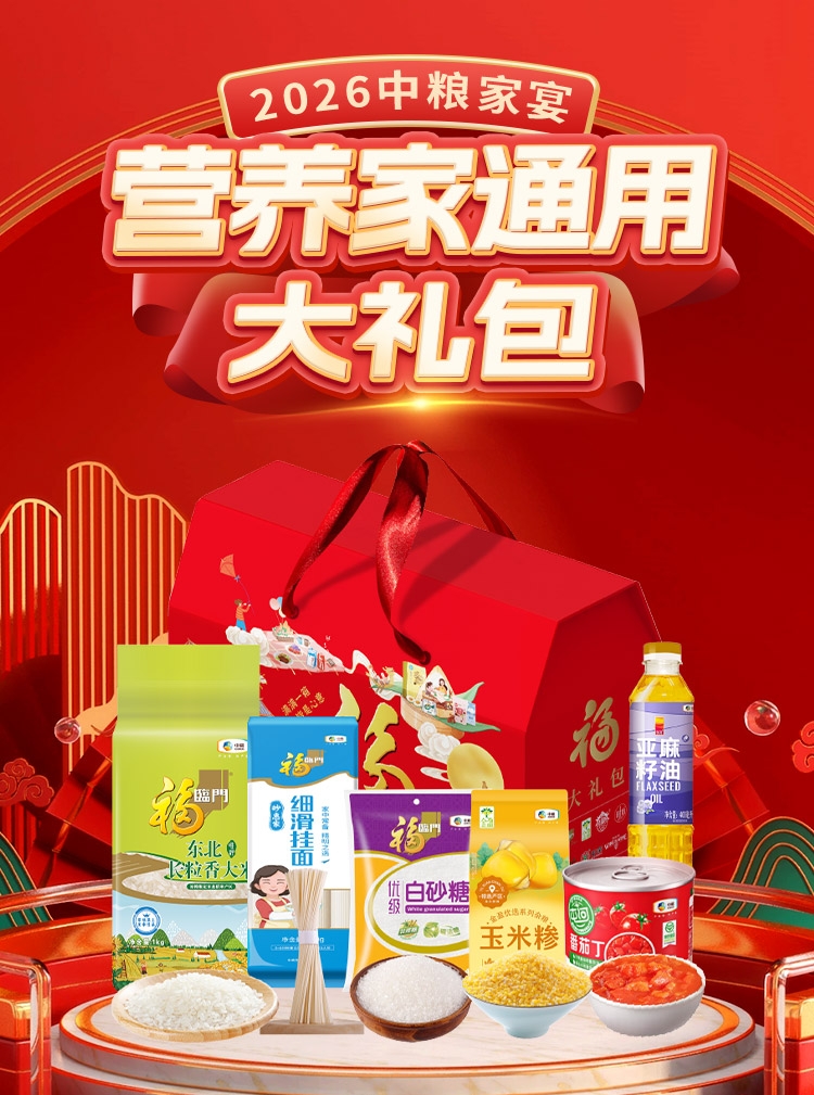 配置清单:净含量:2505g+400ml 内配: 中粮福临门唯粹东北长粒香米 1kg 中粮福临门妙惠家细滑挂面塑包500g 中粮悦润亚麻籽油400ml 中粮金盈玉米糁 400g 中粮福临门优级白砂糖405g 中粮屯河番茄丁200g