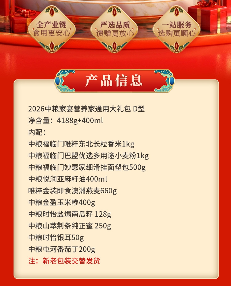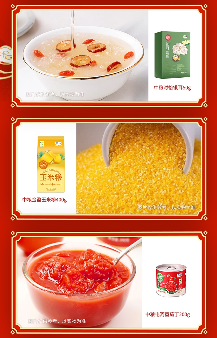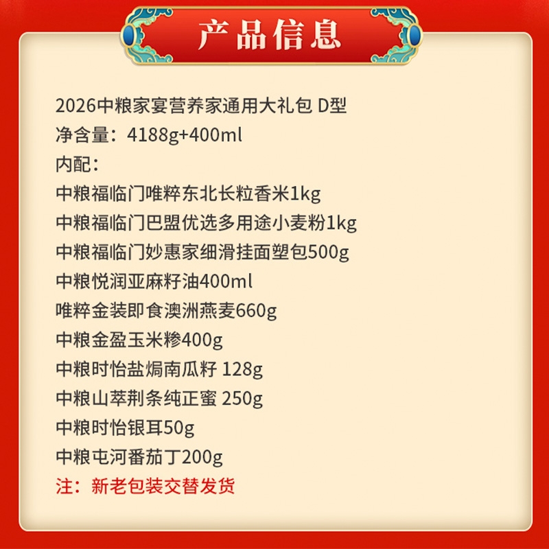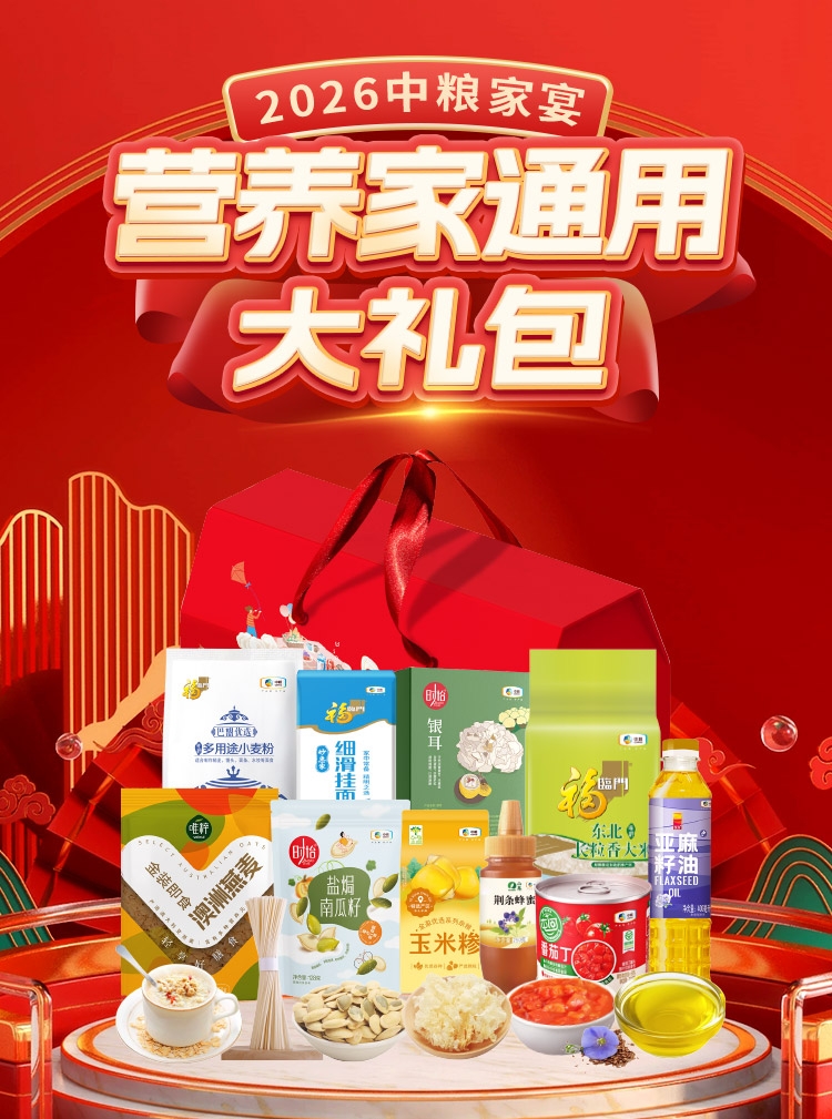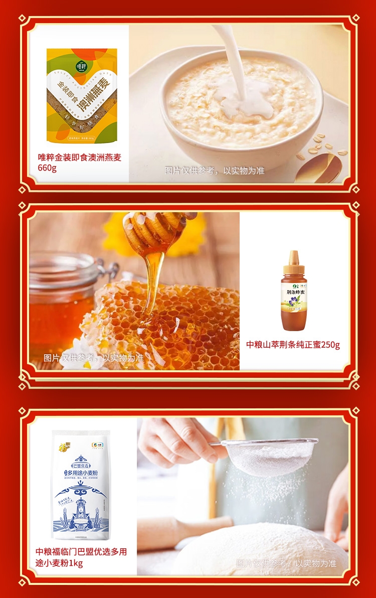 配置清单:净含量:4188g+400ml 内配: 中粮福临门唯粹东北长粒香米 1kg 中粮福临门巴盟优选多用途小麦粉1kg 中粮悦润亚麻籽油400ml 中粮金盈玉米糁 400g 中粮时怡盐焗南瓜籽 128g 中粮山萃荆条纯正蜜 250g 唯粹金装即食澳洲燕麦660g 中粮时怡银耳 50g 中粮福临门妙惠家细滑挂面塑包500g 中粮屯河番茄丁200g