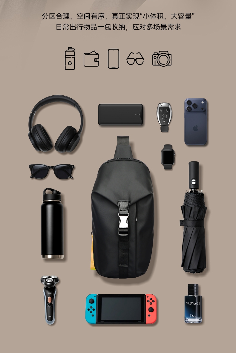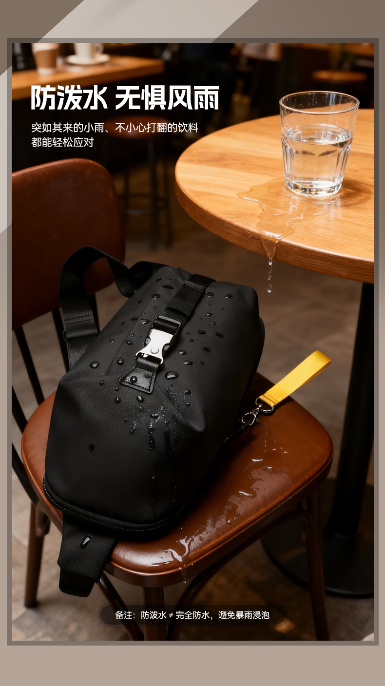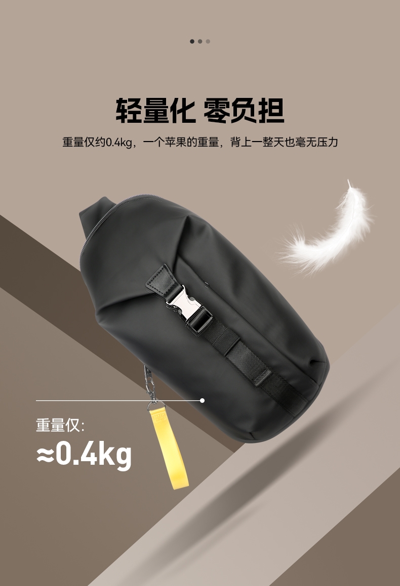 材质耐磨防泼水,轻至0.3kg;顺滑拉链,前幅口袋、内部主袋有隔层袋;可调节长肩带,可肩背、斜挎背、手拎