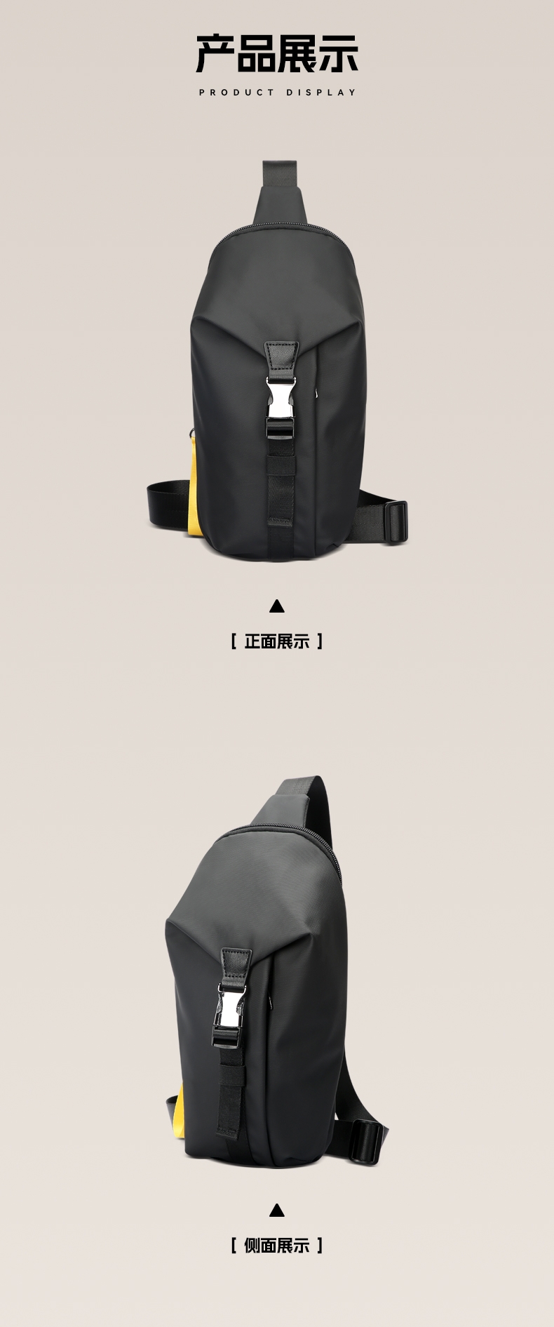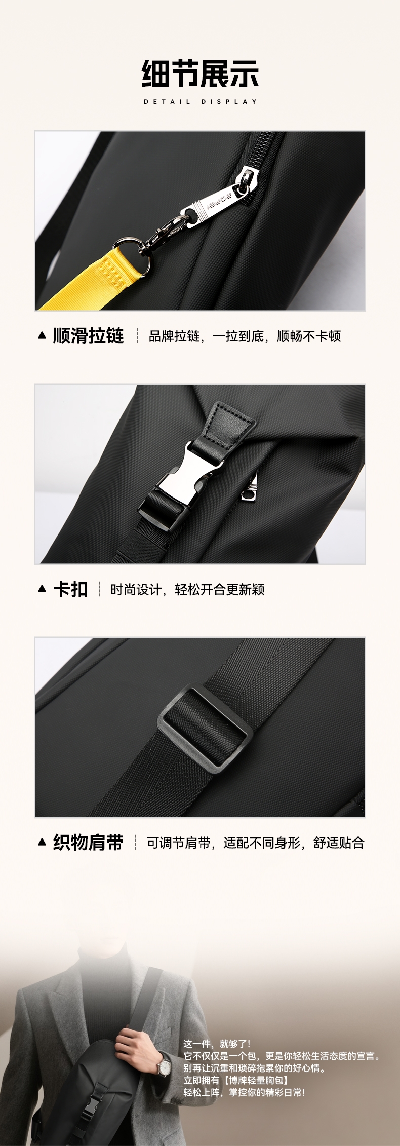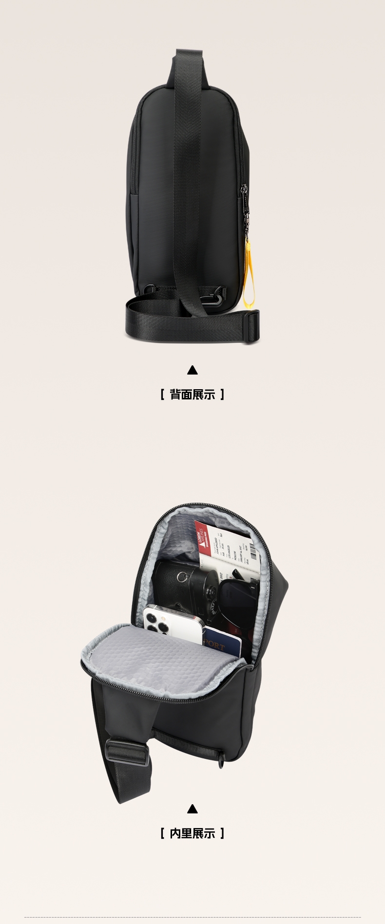 材质耐磨防泼水,轻至0.3kg;顺滑拉链,前幅口袋、内部主袋有隔层袋;可调节长肩带,可肩背、斜挎背、手拎