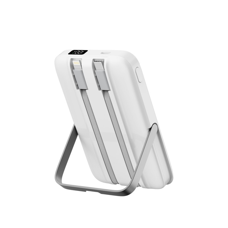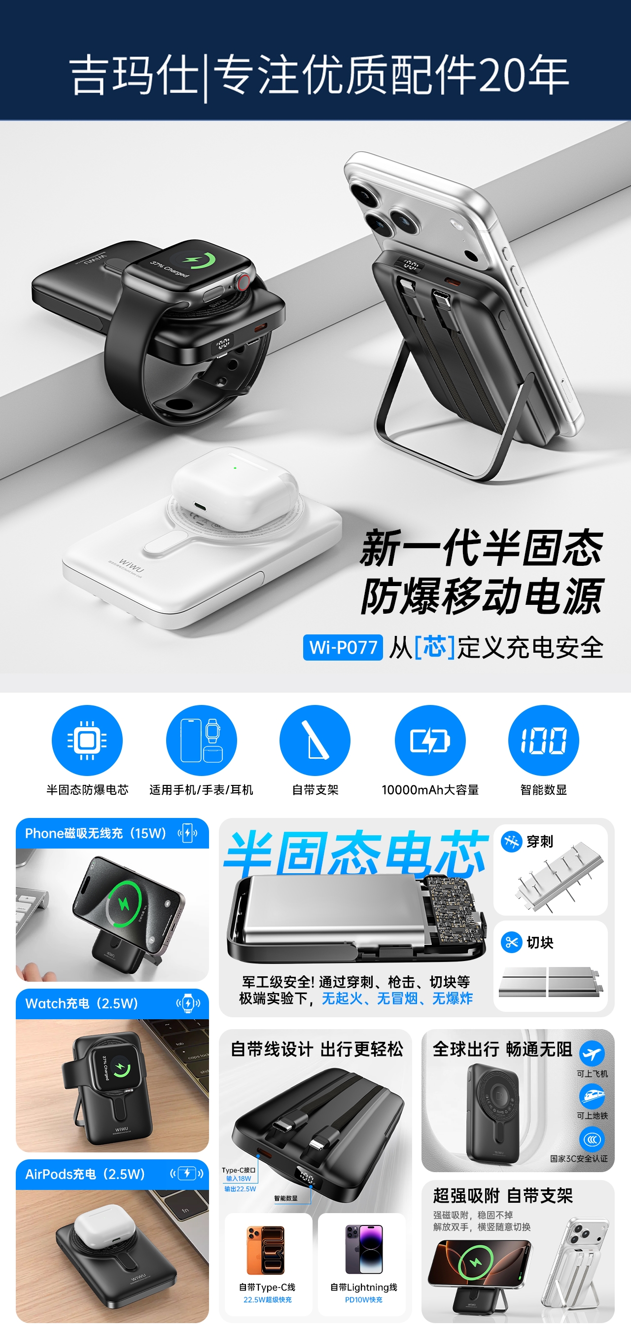 独家私模,新一代充电宝,安全半固态电池;电池穿刺,突破极限,安全保障防火固态电池充电宝;秒变支架,横/竖都能充,自带锌合金金属支架;符合国内外民航运输标准,安全携带登机