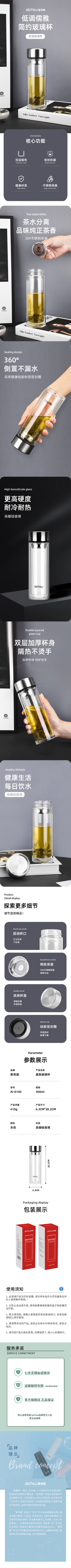 杯身采用双层高硼硅玻璃,有效隔热防烫;304不锈钢茶漏,有效阻隔茶渣入口;贴心设计,倒置不漏水,使用放心