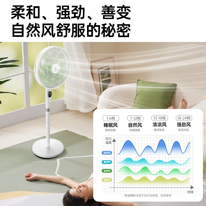 新一级能效,直流无刷电机,节能又静音;智能语音控制,24 档风速,12H 定时更便捷;15 叶双层扇叶,90° 广角送风,安睡风更舒适