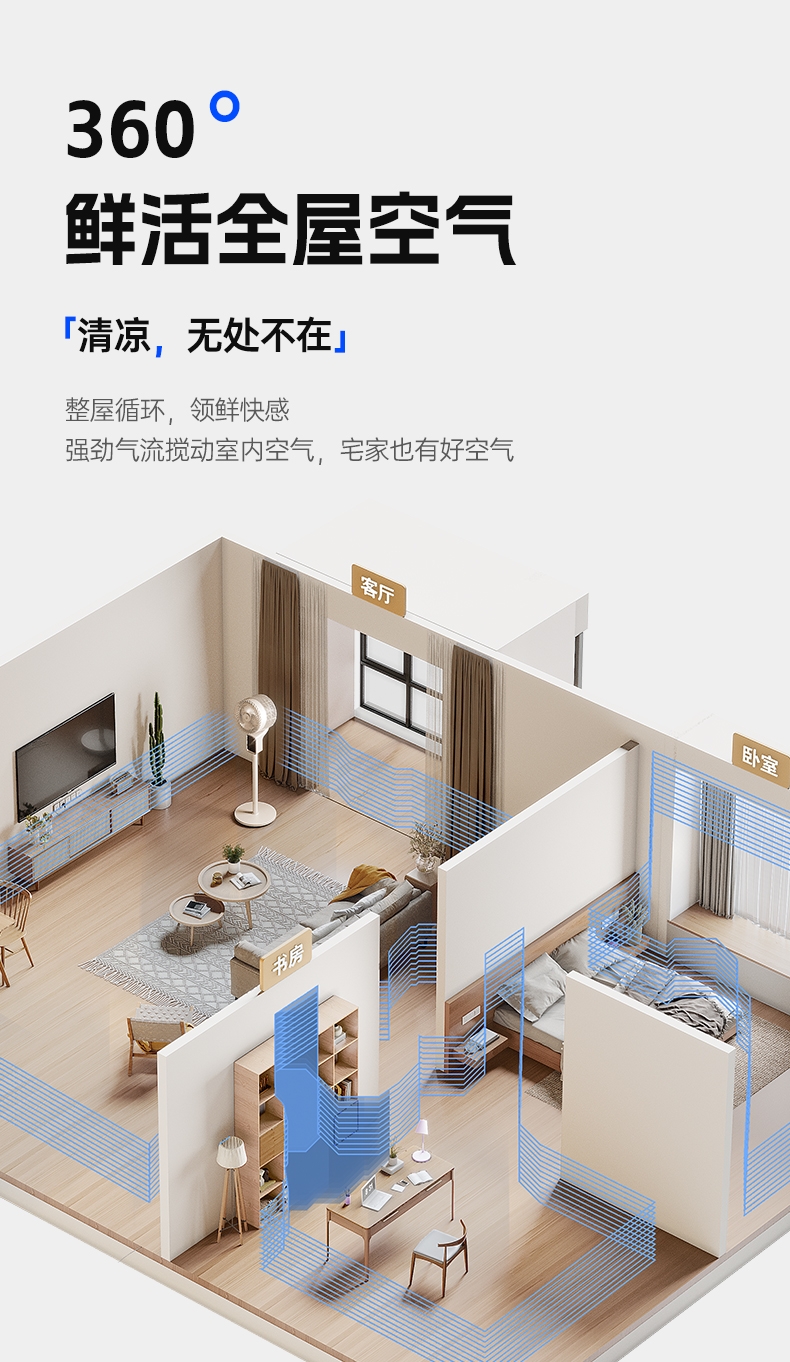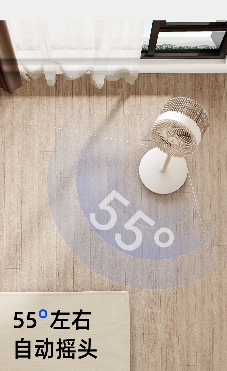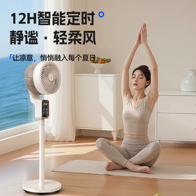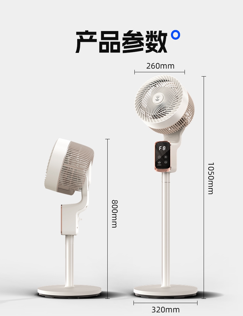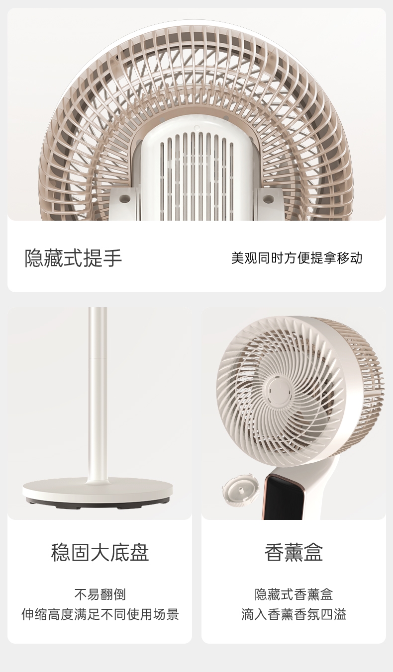 前置香薰盒设计,风带香气,四季舒适;8 档风速 + 广角摇头,远距送风,智能语音控制;12H 定时轻音运行,流体风腔,循环送风更高效