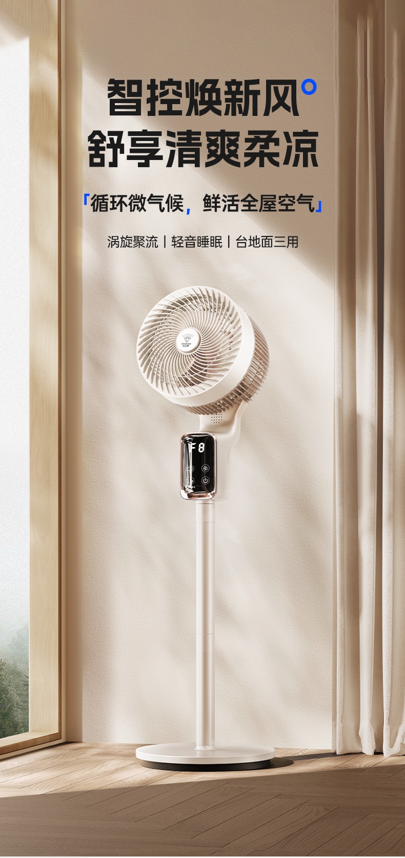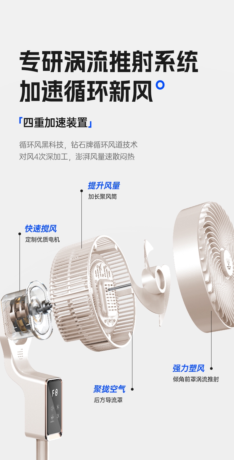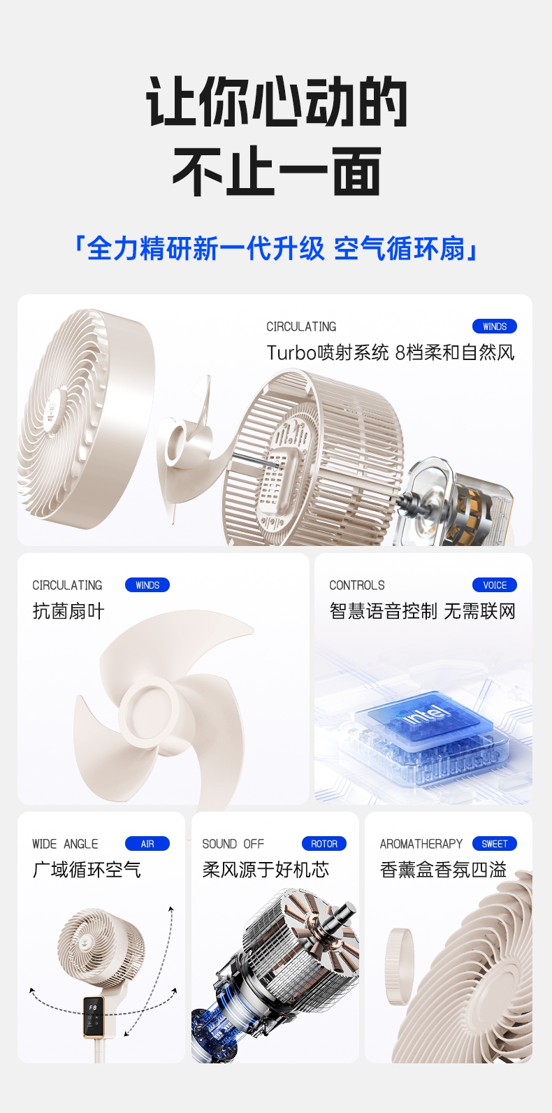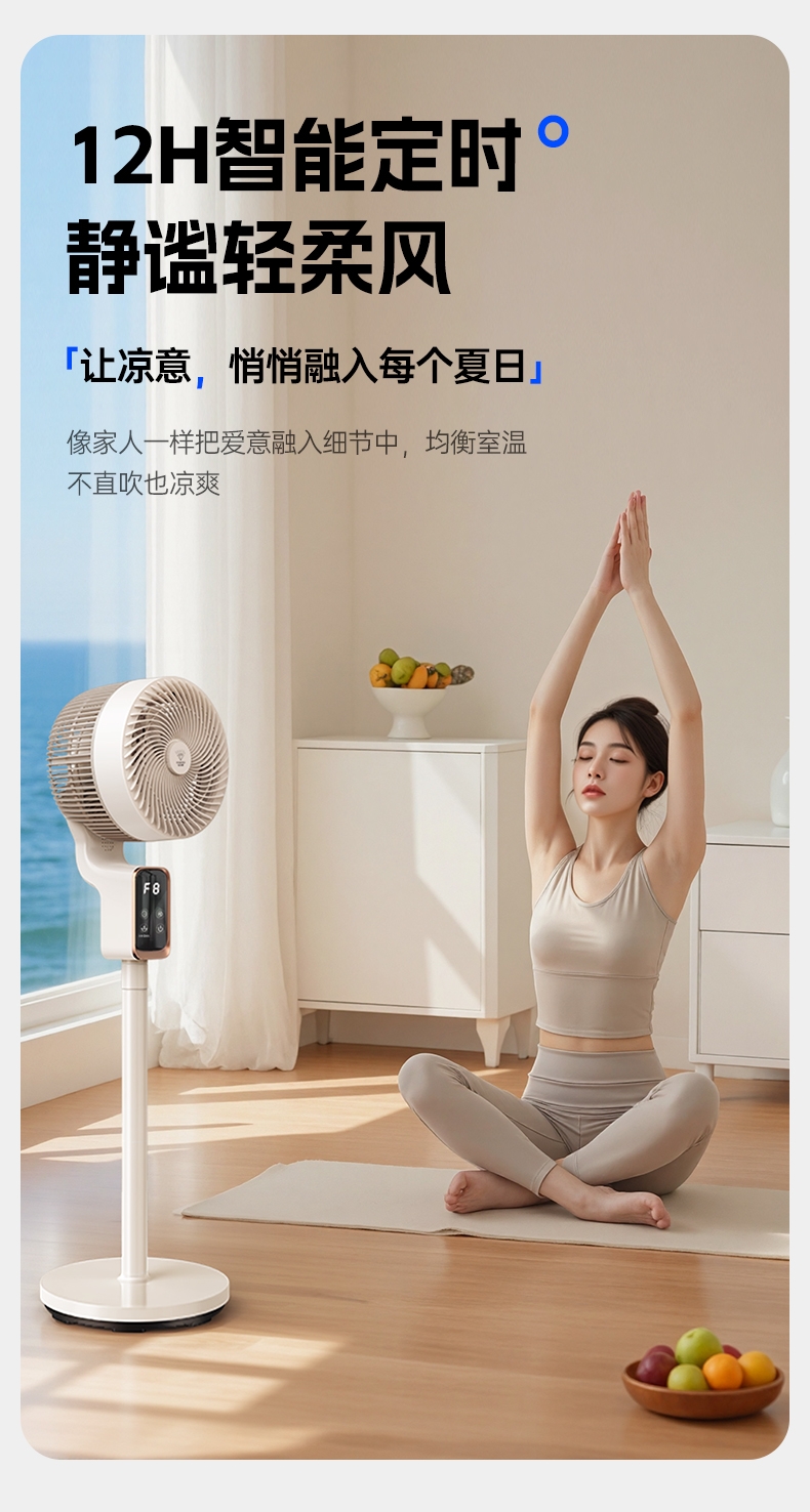 前置香薰盒设计,风带香气,四季舒适;8 档风速 + 广角摇头,远距送风,智能语音控制;12H 定时轻音运行,流体风腔,循环送风更高效