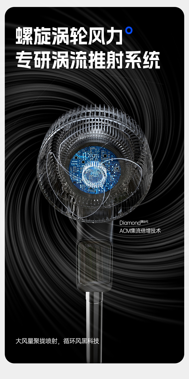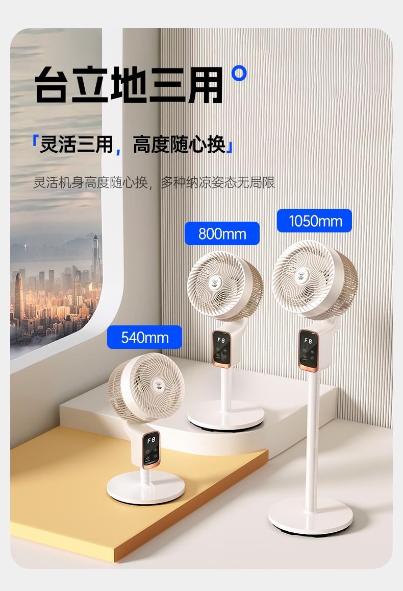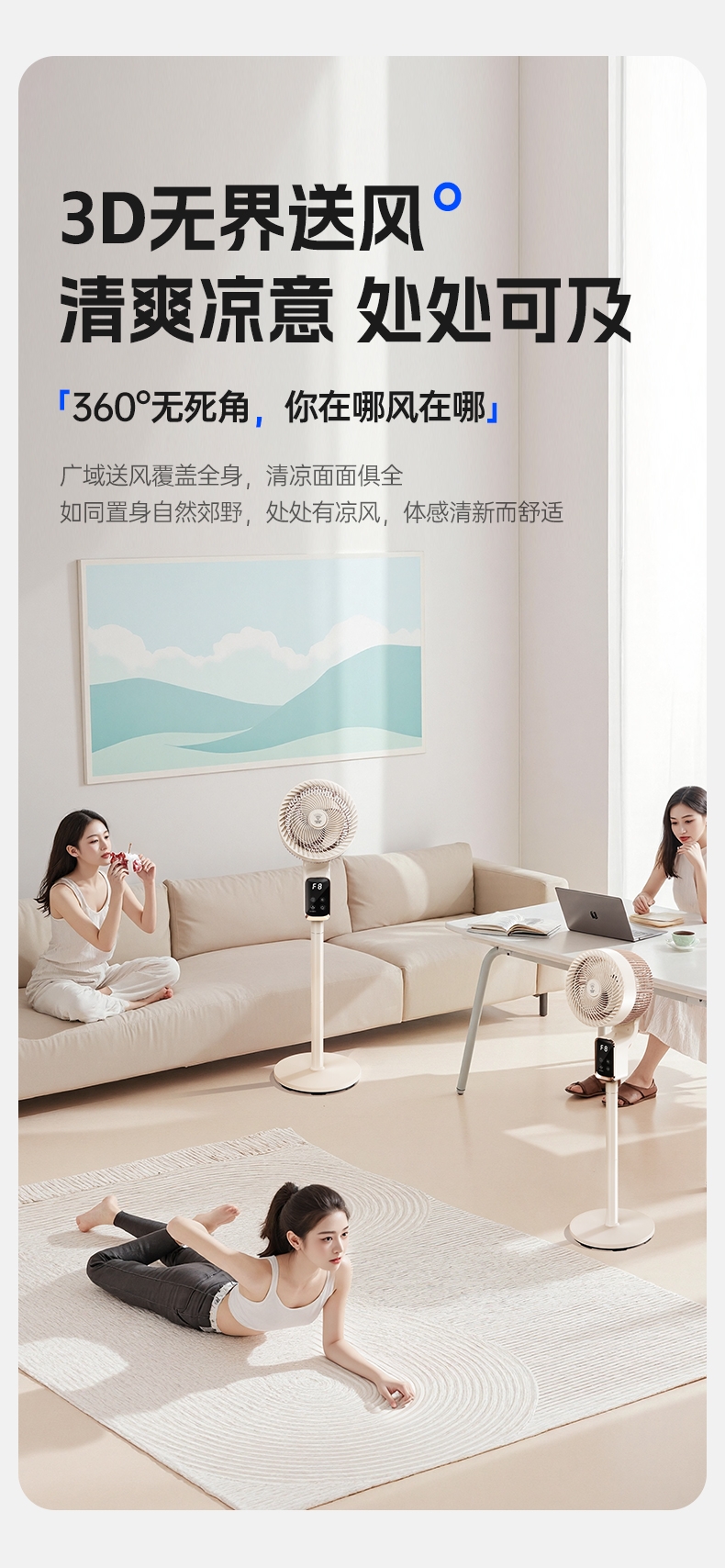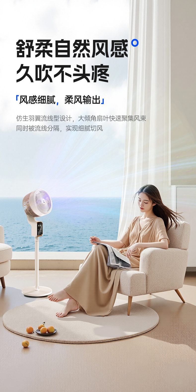 前置香薰盒设计,风带香气,四季舒适;8 档风速 + 广角摇头,远距送风,智能语音控制;12H 定时轻音运行,流体风腔,循环送风更高效