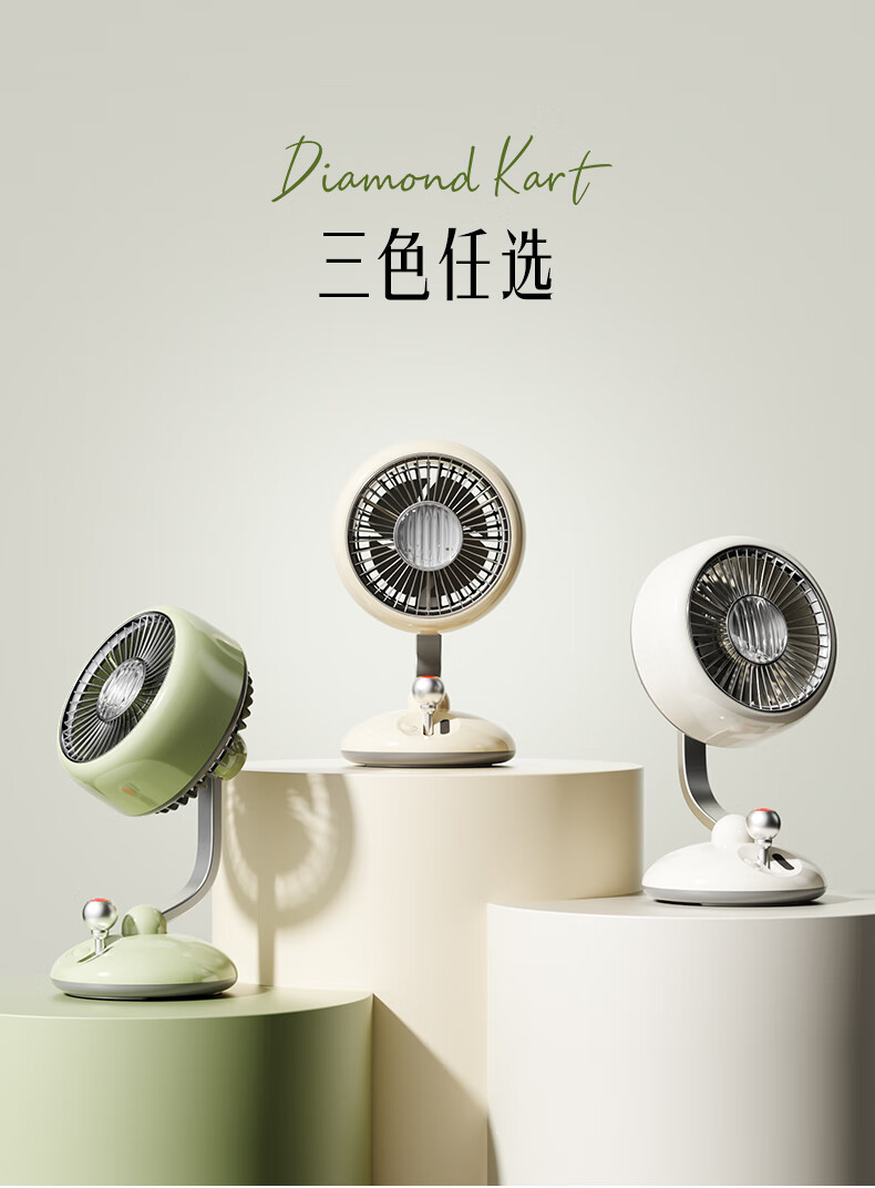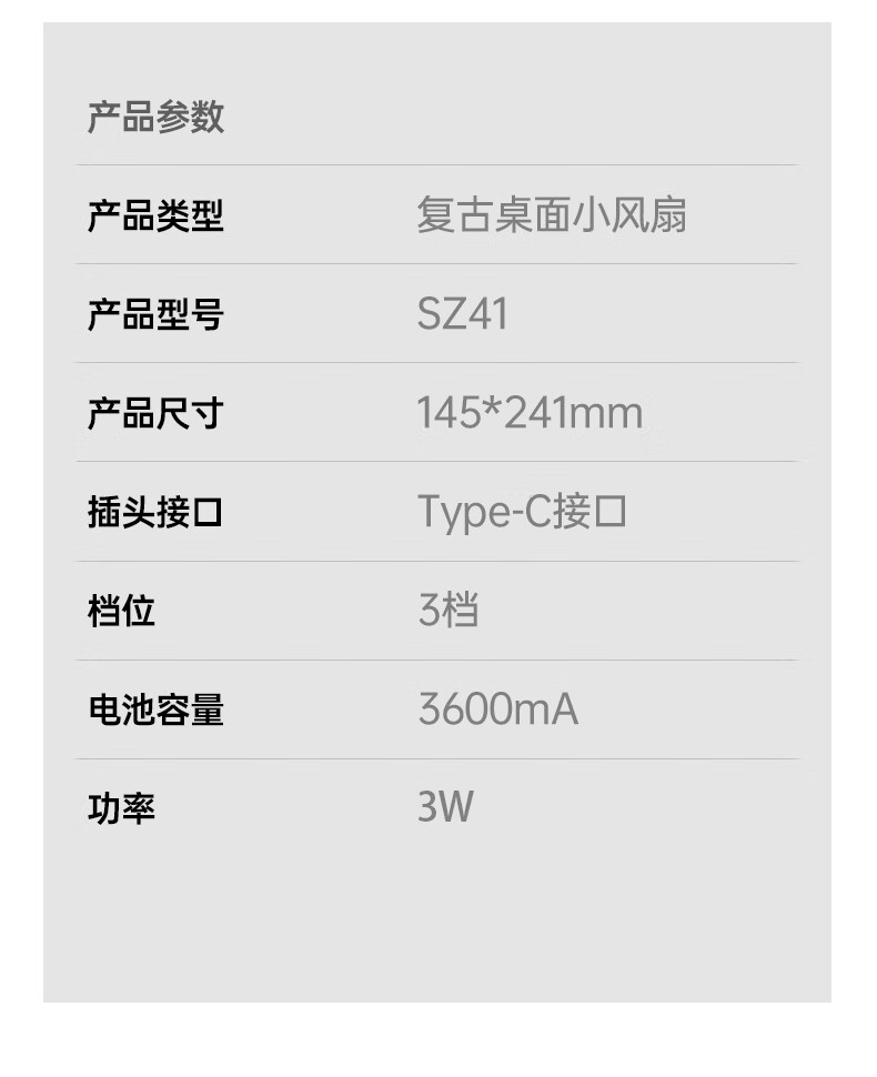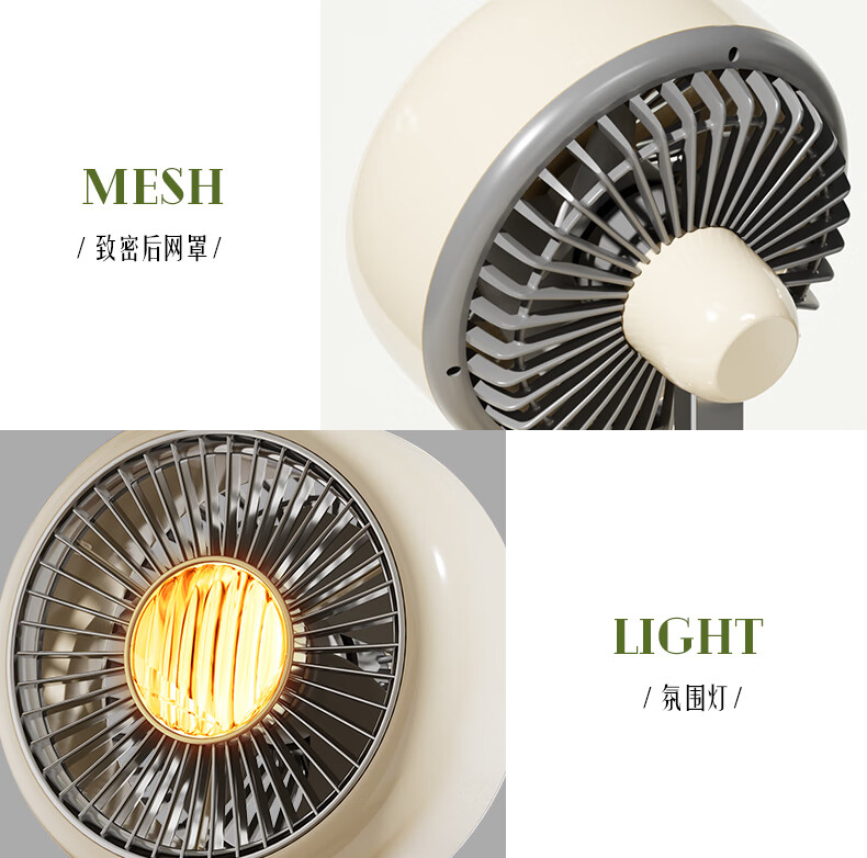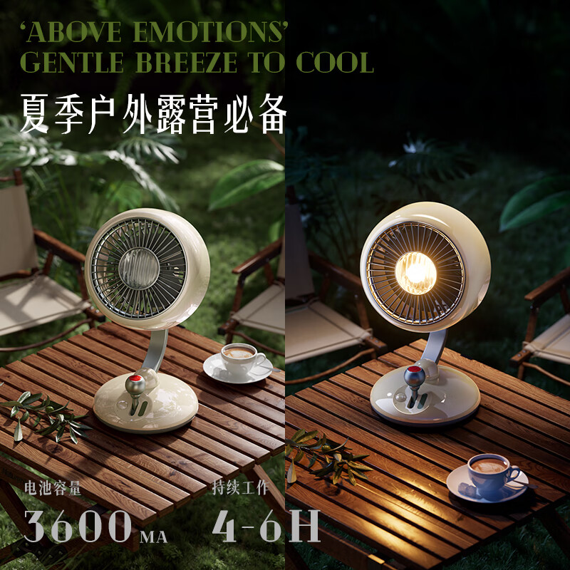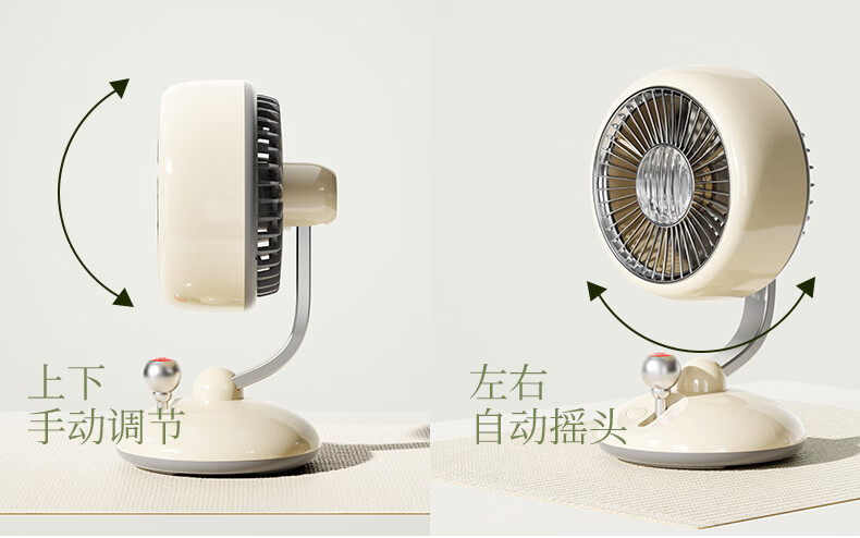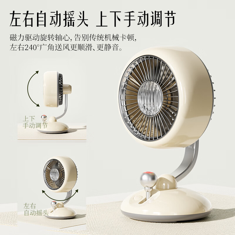 复古外观 + 氛围灯,3600mAh 长续航;240° 广角摇头,3 档风速,柔和循环风不直吹;Type-C 快充,小巧精致,多场景百搭使用