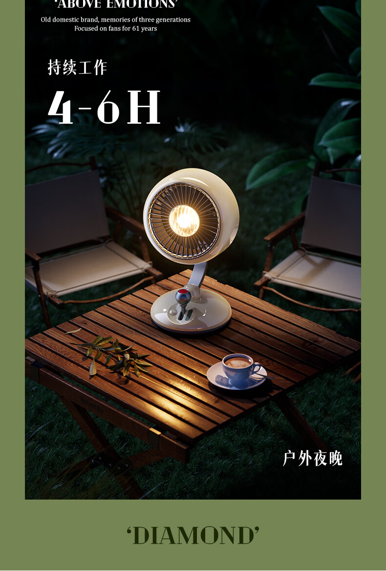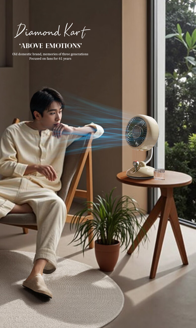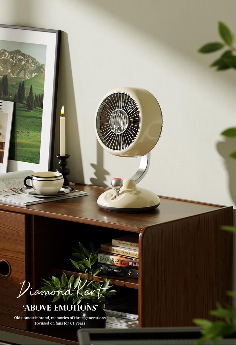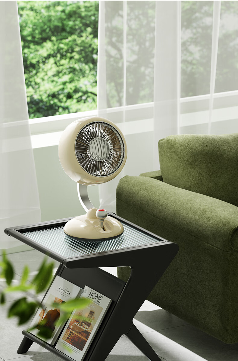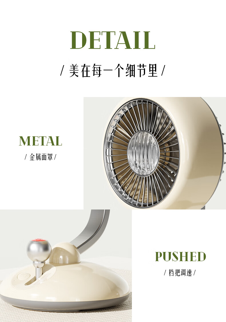 复古外观 + 氛围灯,3600mAh 长续航;240° 广角摇头,3 档风速,柔和循环风不直吹;Type-C 快充,小巧精致,多场景百搭使用
