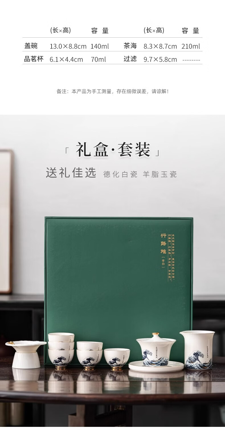 材质:盖碗*1,壶承*1,茶海*1,茶杯*6,茶漏*1,礼盒