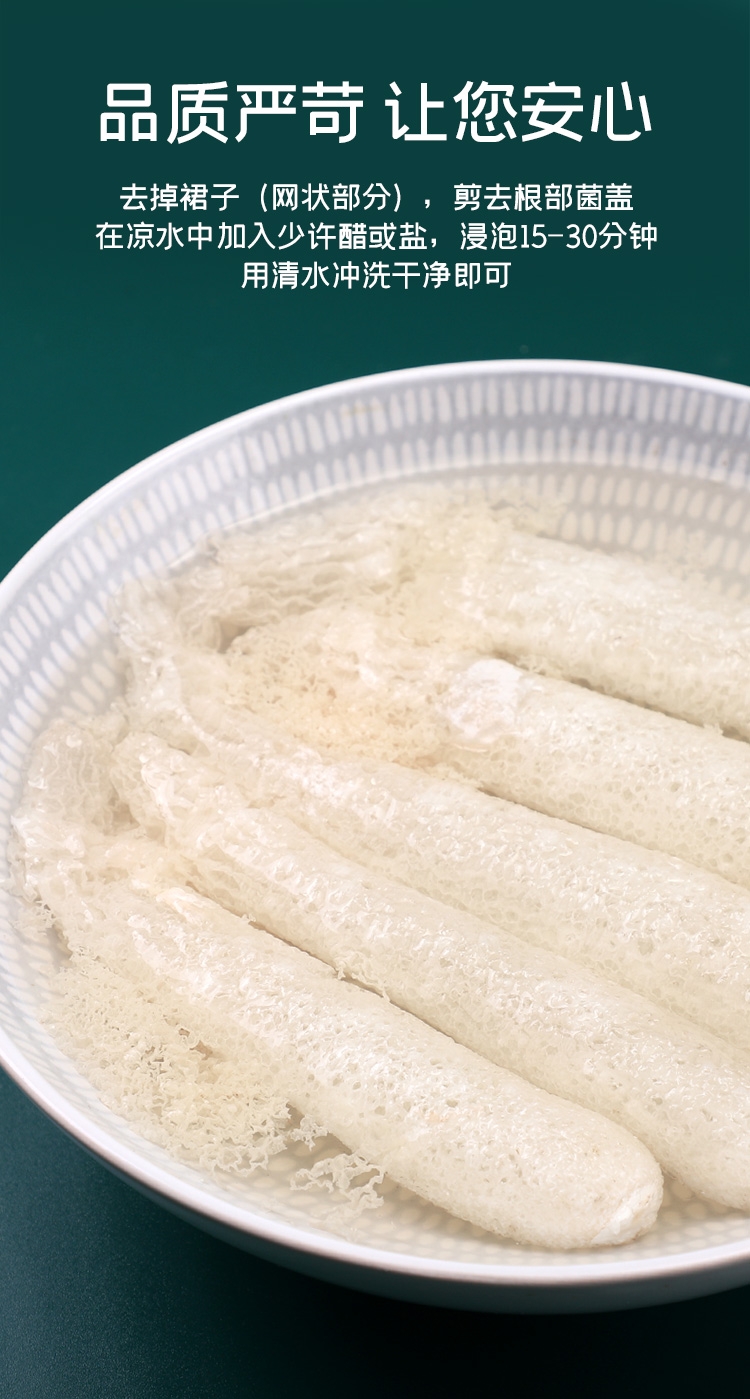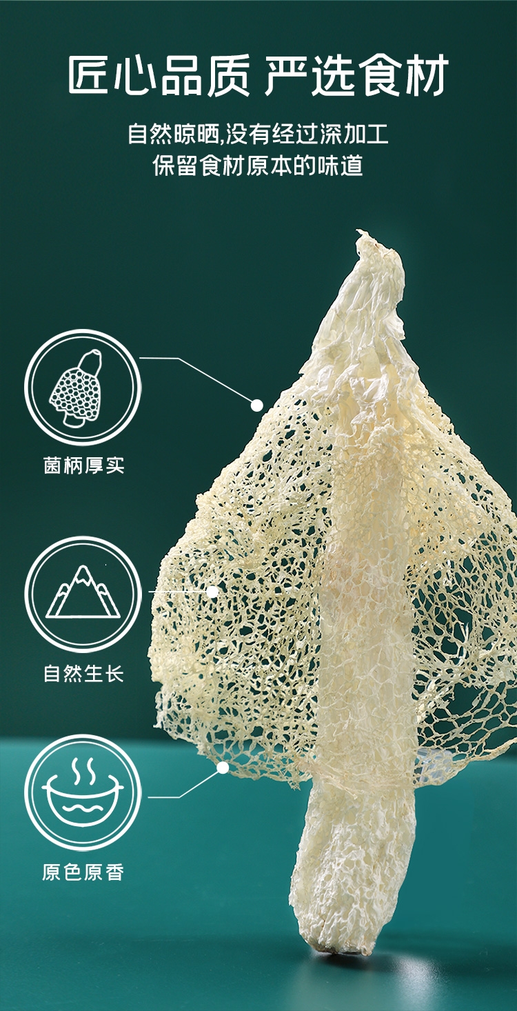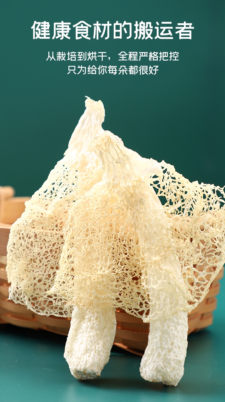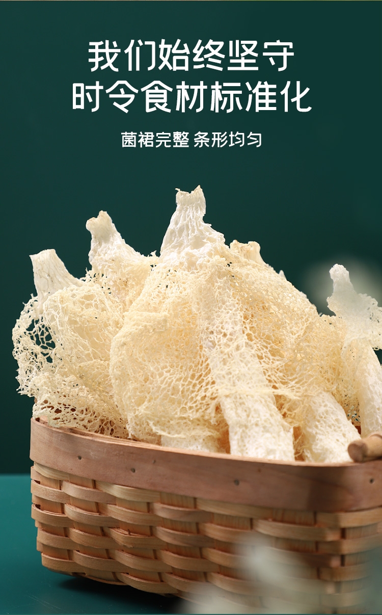自然晾晒 菇柄厚嫩;菌裙完整 条形均匀;追求溯源 品质把控