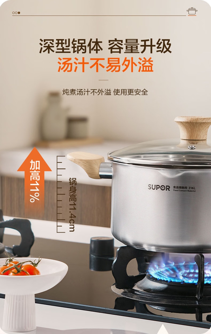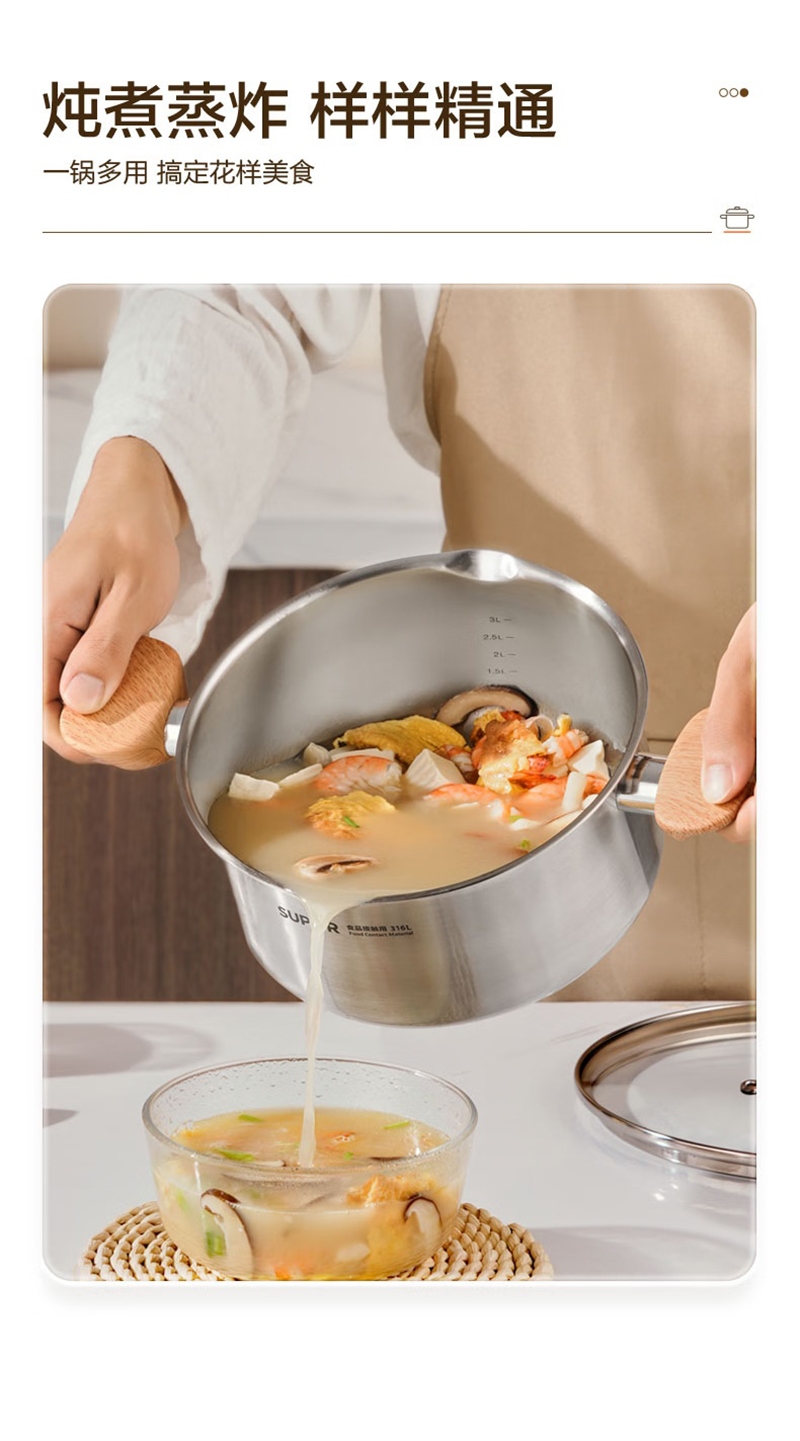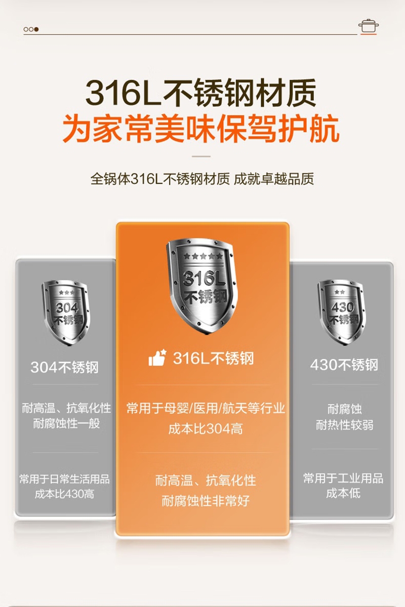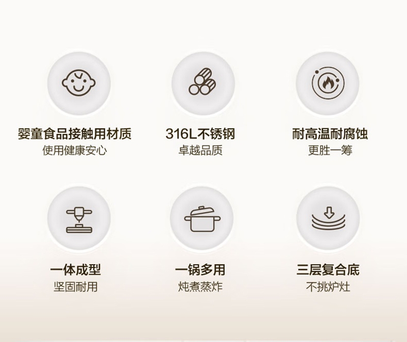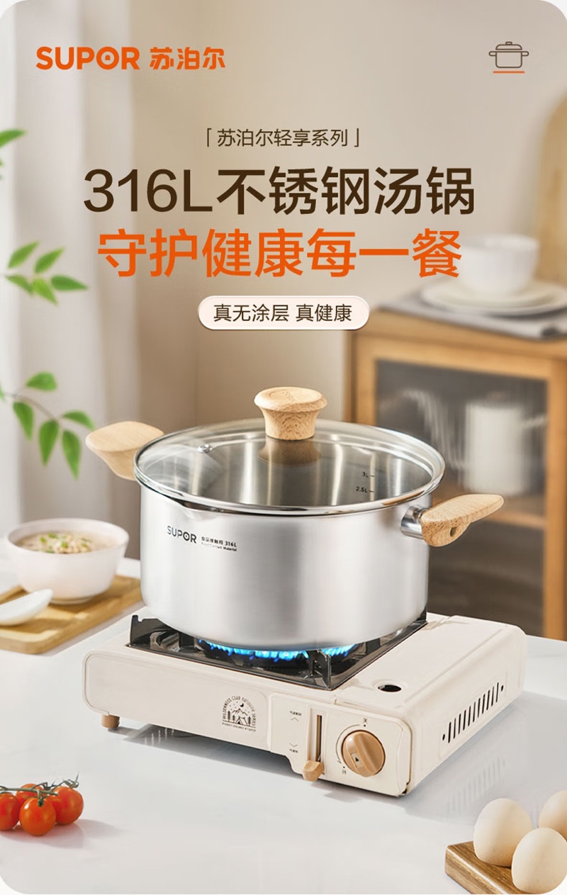 316L不锈钢汤锅守护健康每一餐真无涂层真健康;婴童食品接触用不锈钢宝宝入口更安心;一体成型锅身坚固耐用不易变形
