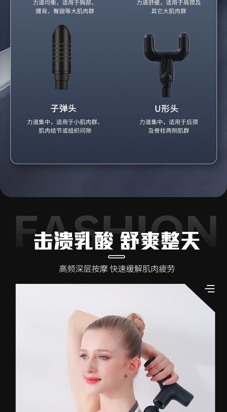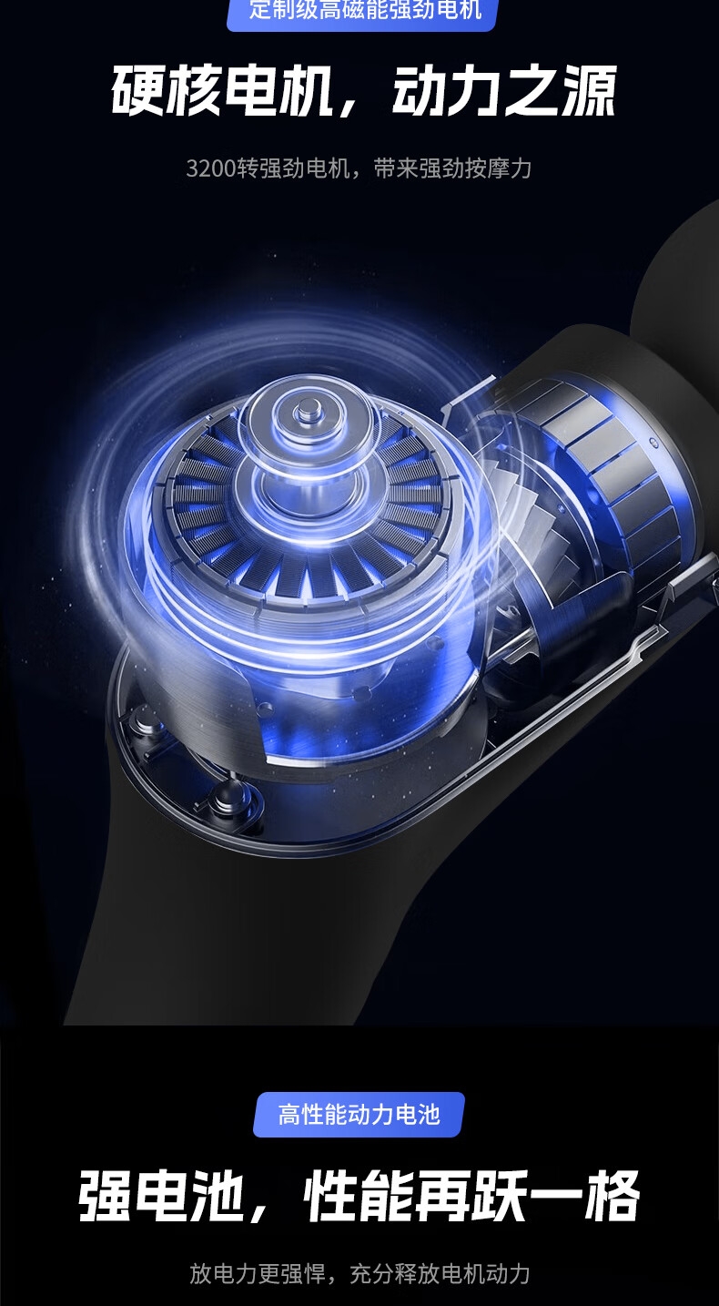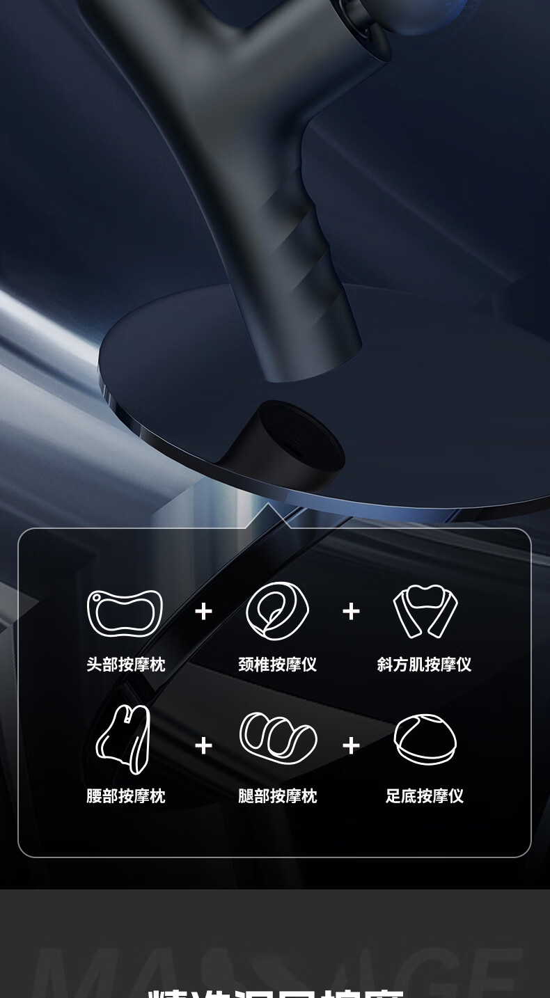耐摔防滑,降低噪音;高扭矩大功率无刷电机安全耐用;按摩头可以随意切换
