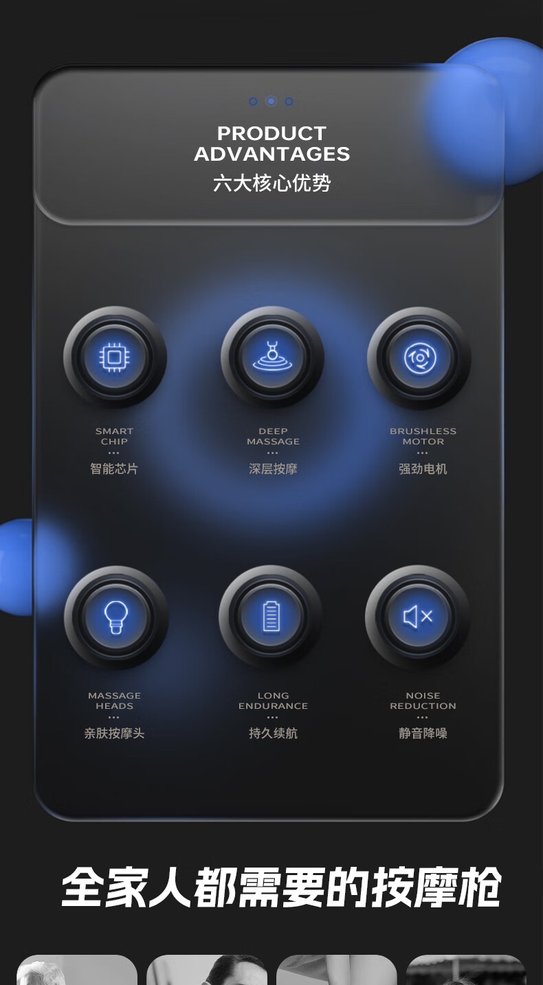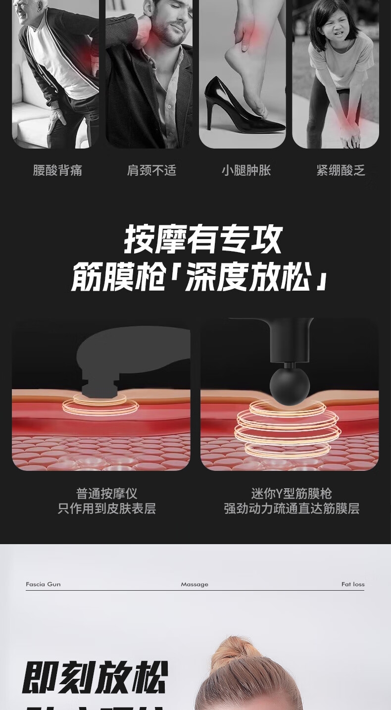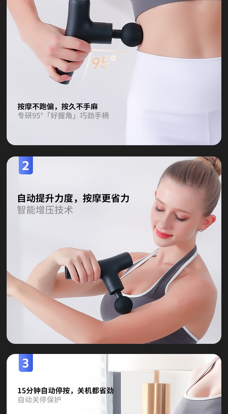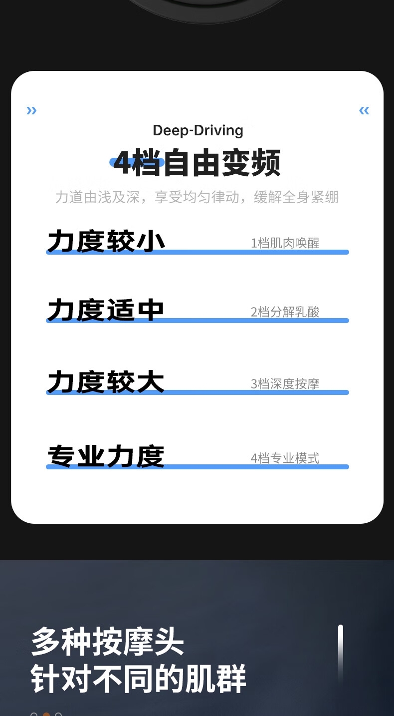 耐摔防滑,降低噪音;高扭矩大功率无刷电机安全耐用;按摩头可以随意切换