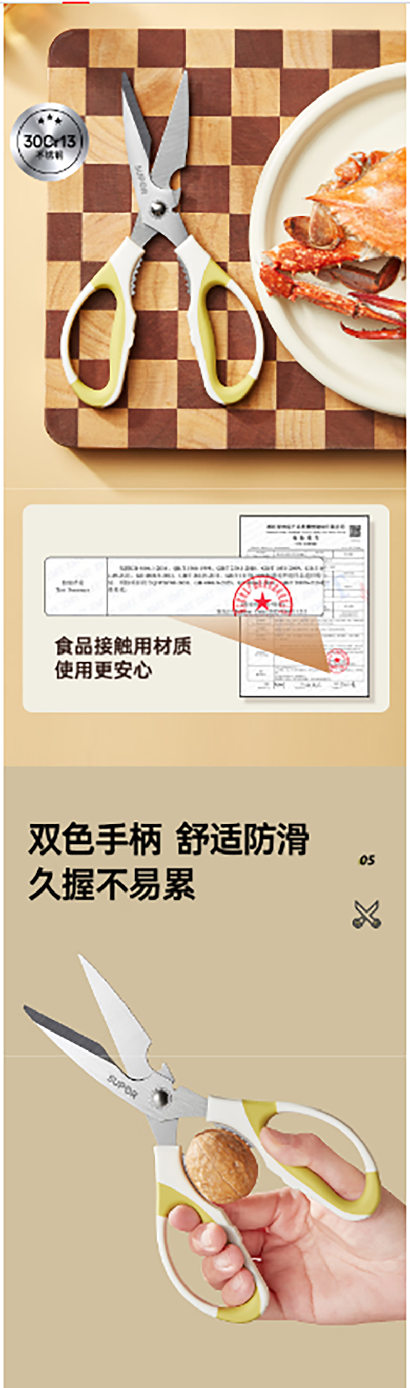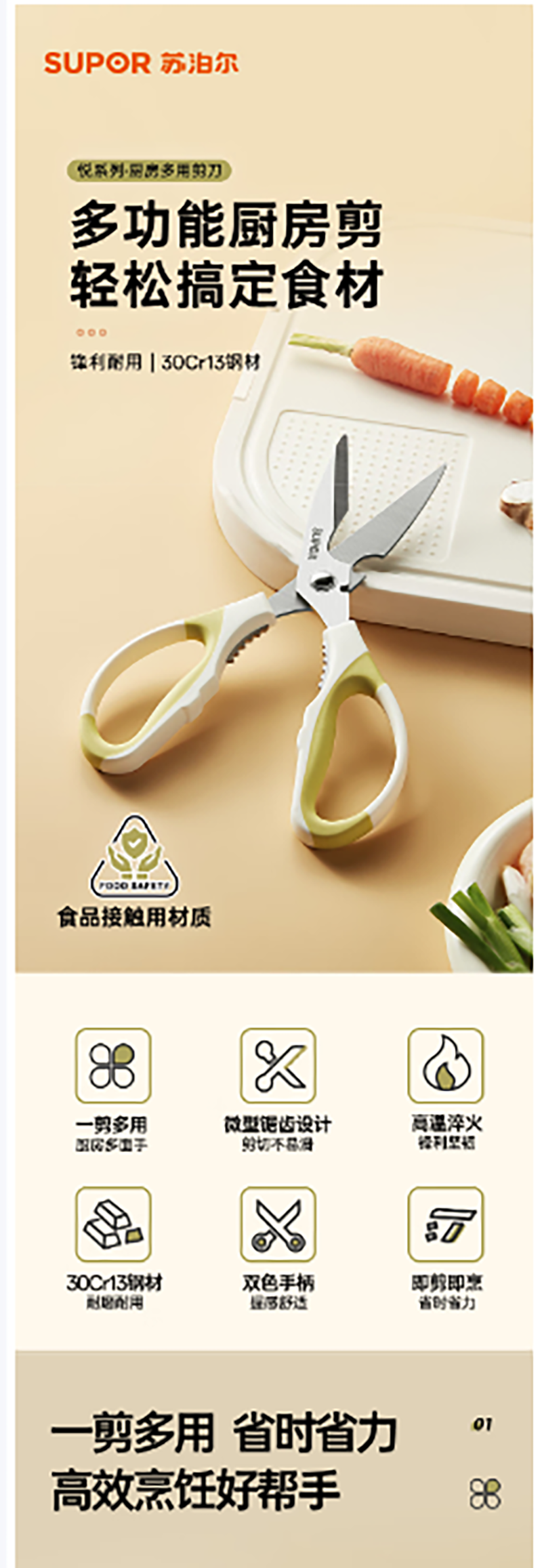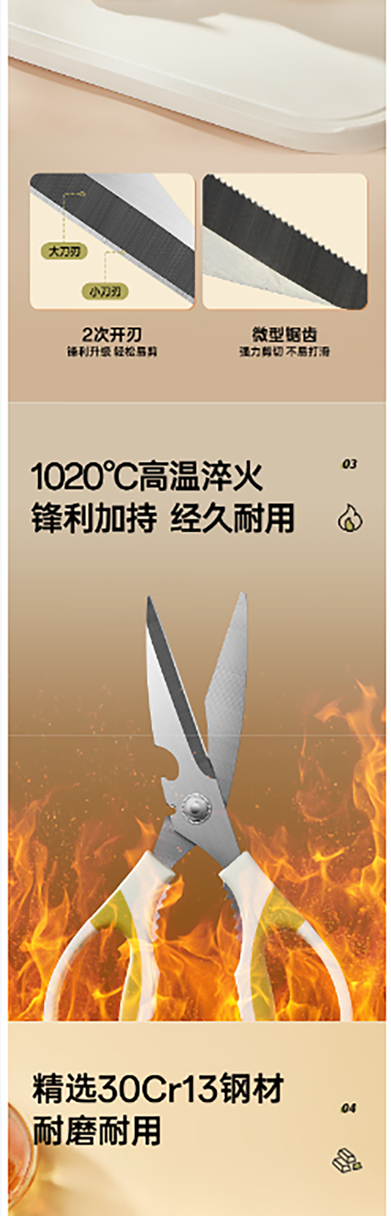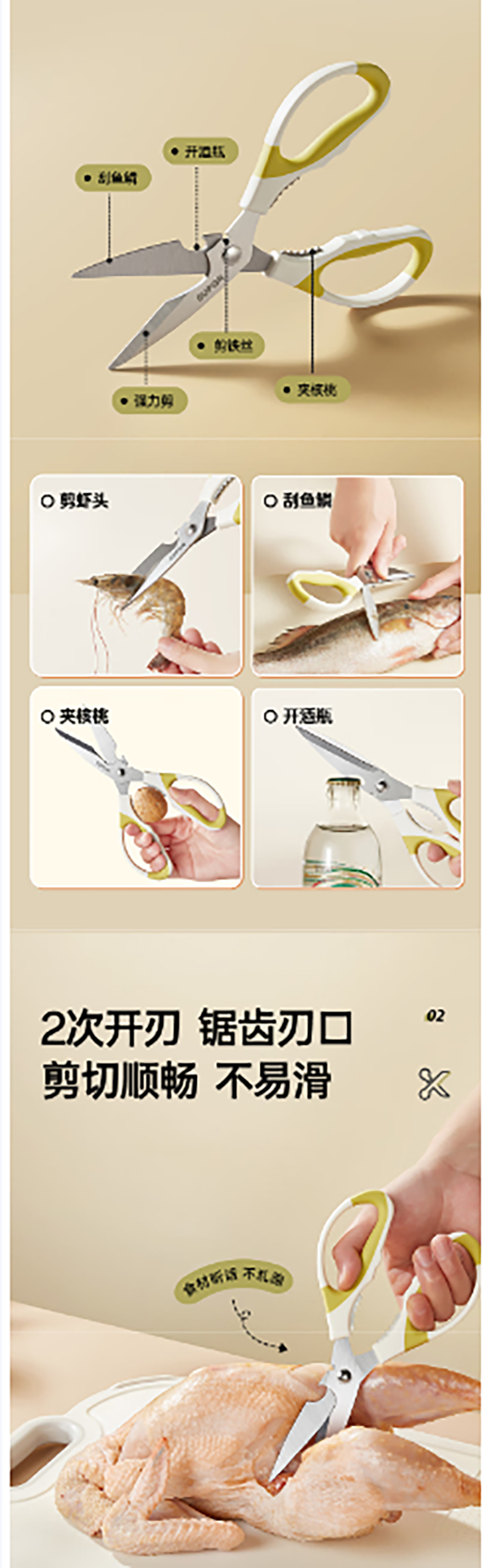 多功能厨房剪轻松搞定食材;一剪多用 省时省力高效烹饪好帮手;2次开刃 锯齿刃口剪切顺畅 不易滑