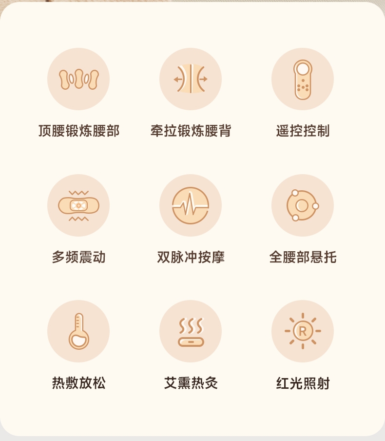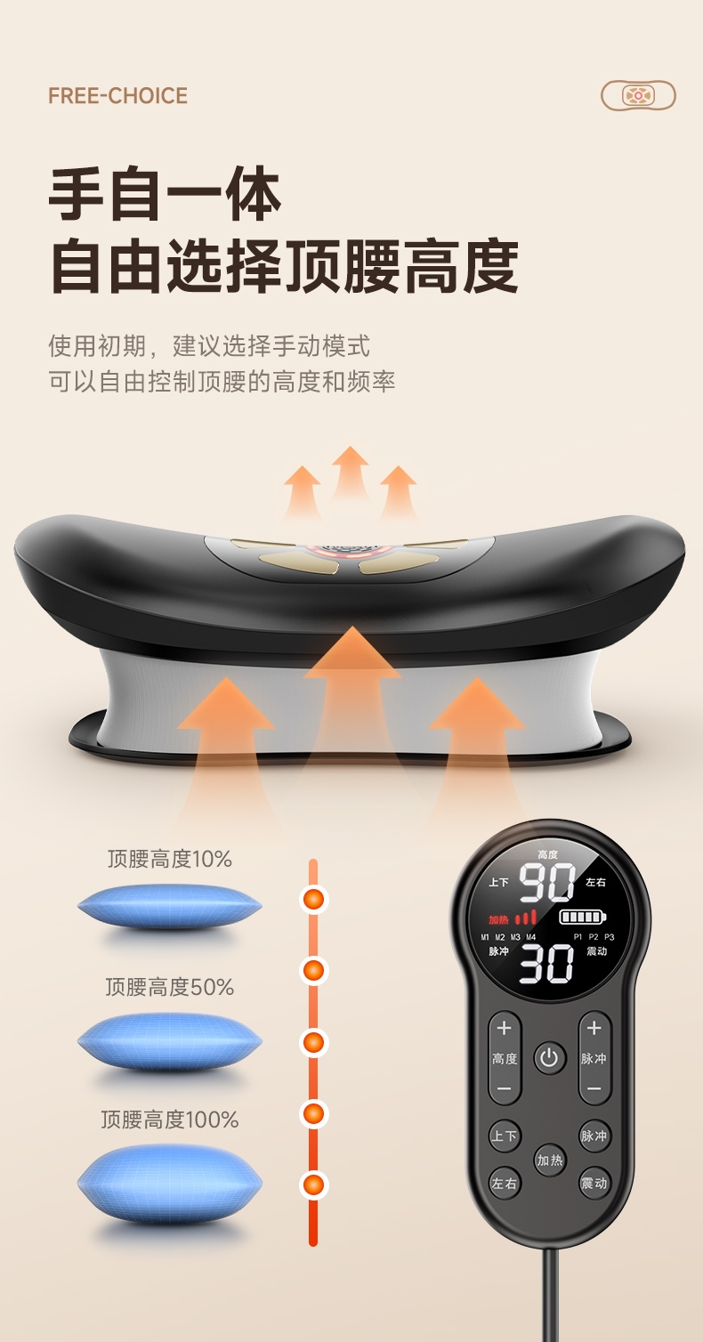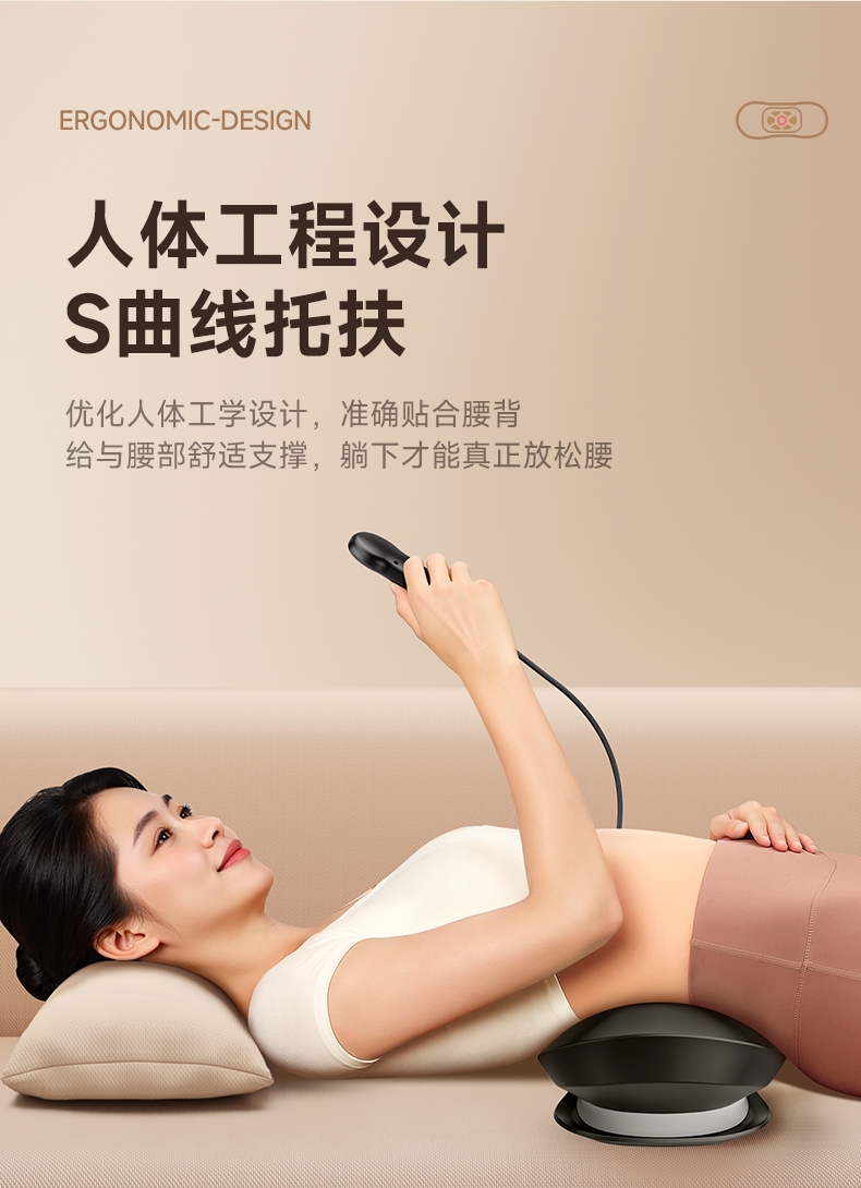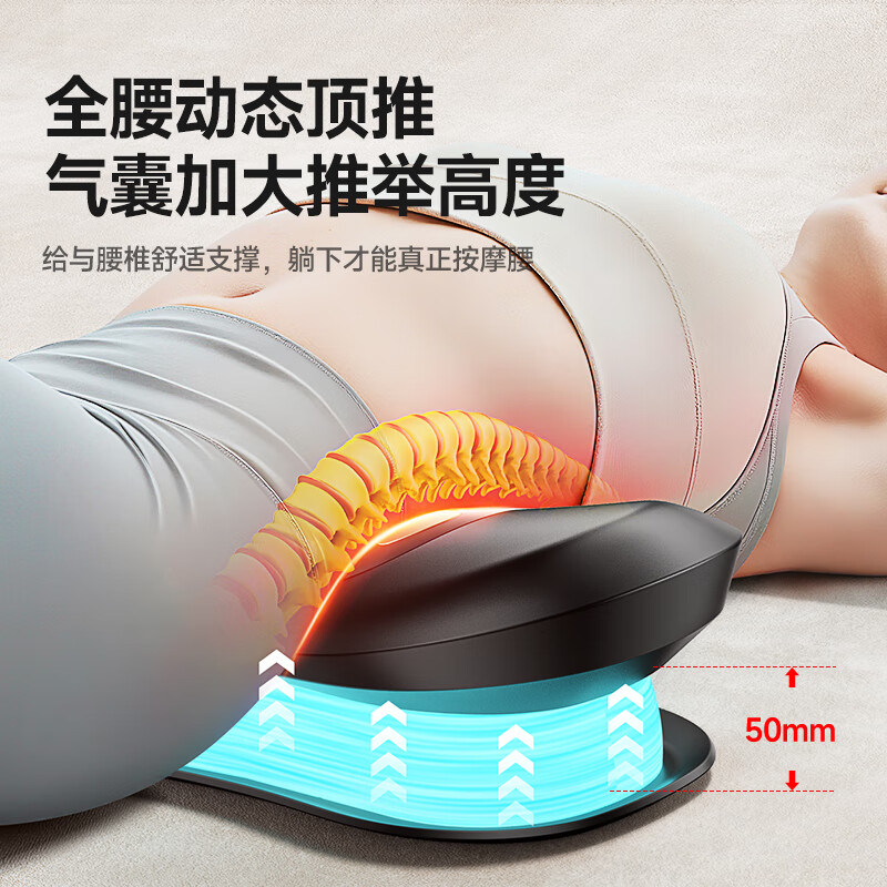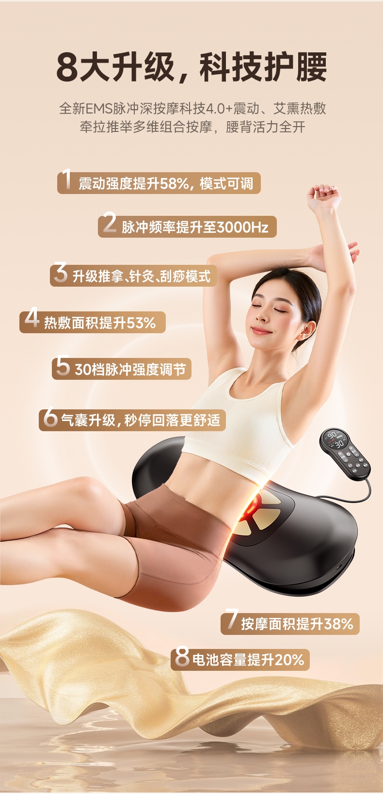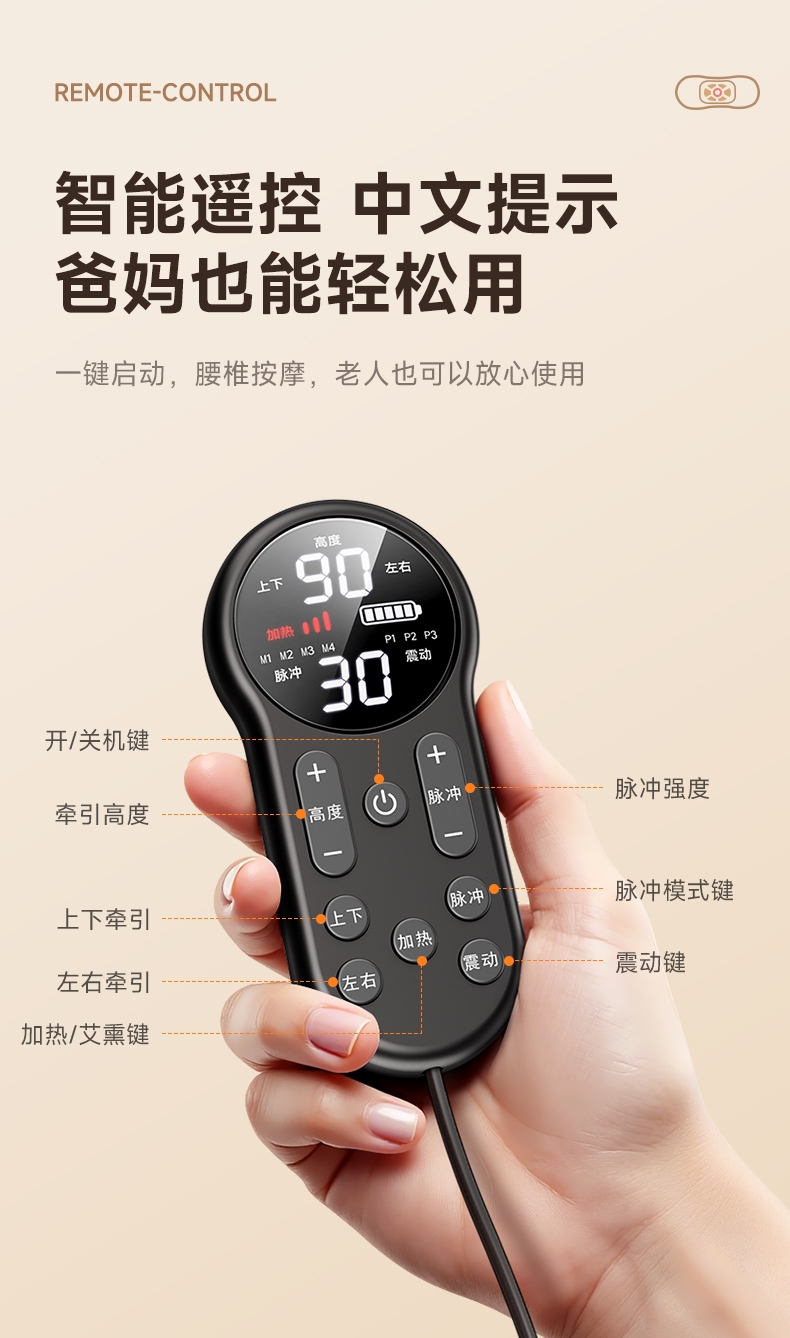 30档脉冲强度 4组模式 组合刺激更酣畅;气囊牵拉摇摆动态伸展腰椎,提升肌肉活力,放松腰椎;智能遥控 中文提示爸妈也能轻松用 一键启动