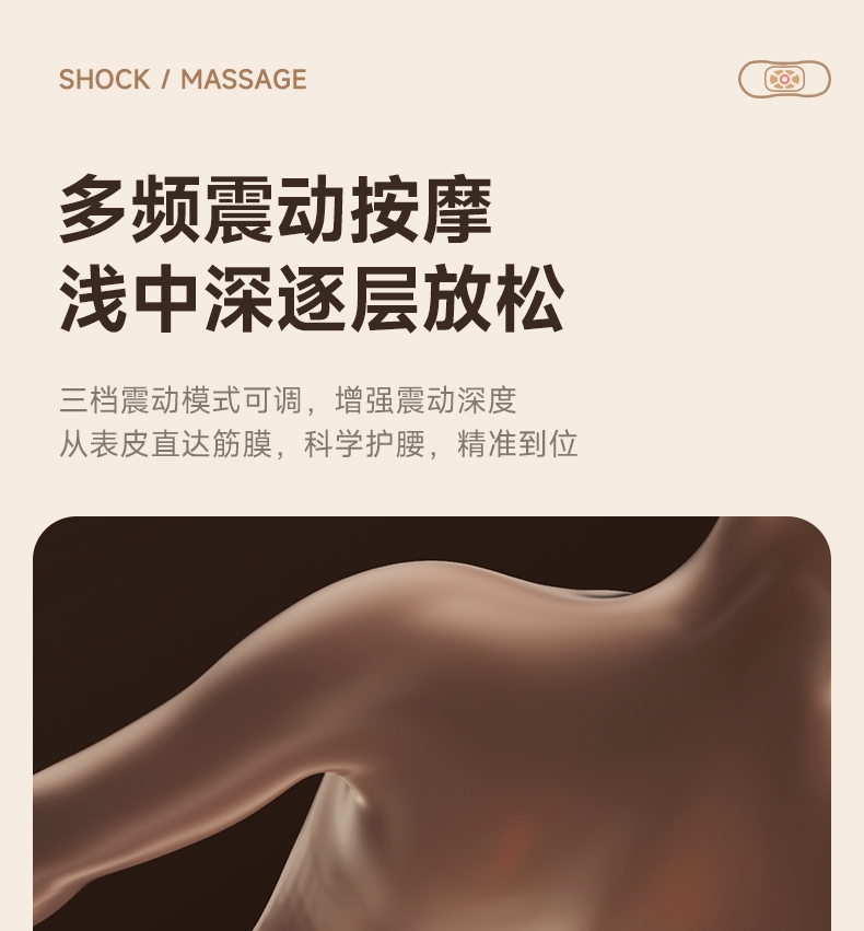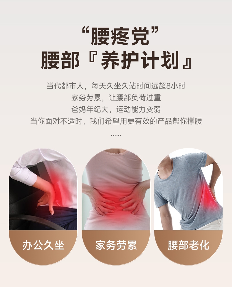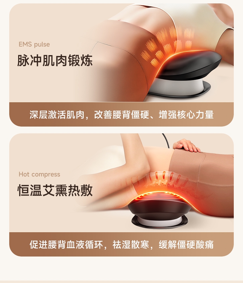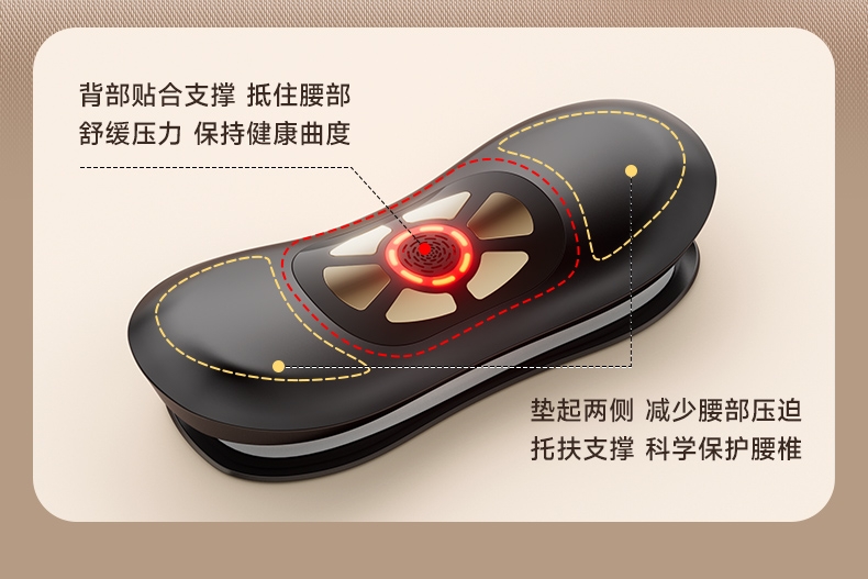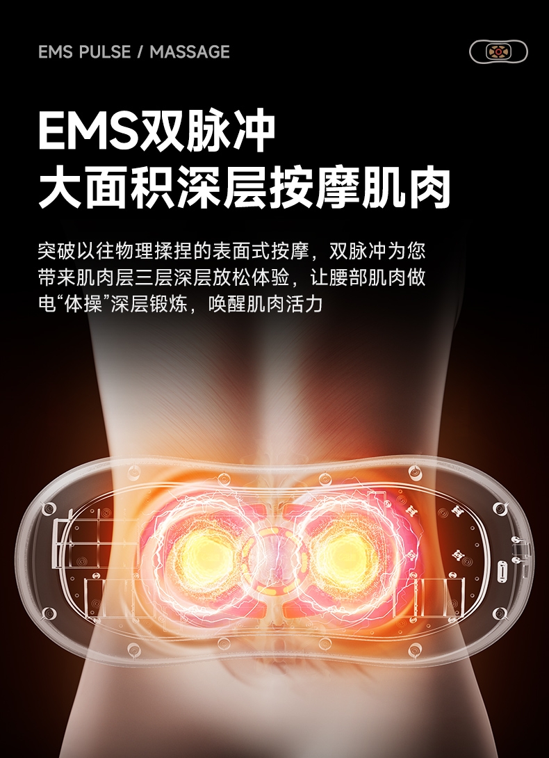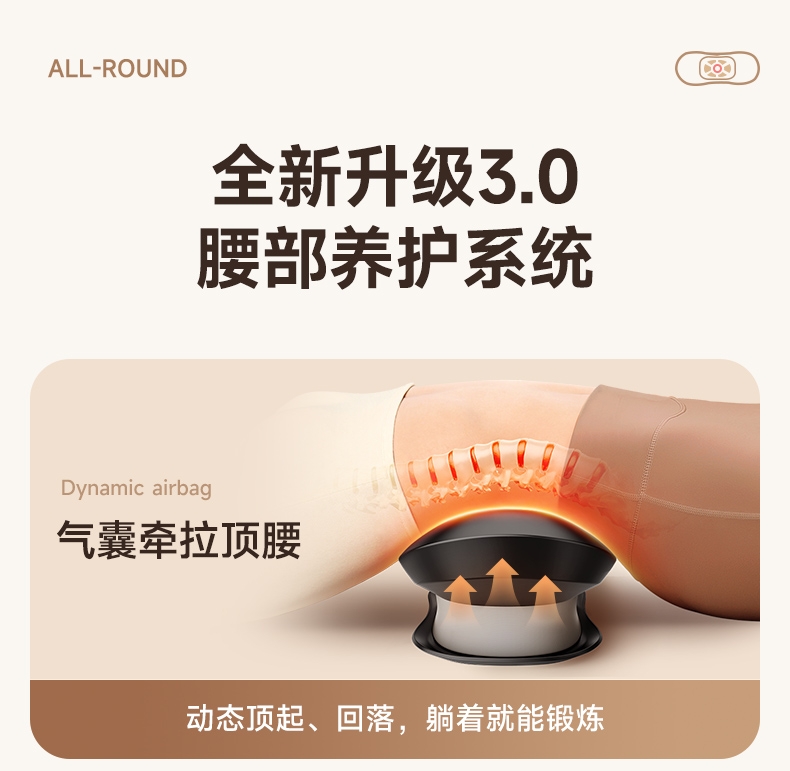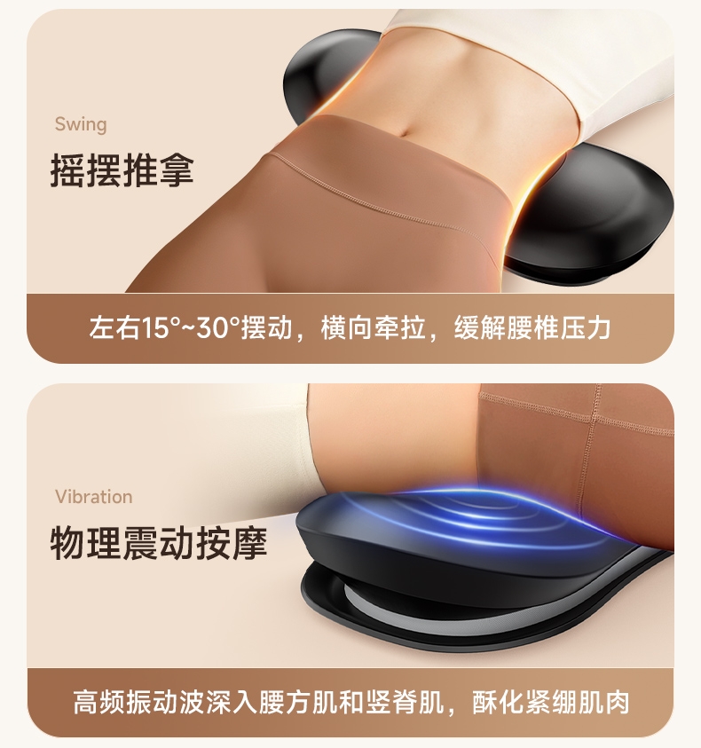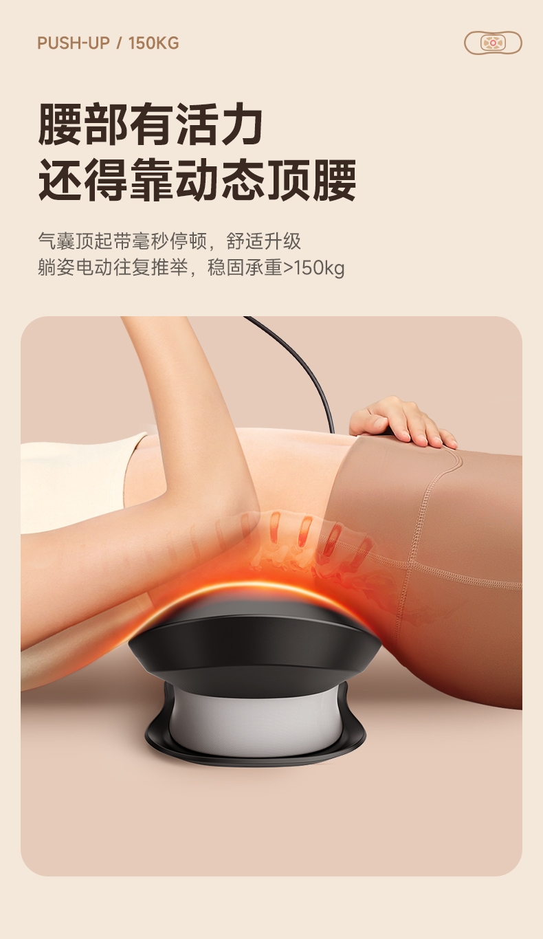 30档脉冲强度 4组模式 组合刺激更酣畅;气囊牵拉摇摆动态伸展腰椎,提升肌肉活力,放松腰椎;智能遥控 中文提示爸妈也能轻松用 一键启动