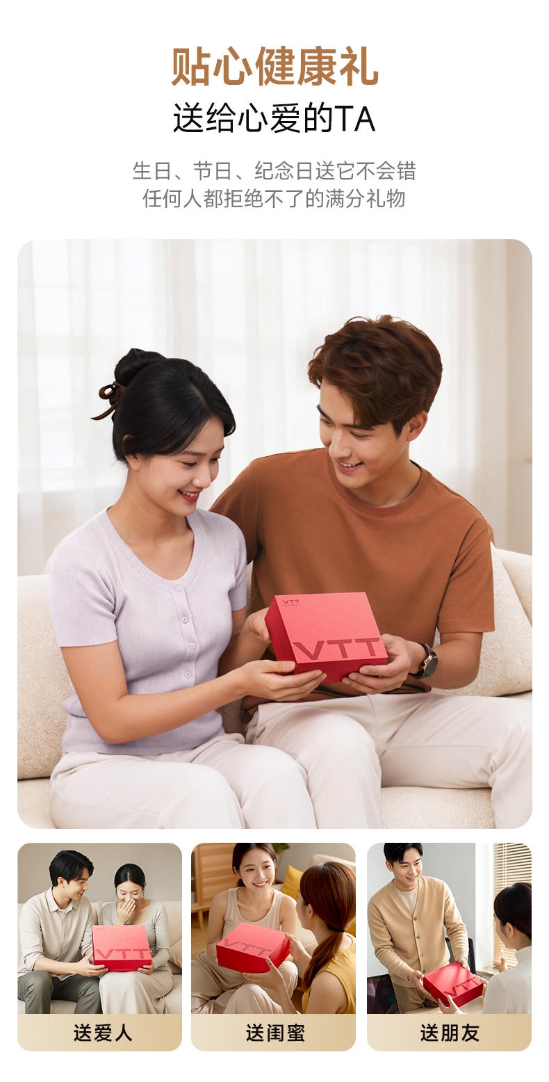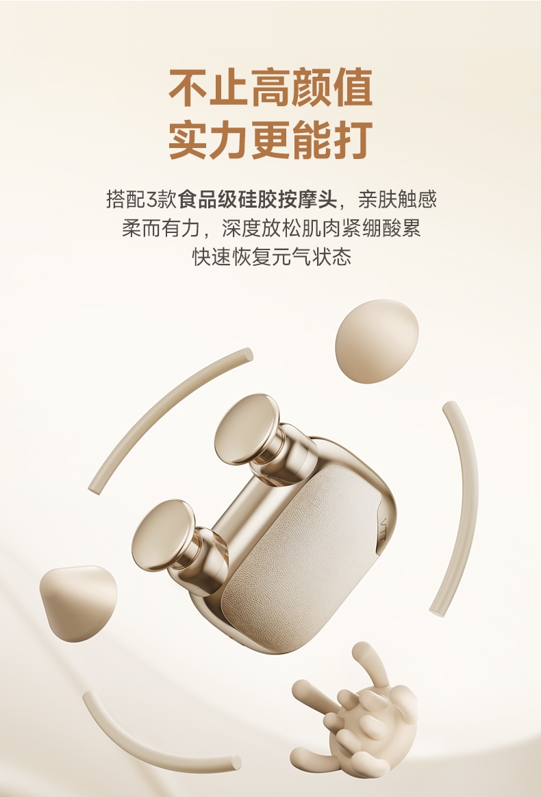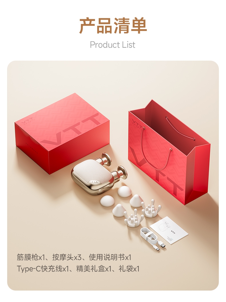配置清单:筋膜枪x1、按摩头x3、使用说明书x1,Type-C快充线x1、精美礼盒x1、礼袋x1
