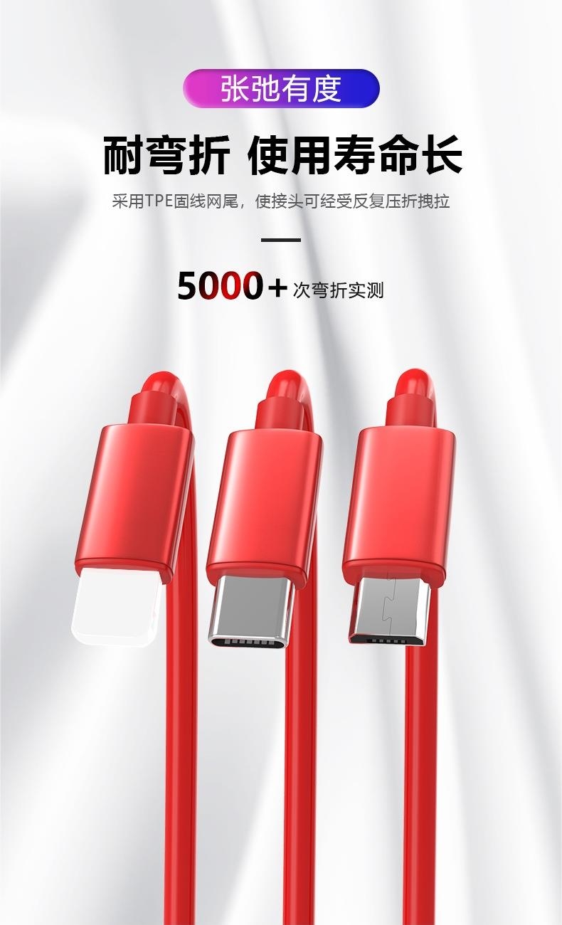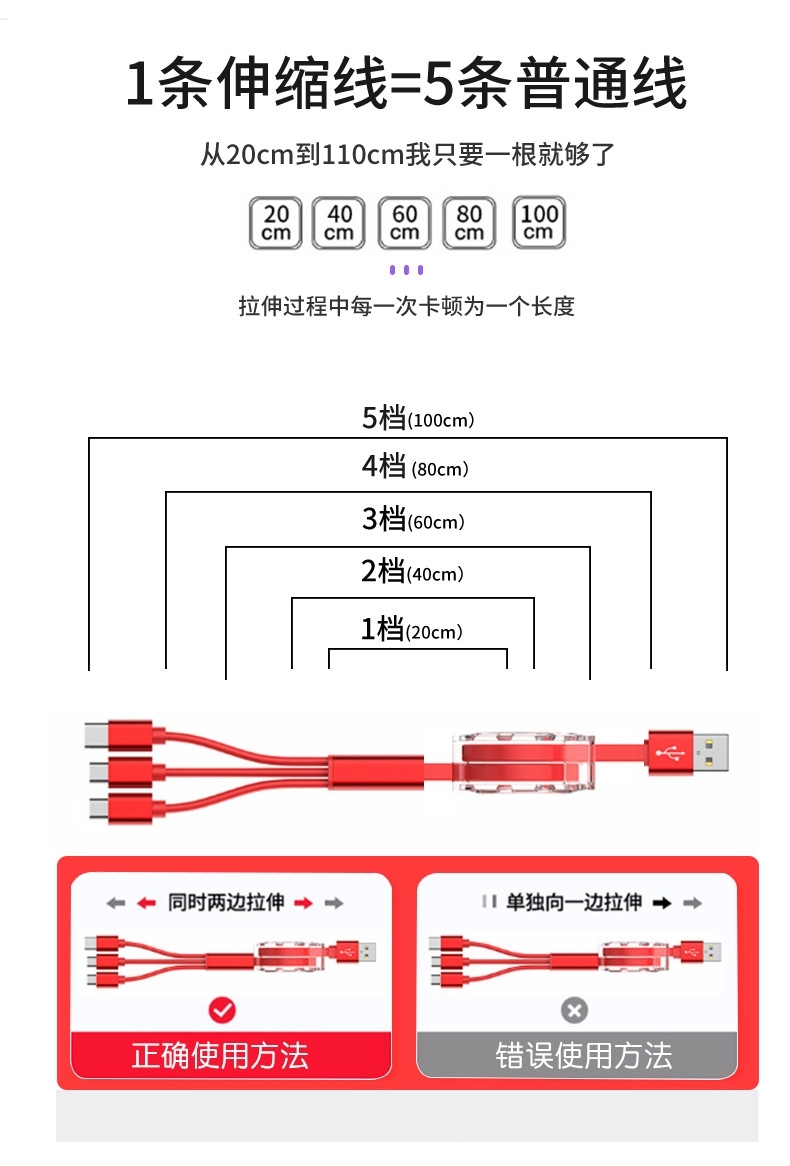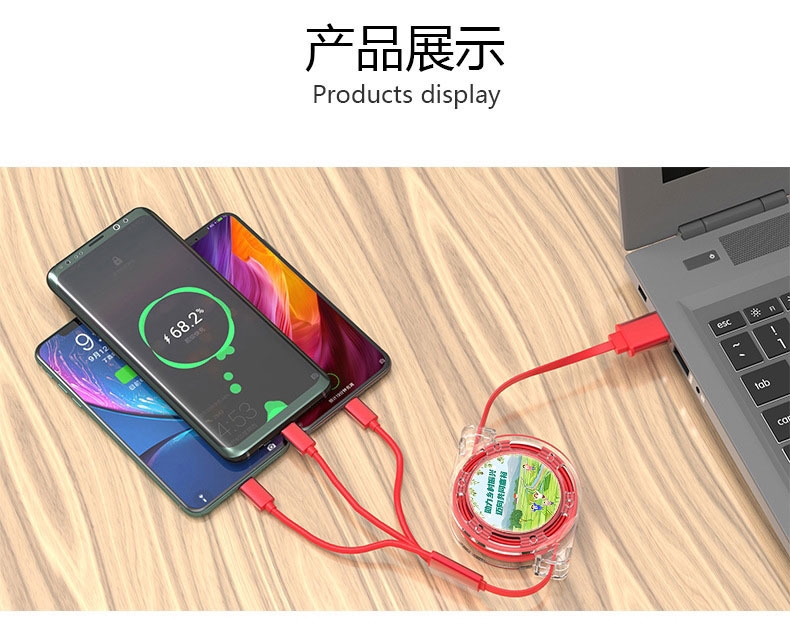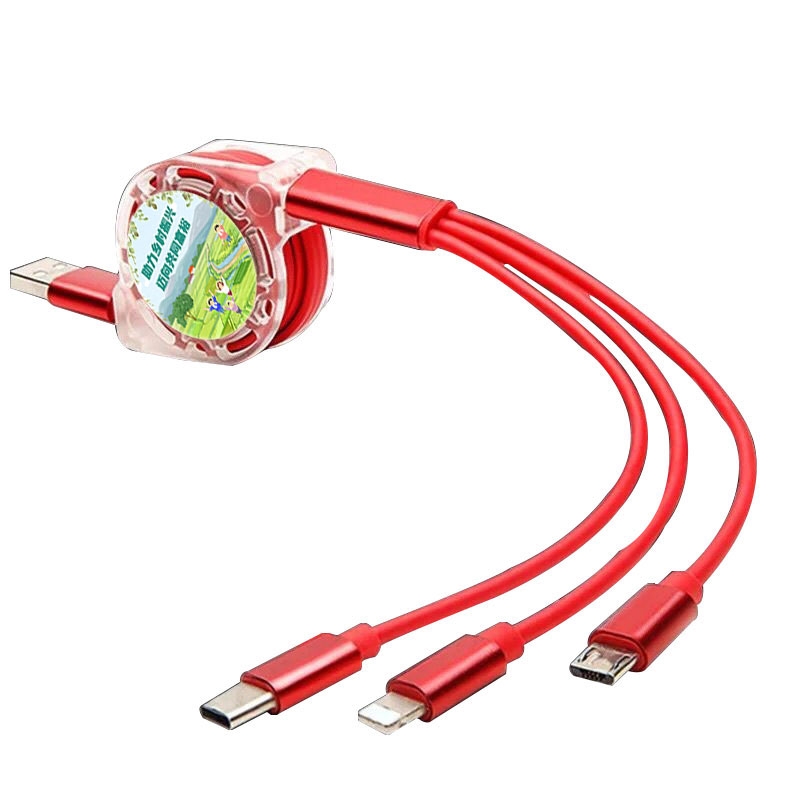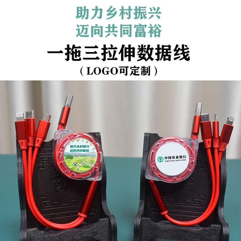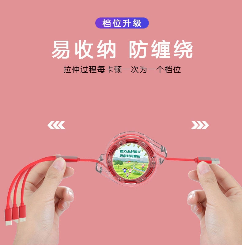 一拖三数据线:可充电任何手机,数码设备接口;自由伸缩,方便收纳;支持定制LOGO