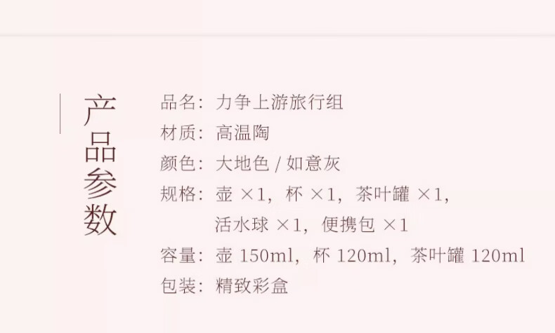 配 置:壶×1,杯×1,茶叶罐×1,活水球×1,便携包×1