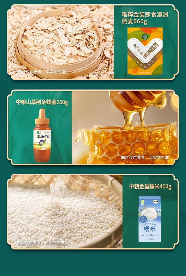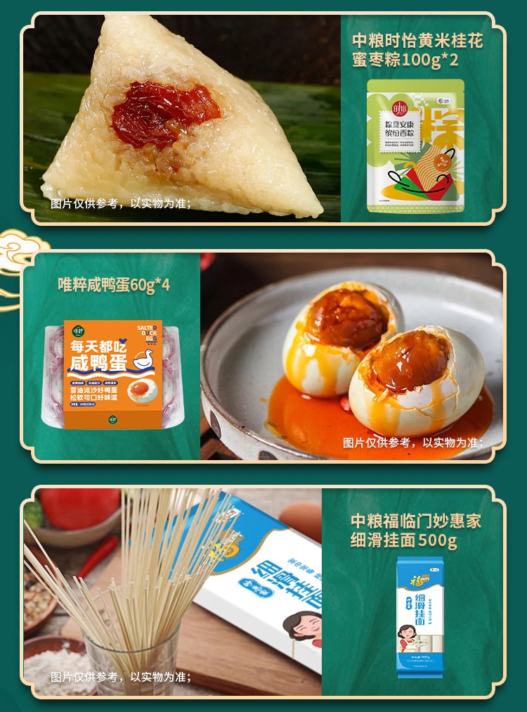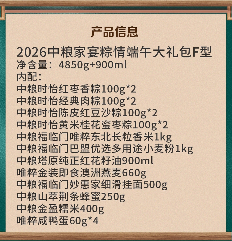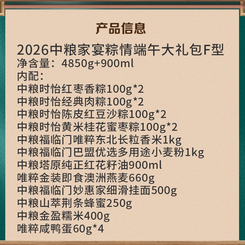配置清单:净含量:4850g+900ml 内配: 中粮时怡红枣香粽100g*2 中粮时怡经典肉粽100g*2 中粮时怡陈皮红豆沙粽100g*2 中粮时怡黄米桂花蜜枣粽100g*2 中粮福临门唯粹东北长粒香米1kg 中粮福临门巴盟优选多用途小麦粉1kg 中粮塔原纯正红花籽油900ml 唯粹金装即食澳洲燕麦660g 中粮福临门妙惠家细滑挂面500g 中粮山萃荆条纯正蜜250g 中粮金盈糯米400g 唯粹咸鸭蛋60g*4