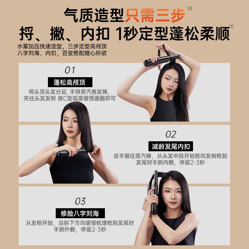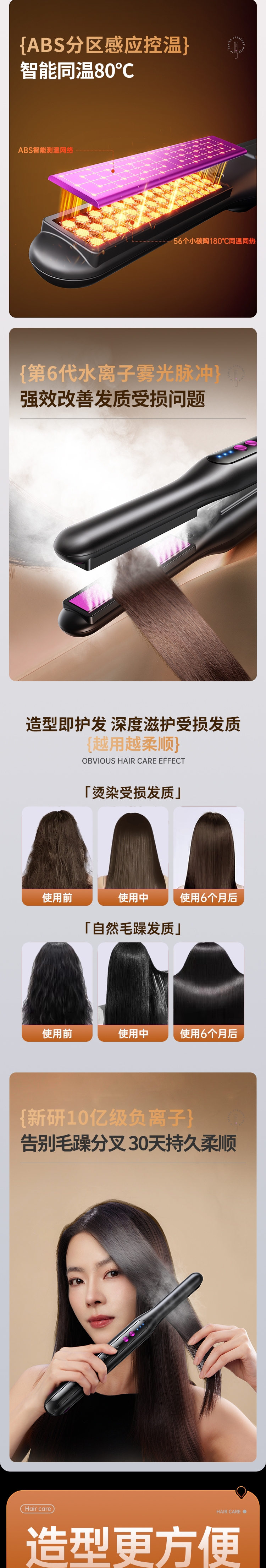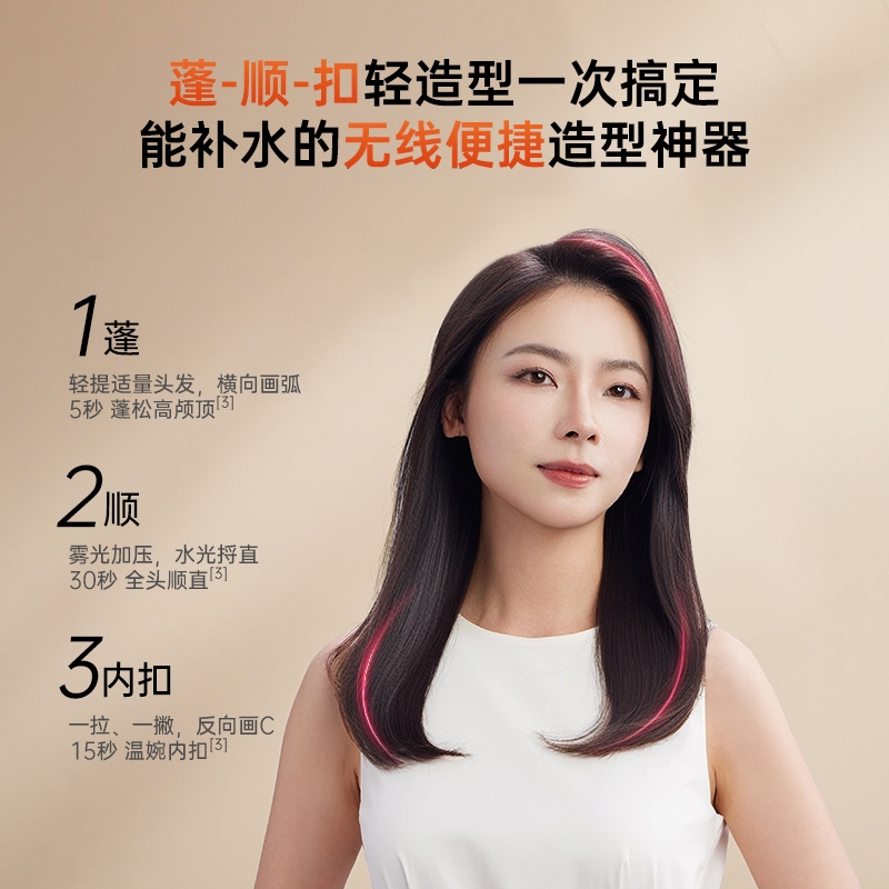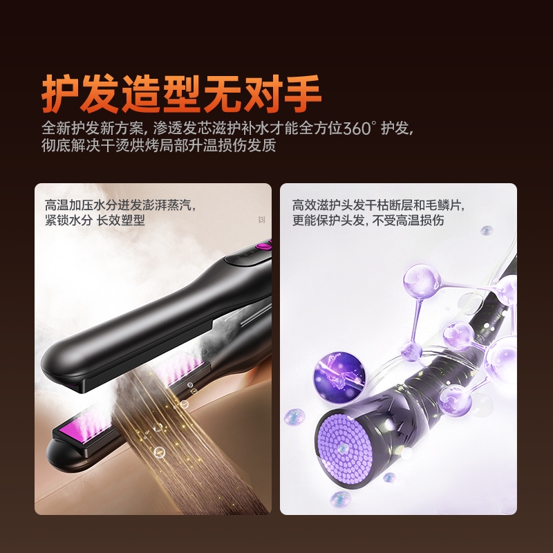 10 亿级负离子护发,抚平毛躁,直发不伤发;无线便携设计,防烫安全,外出随身好用;轻松打造高颅顶,持久定型,送礼超合适
