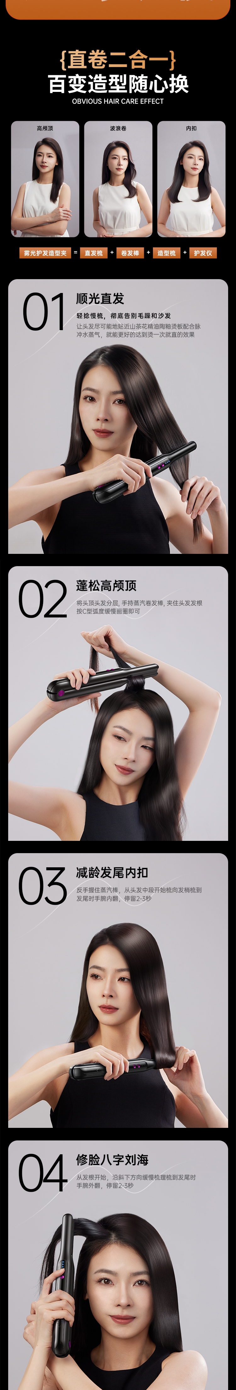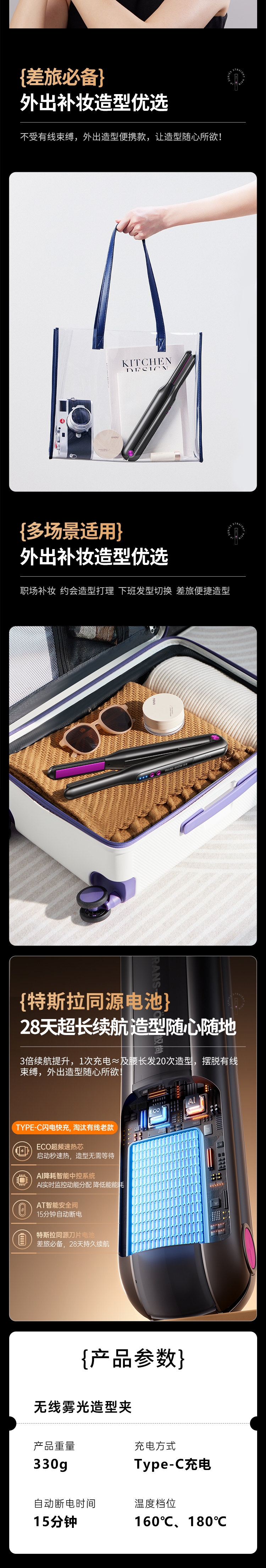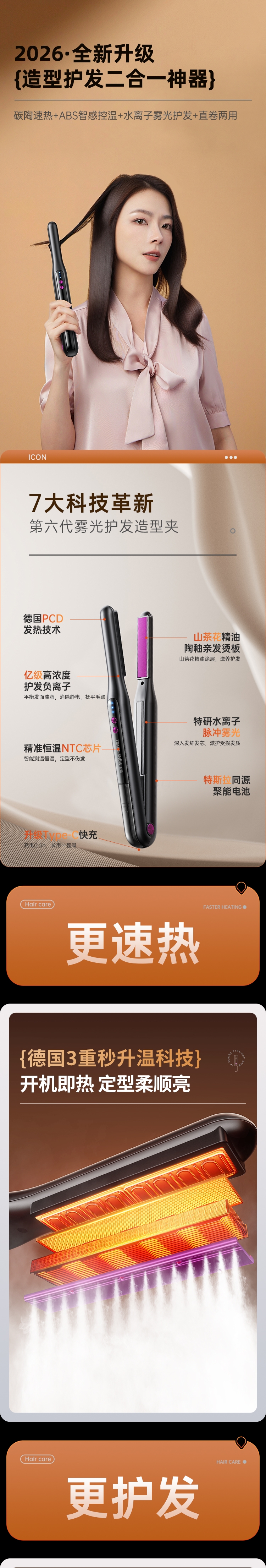 10 亿级负离子护发,抚平毛躁,直发不伤发;无线便携设计,防烫安全,外出随身好用;轻松打造高颅顶,持久定型,送礼超合适
