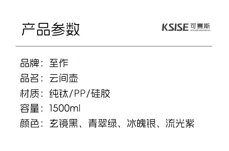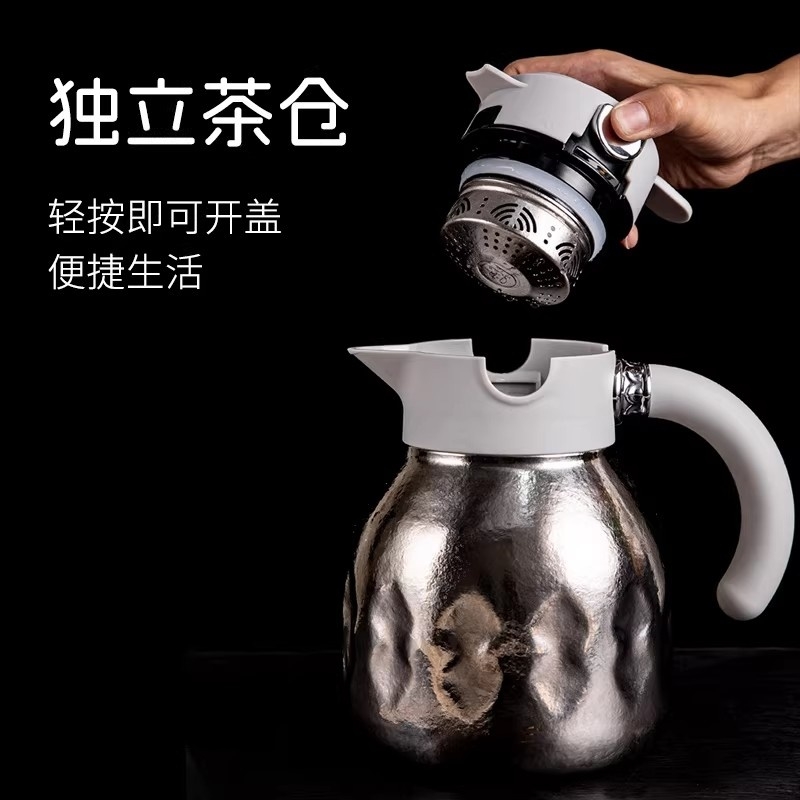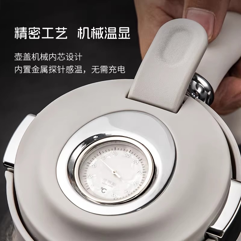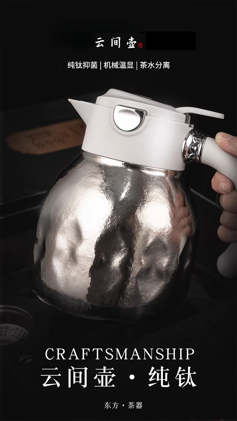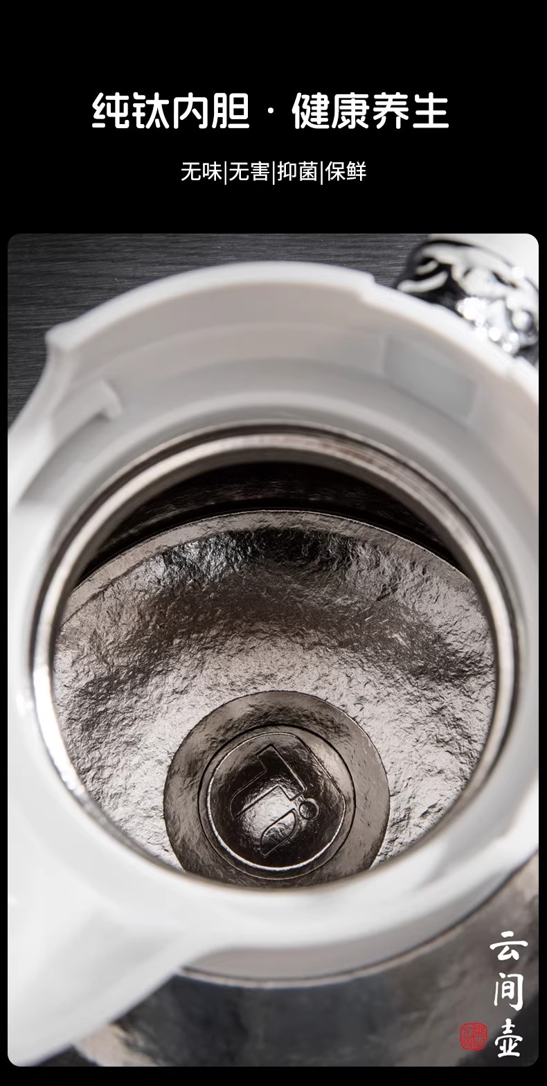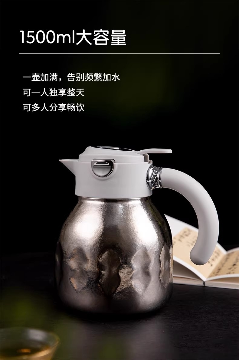 1500ml大容量,可一人独享整天 可多人分享畅饮;纯钛内胆·健康养生 无味|无害|抑菌|保鲜;精密工艺 机械温显 壶盖机械内芯设计 内置金属探针;按压开关·方便快捷 轻按即可开盖便捷生活;可拆卸独立茶仓 纯钛材质 细密滤网,隔绝茶叶