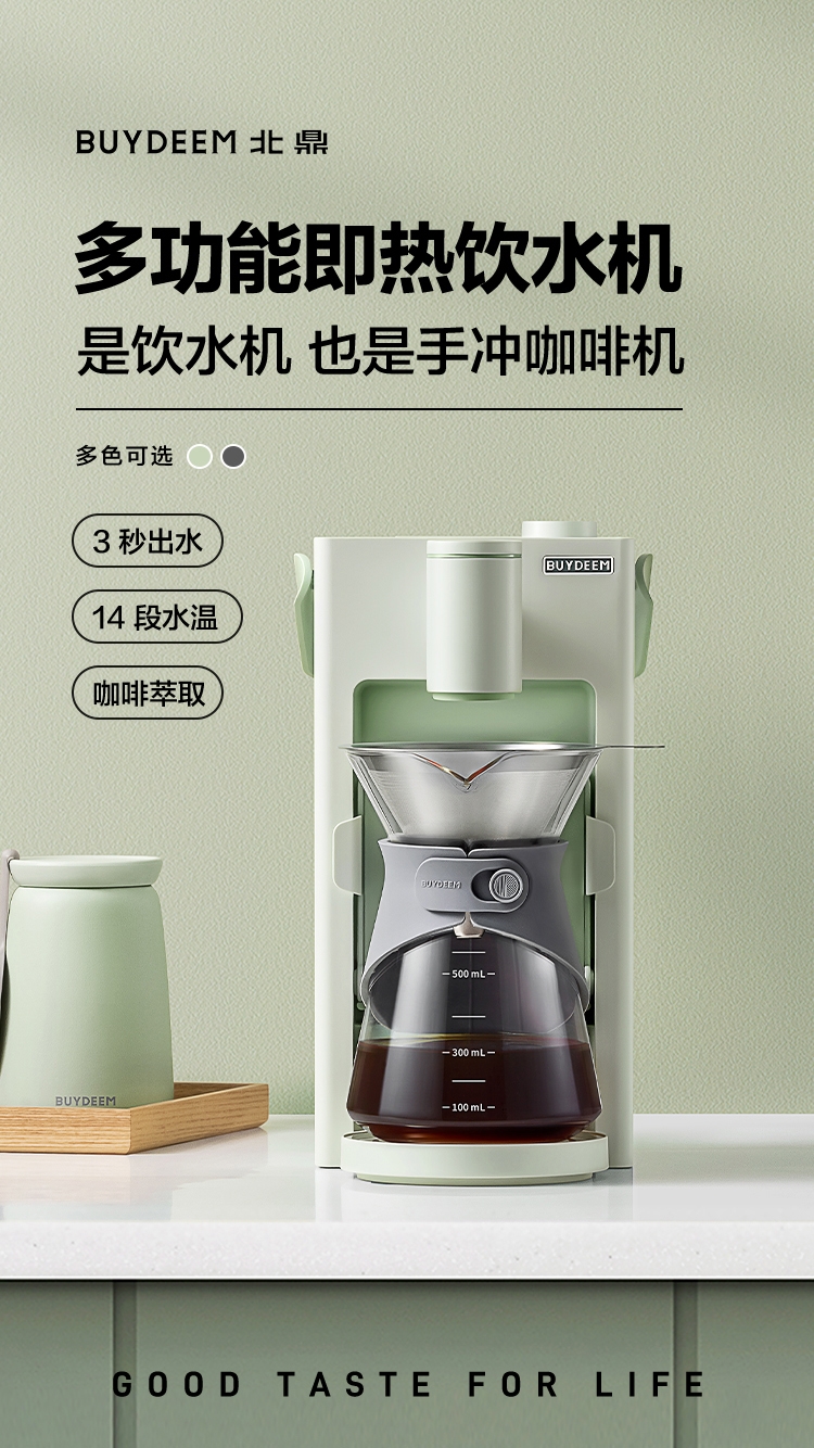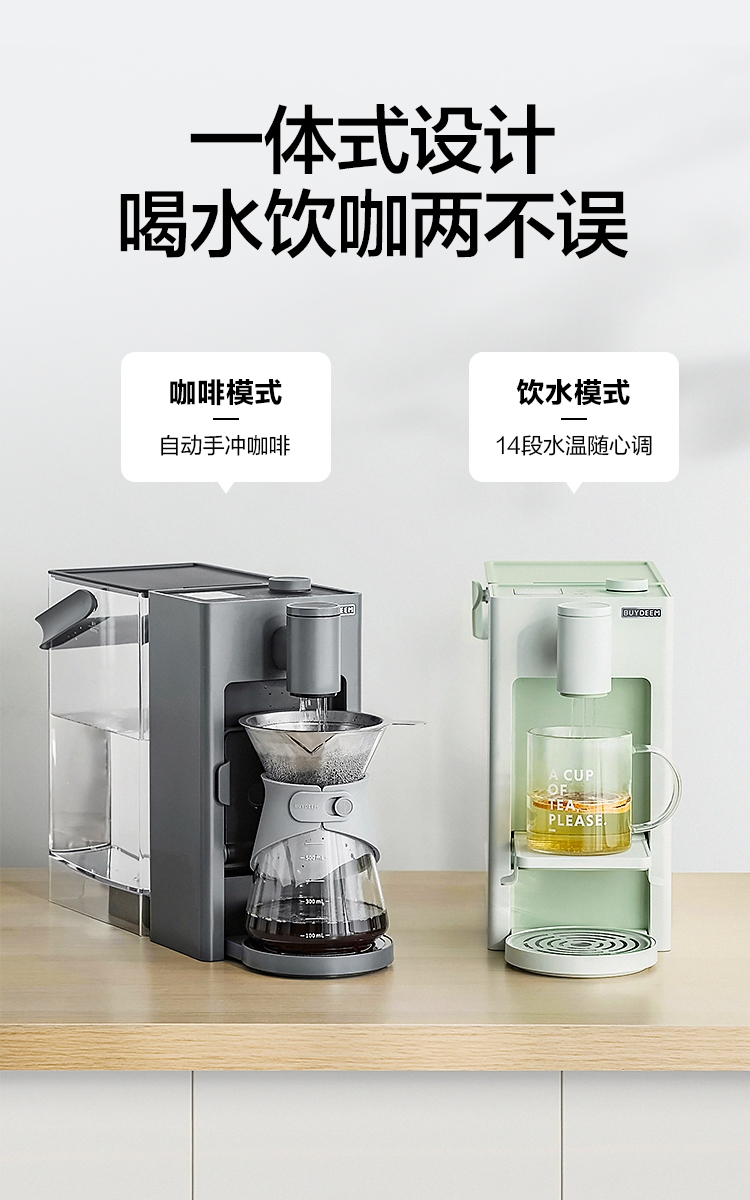 多功能一体式设计,既是饮水机,也是手冲咖啡机;专业咖啡模式,咖啡风味自定义,一键萃取;模拟手冲程序,分段式注水,五孔出水