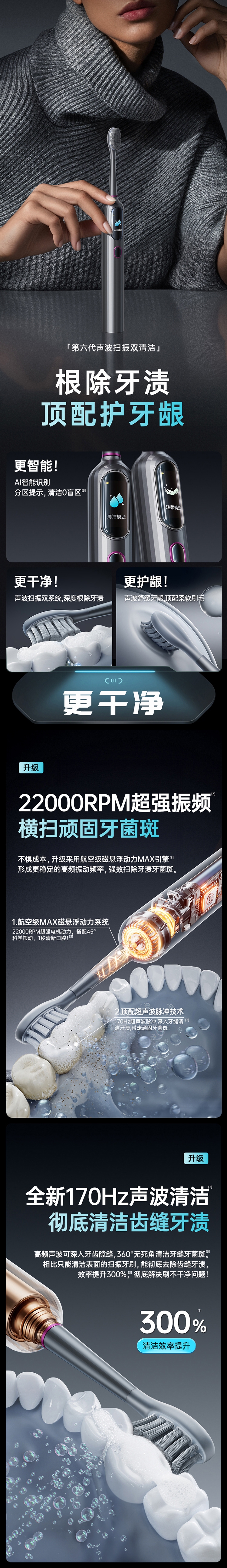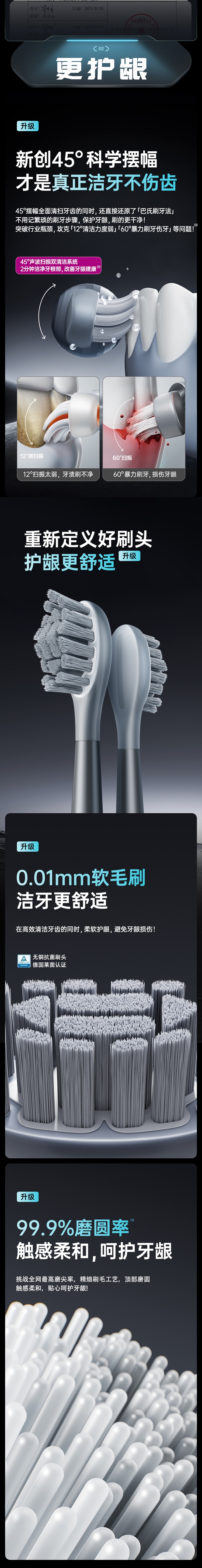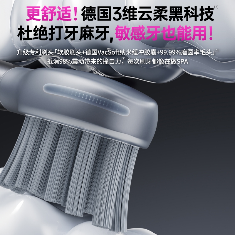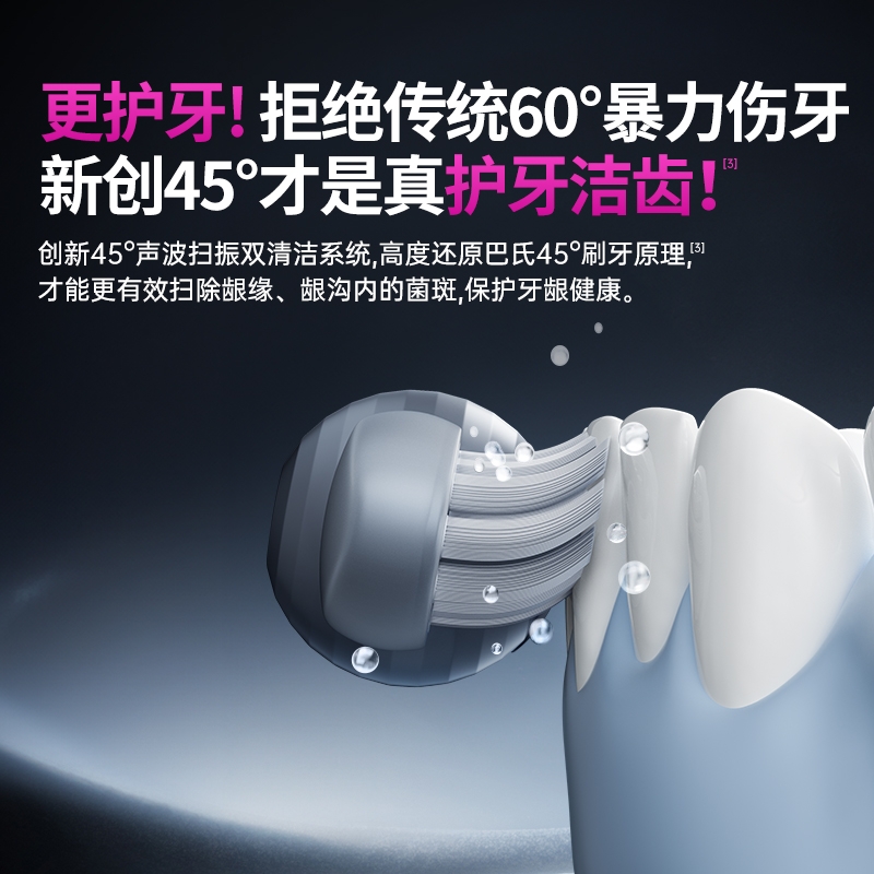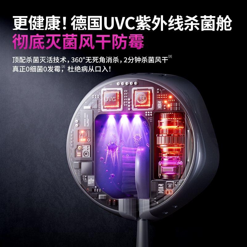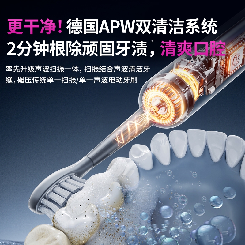 超声波智能扫振,进口刷毛,深度清洁护龈;顶配消毒仓设计,无线充电,洁净更安心;一级洁净认证,自动美白,送礼自用都合适