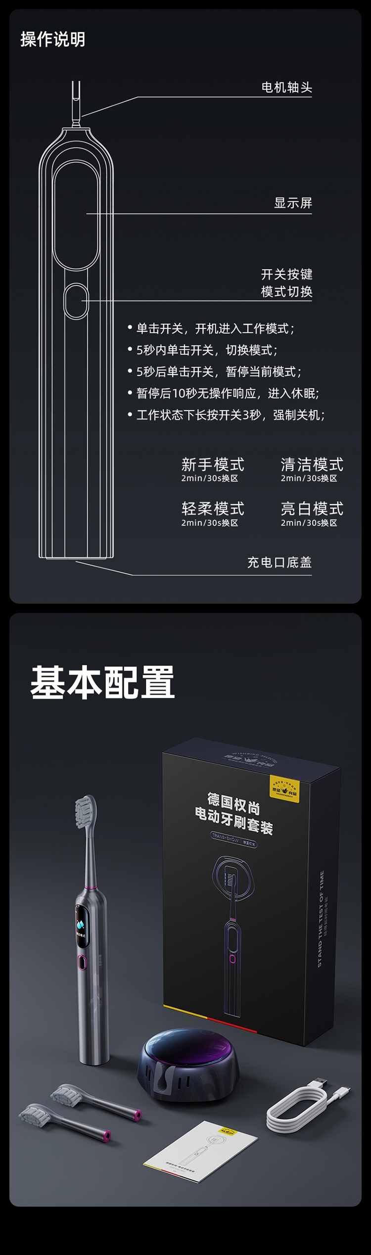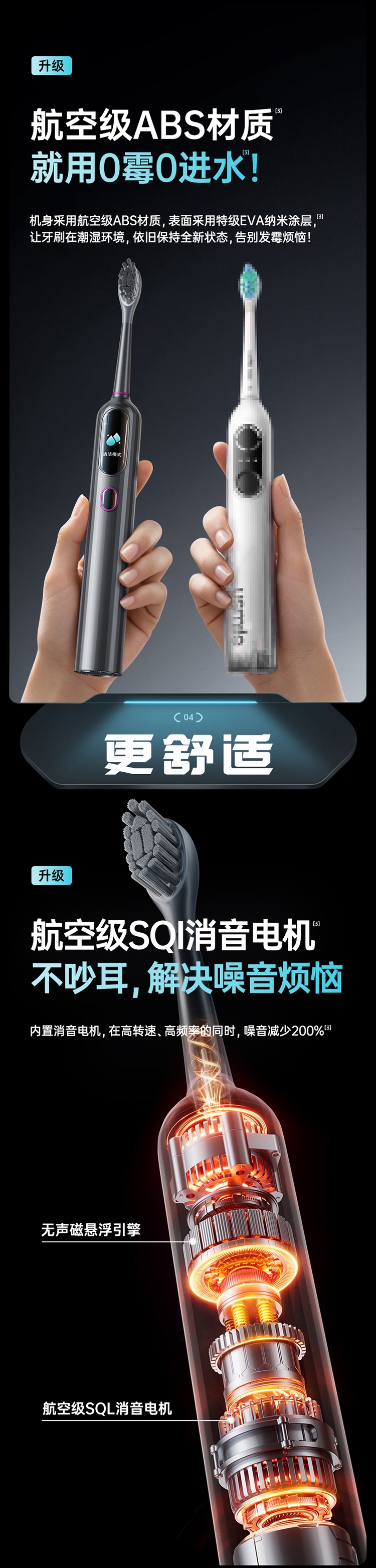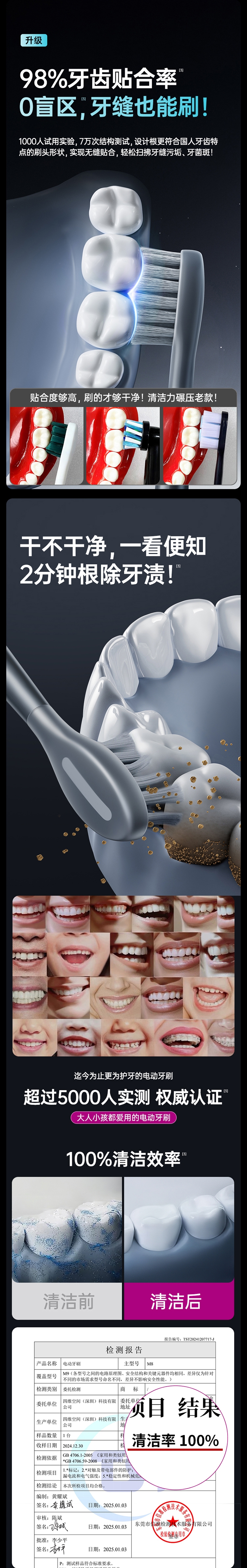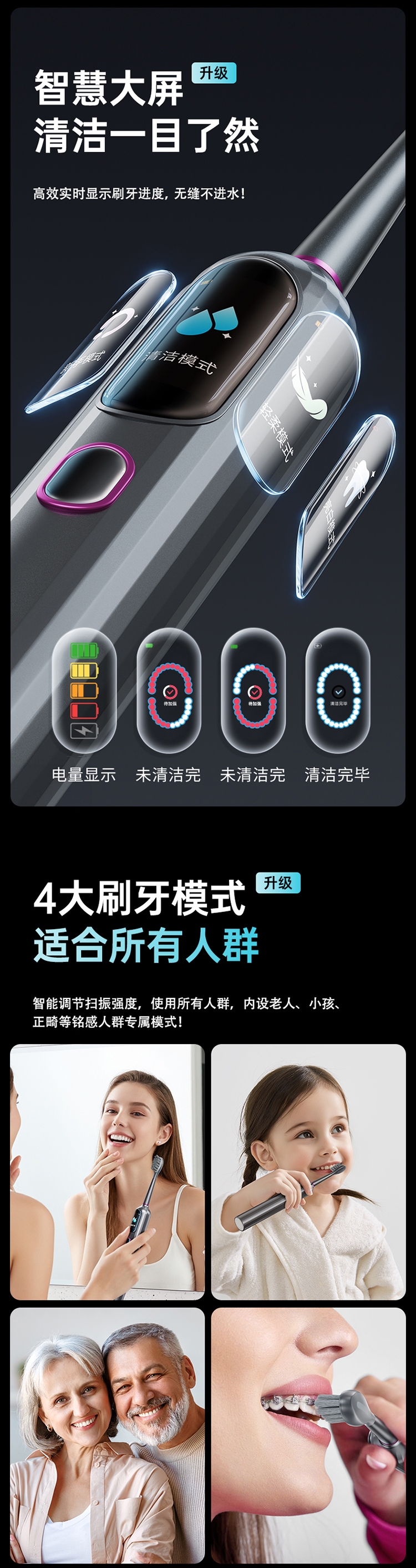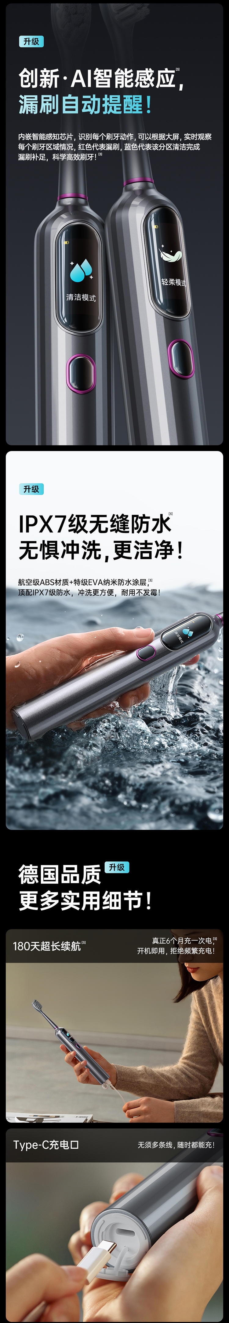 超声波智能扫振,进口刷毛,深度清洁护龈;顶配消毒仓设计,无线充电,洁净更安心;一级洁净认证,自动美白,送礼自用都合适