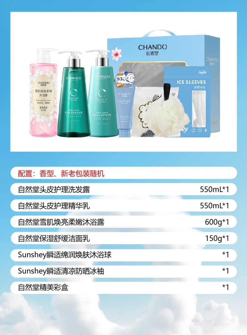 配置清单:自然堂头皮护理洗发露550mL*1 自然堂头皮护理精华乳550mL*1 自然堂雪肌焕亮柔嫩沐浴露600g*1 自然堂保湿舒缓洁面乳150g*1 Sunshey瞬适绵润焕肤沐浴球*1 Sunshey瞬适清凉防晒冰袖*1 自然堂精美彩盒*1