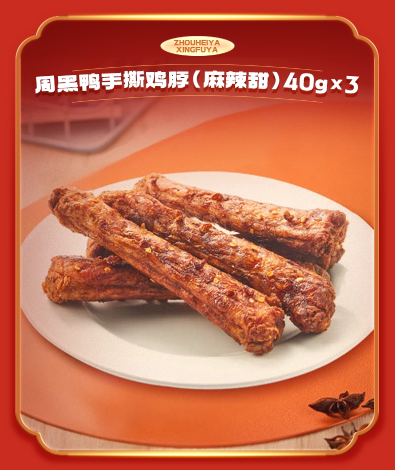配置清单:周黑鸭手撕鸡脖(麻辣甜)40g*3 周黑鸭麻辣鸡丝60g 周黑鸭甜辣鸭脖60g 周黑鸭甜辣鸭锁骨62g 周小伴麻辣豆皮60g 丫丫椰鲜萃粉椰水400g