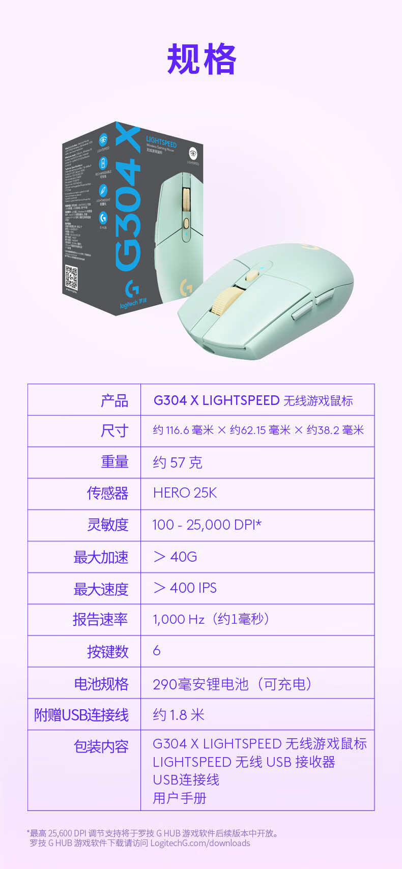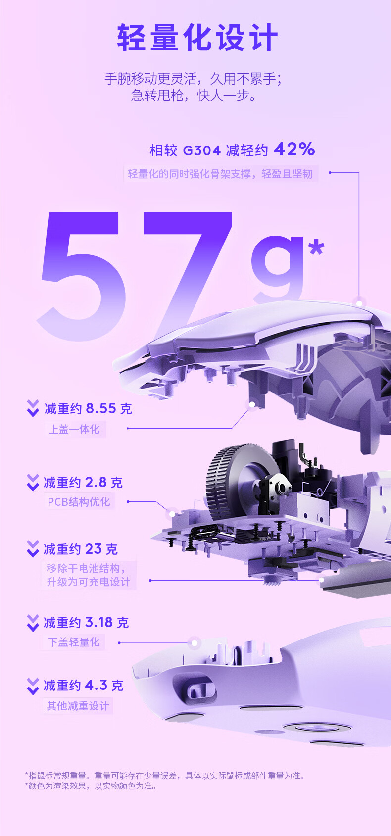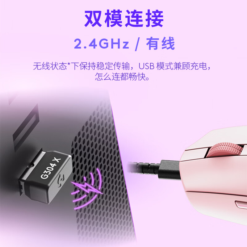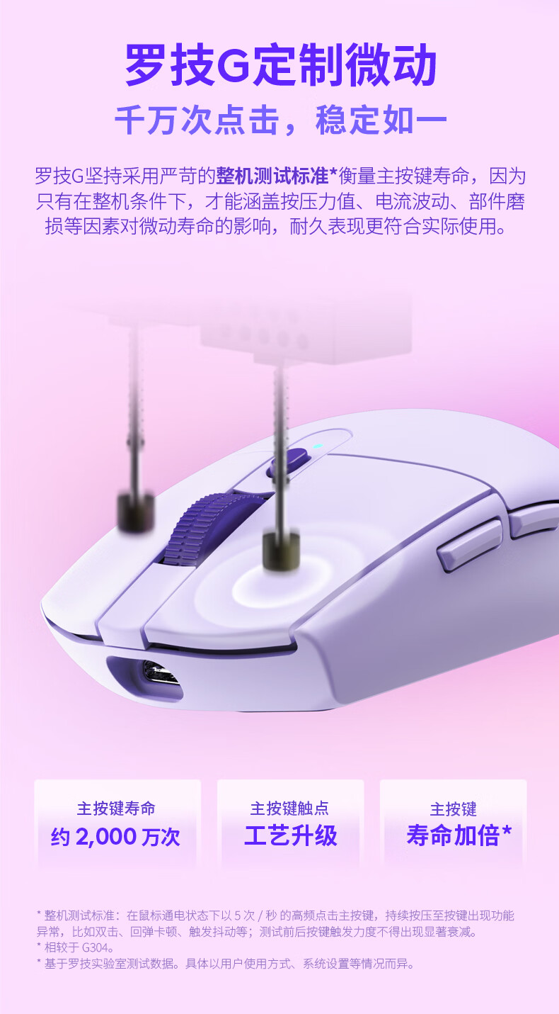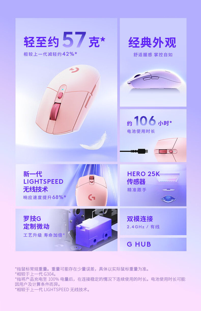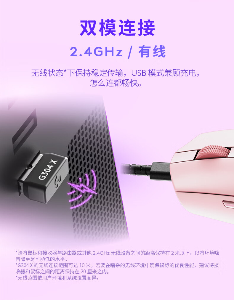 轻至约57g;罗技G定制微动;双模连接,2.4GHz/有线