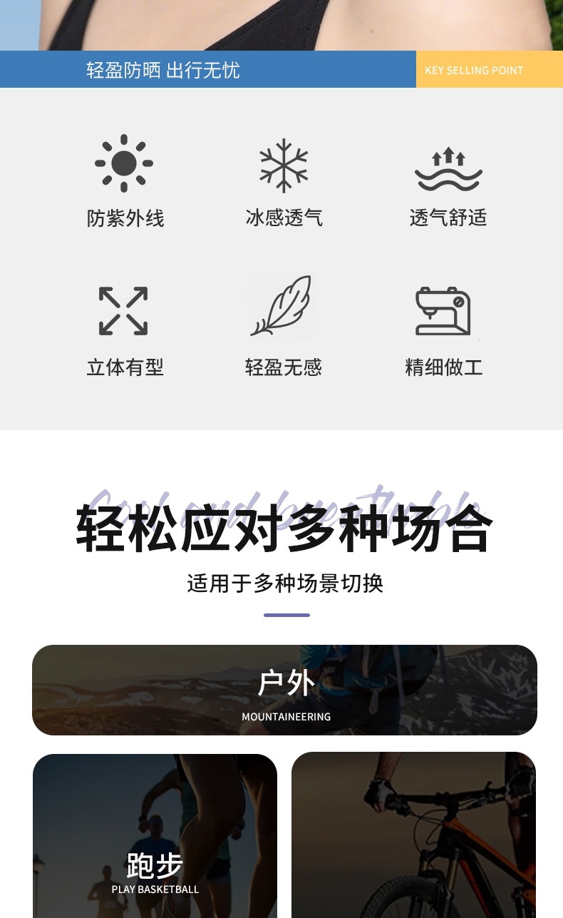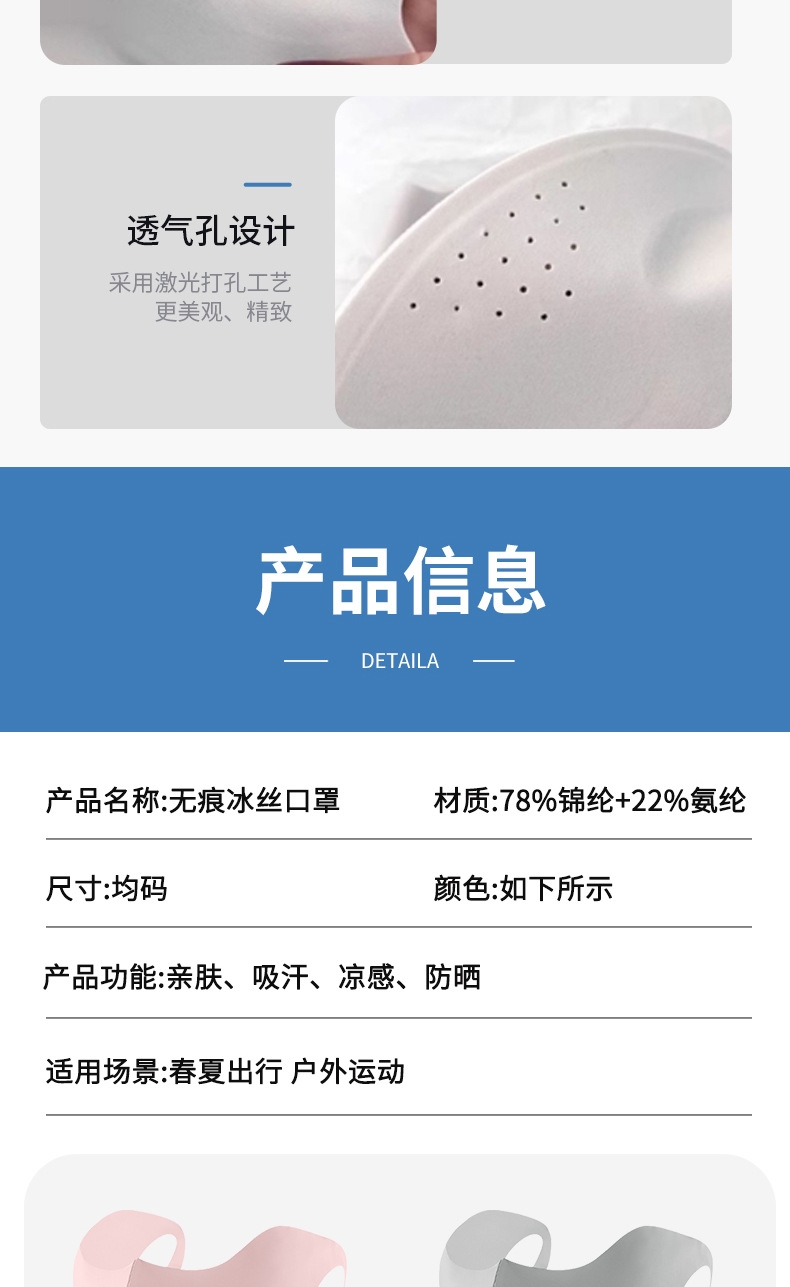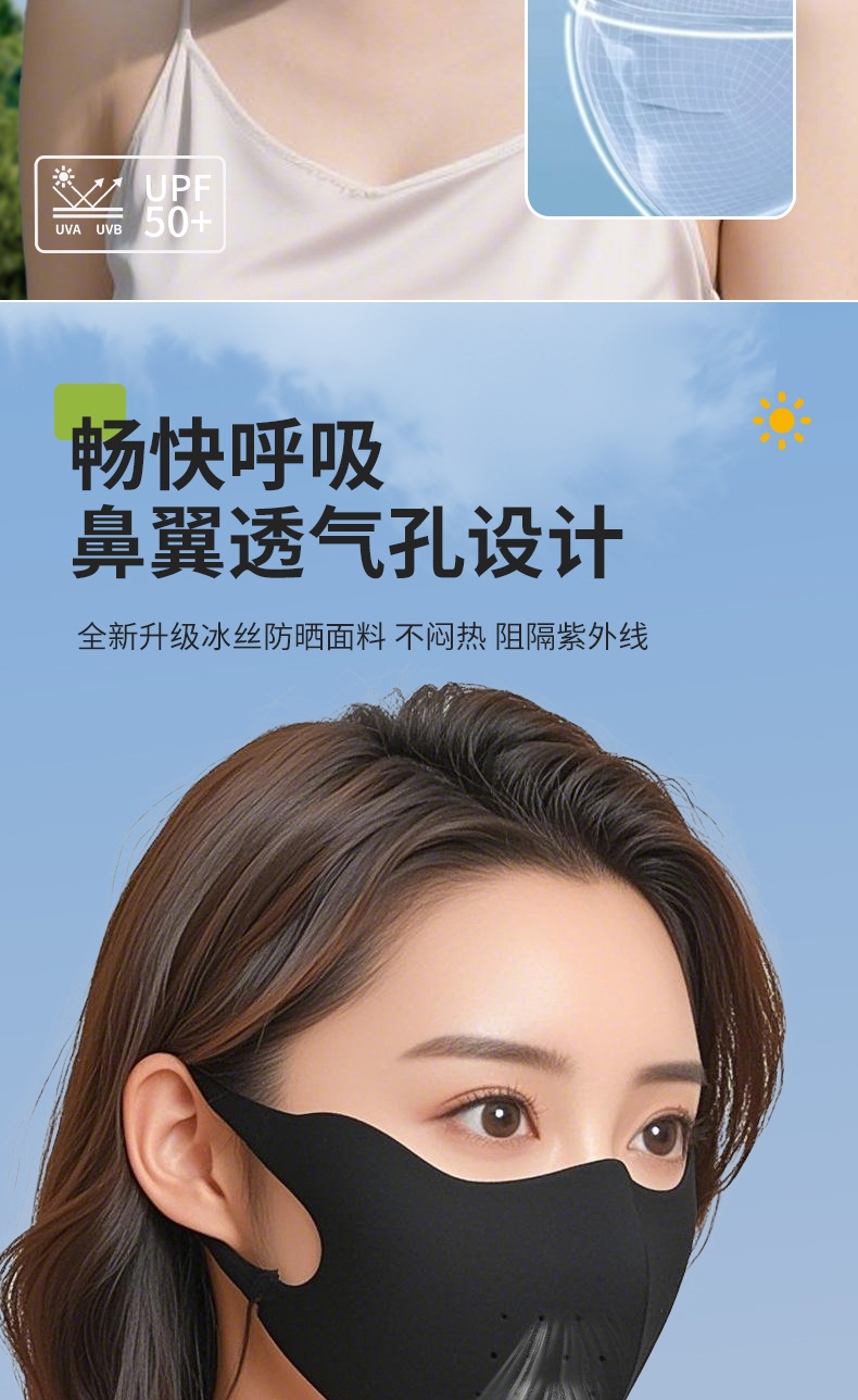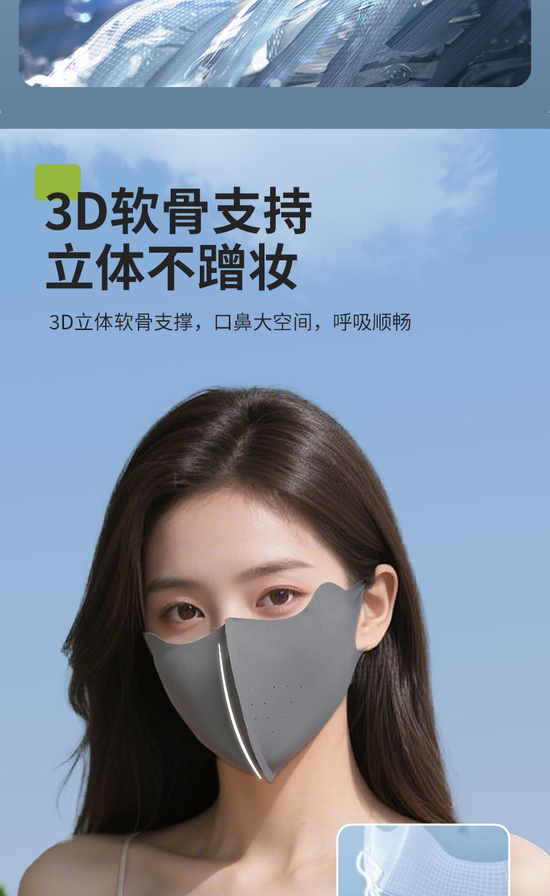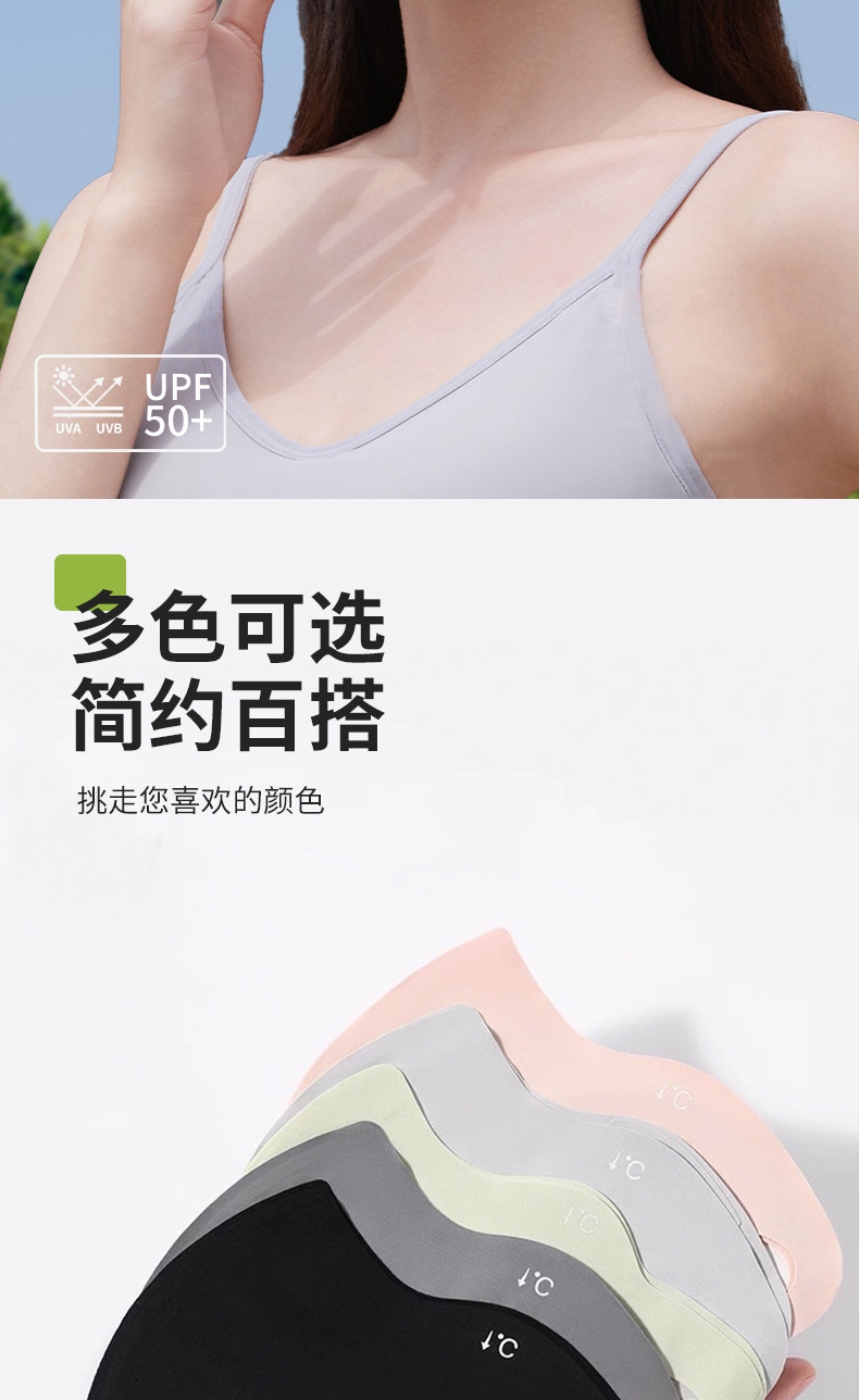 升级可调节耳绳设计,不勒耳朵 无痕裁剪,亲肤柔软;新升级平鱼骨支撑新工艺,不易开裂,更耐用;采用锦纶科技凉感防晒面料制作,凉感透气性更好