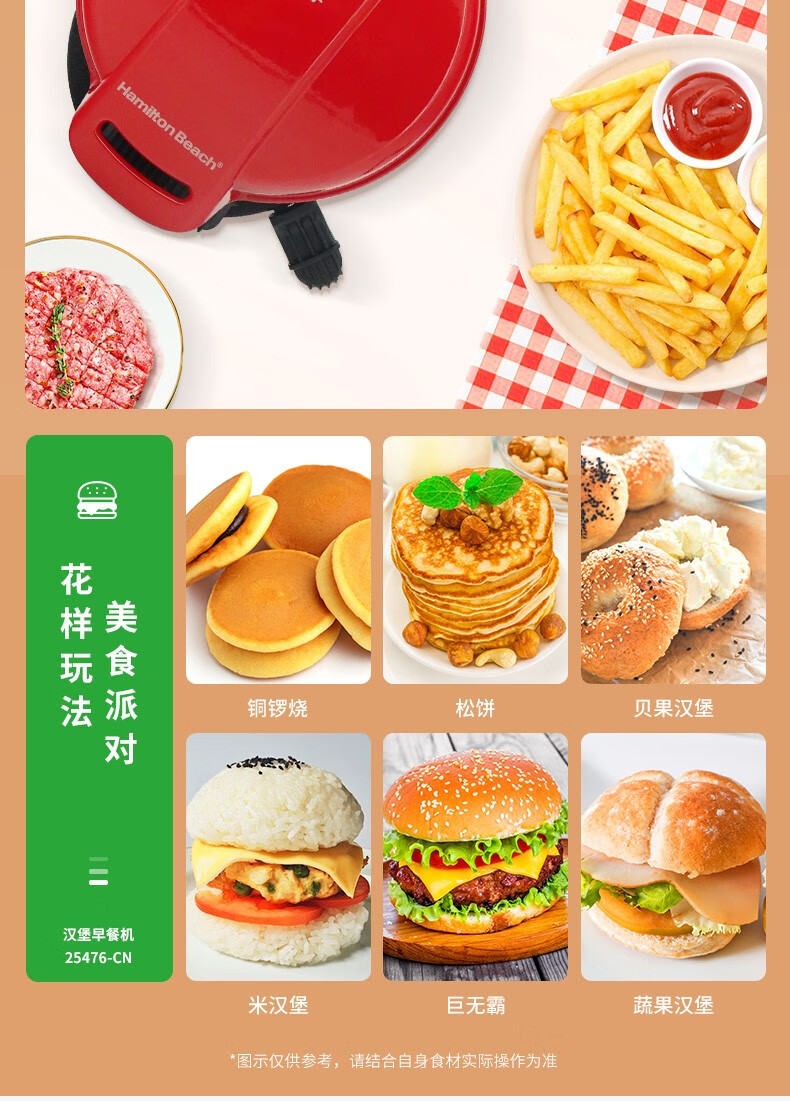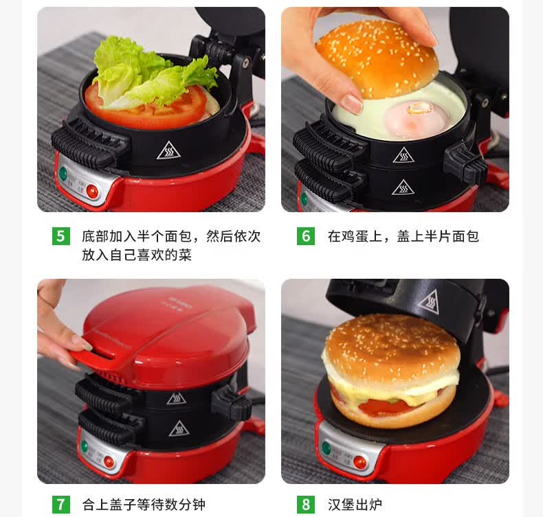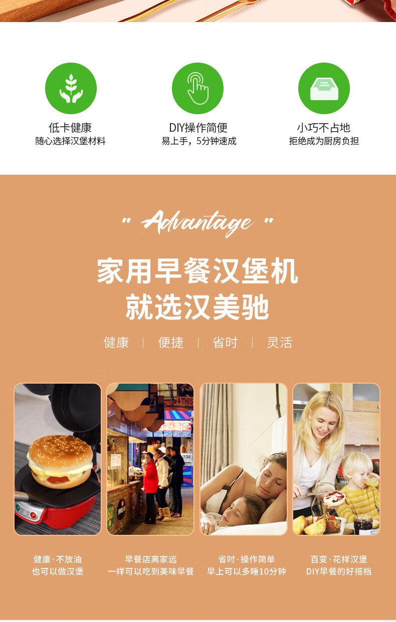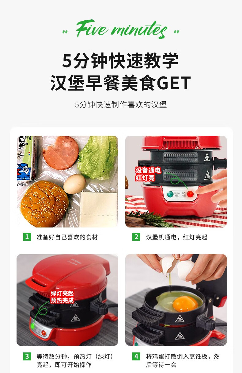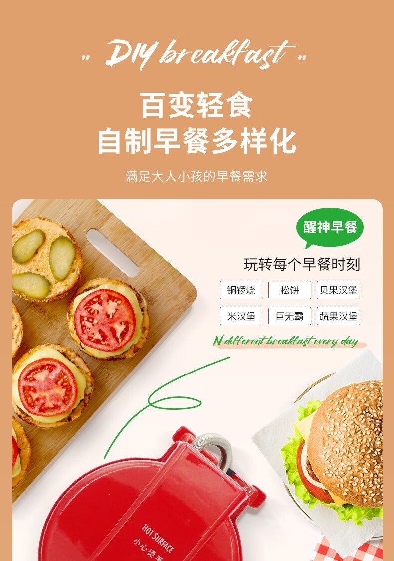 准备早餐,只须5分钟;自选食材,安全健康;操作简单,有趣好玩;不粘设计,轻松清洗;小巧机身,方便储藏